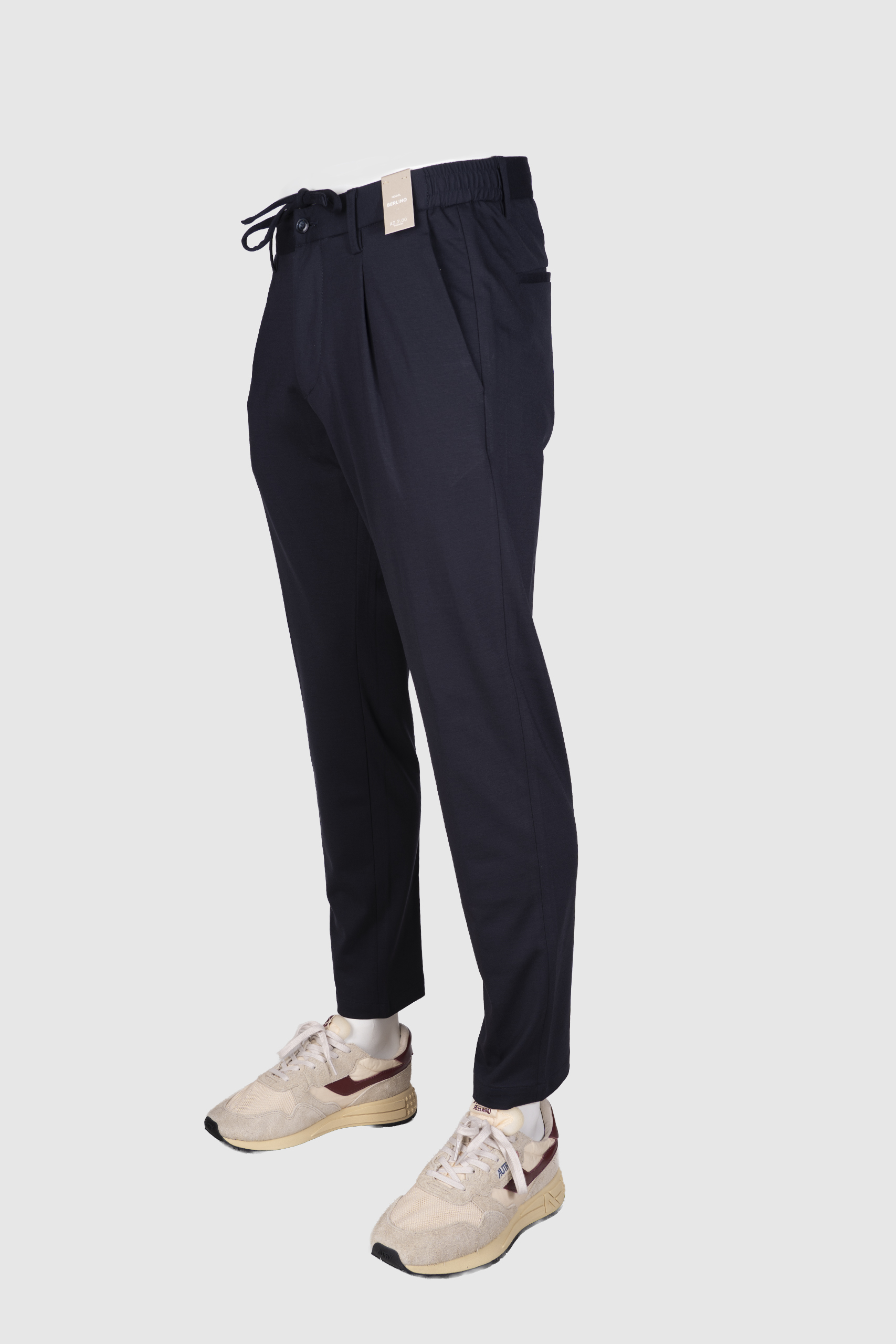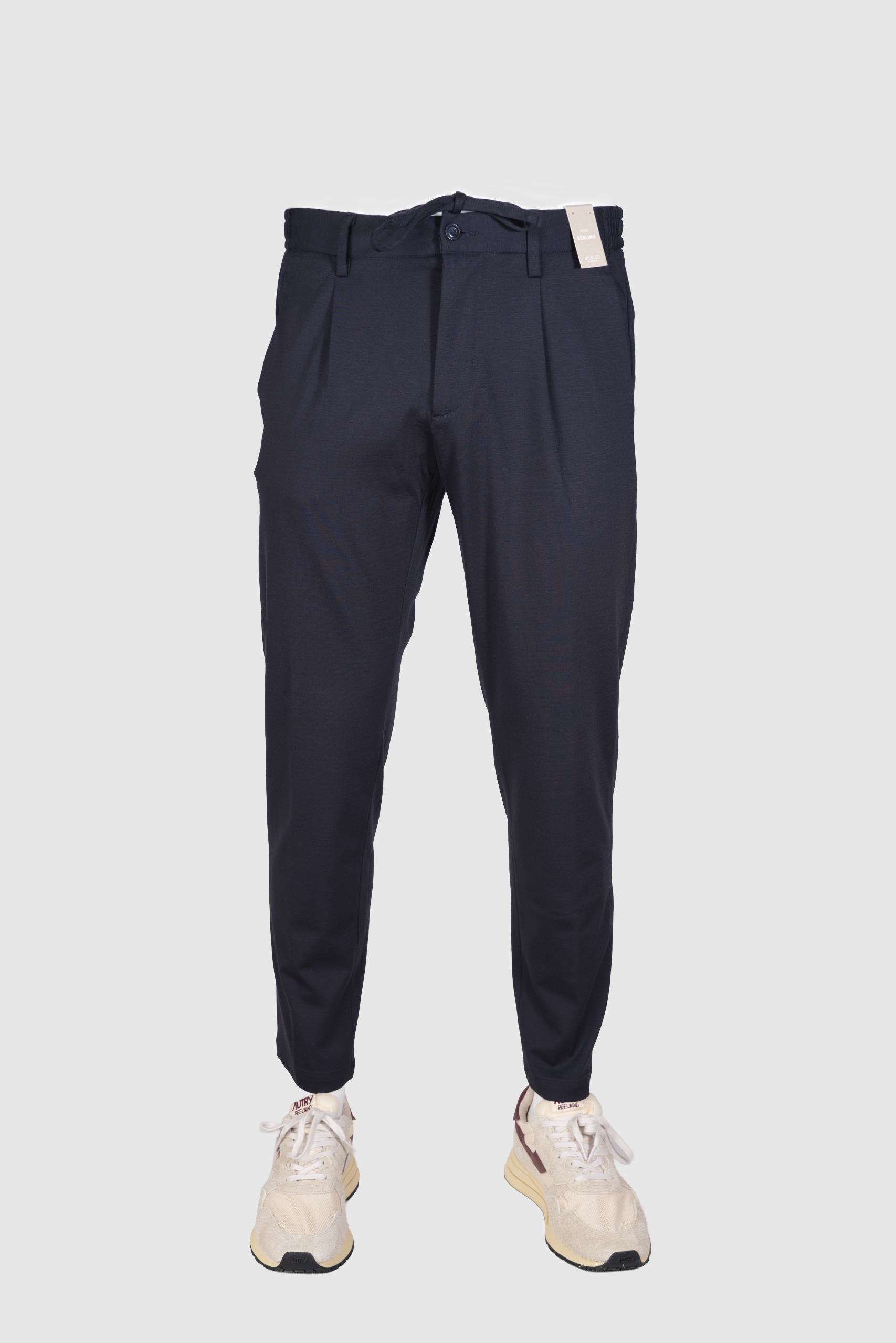 Pantalón jersey 60% rayon 33% poliamida 7% elastane con pinza matada, cinturilla con gomas laterales para dar más confort, vestibilidad regular fit y ancho de bocas a 17cm.