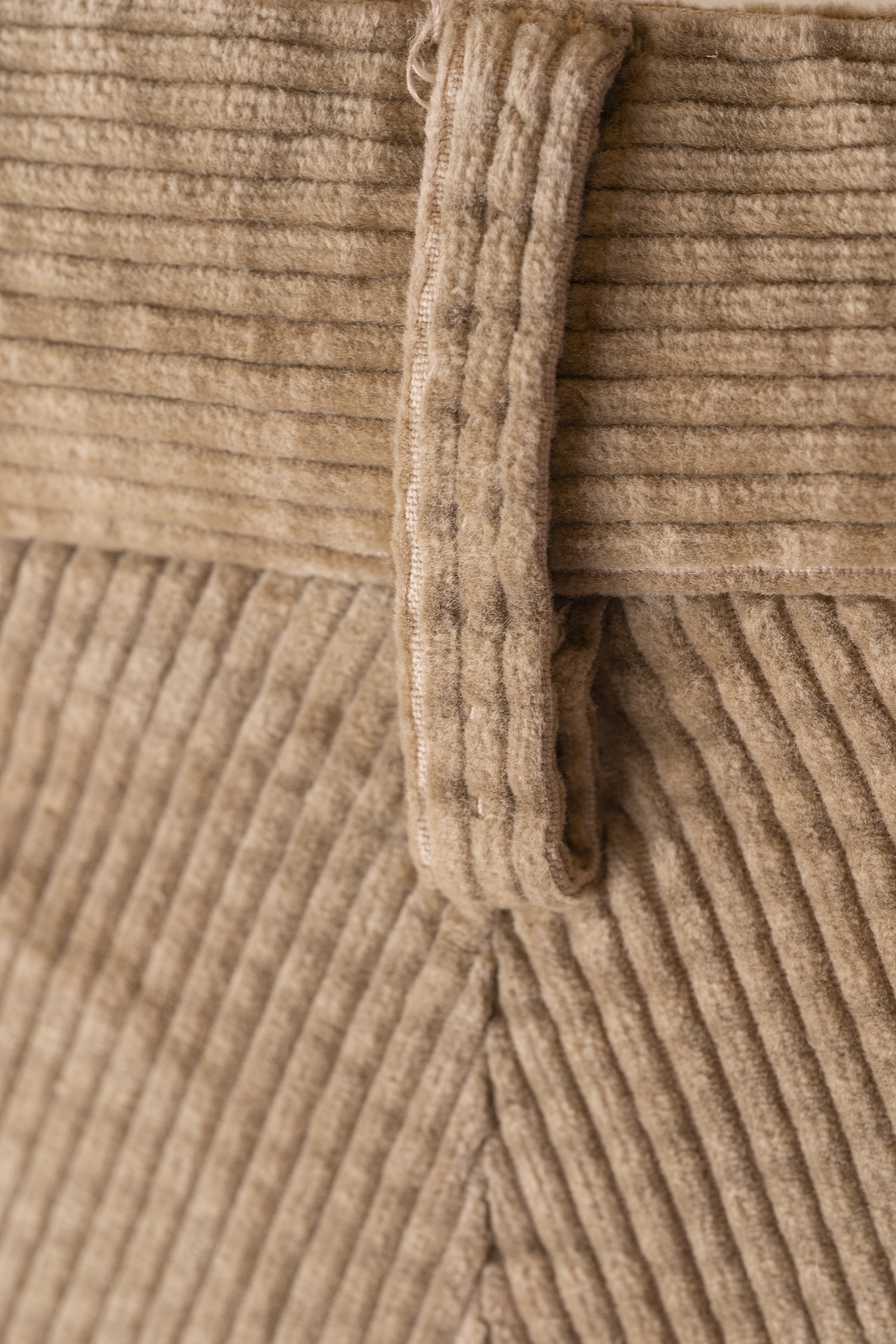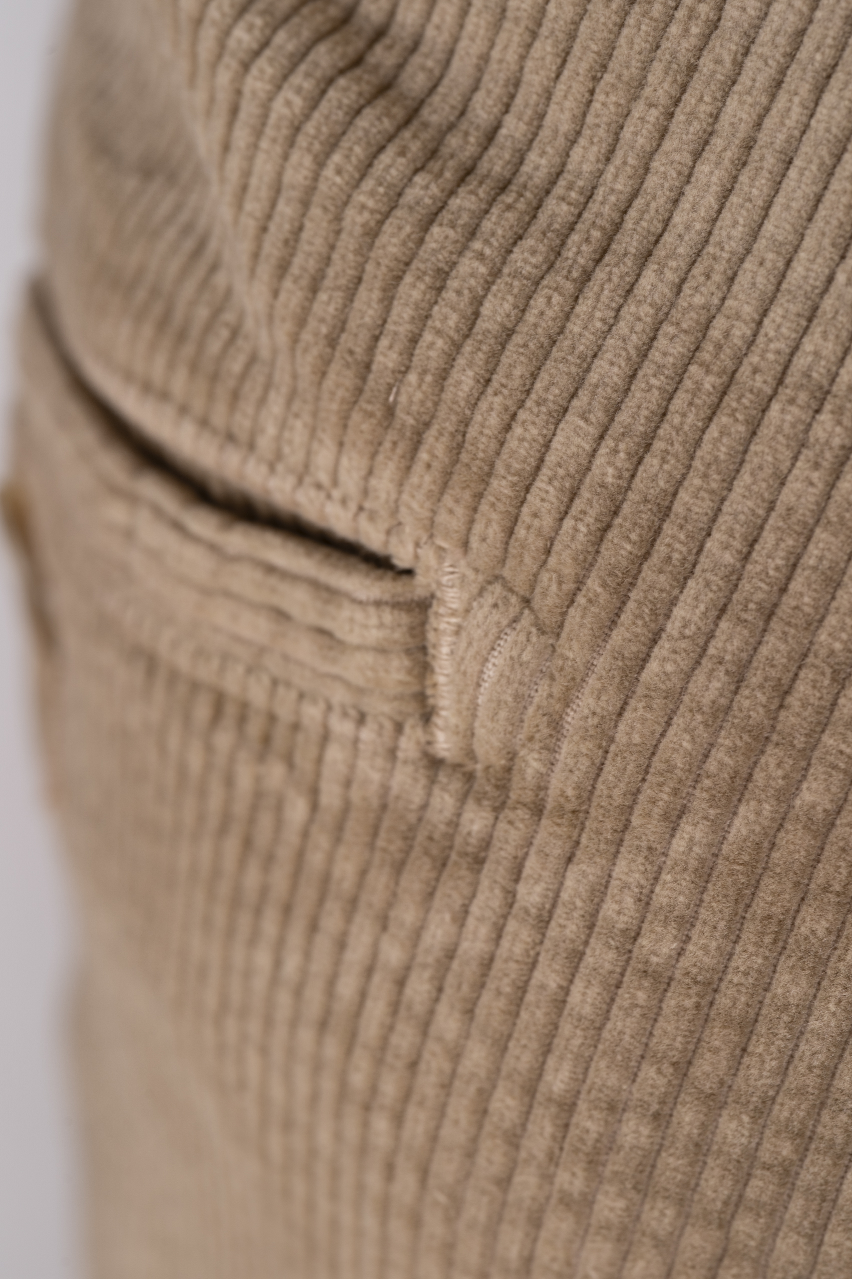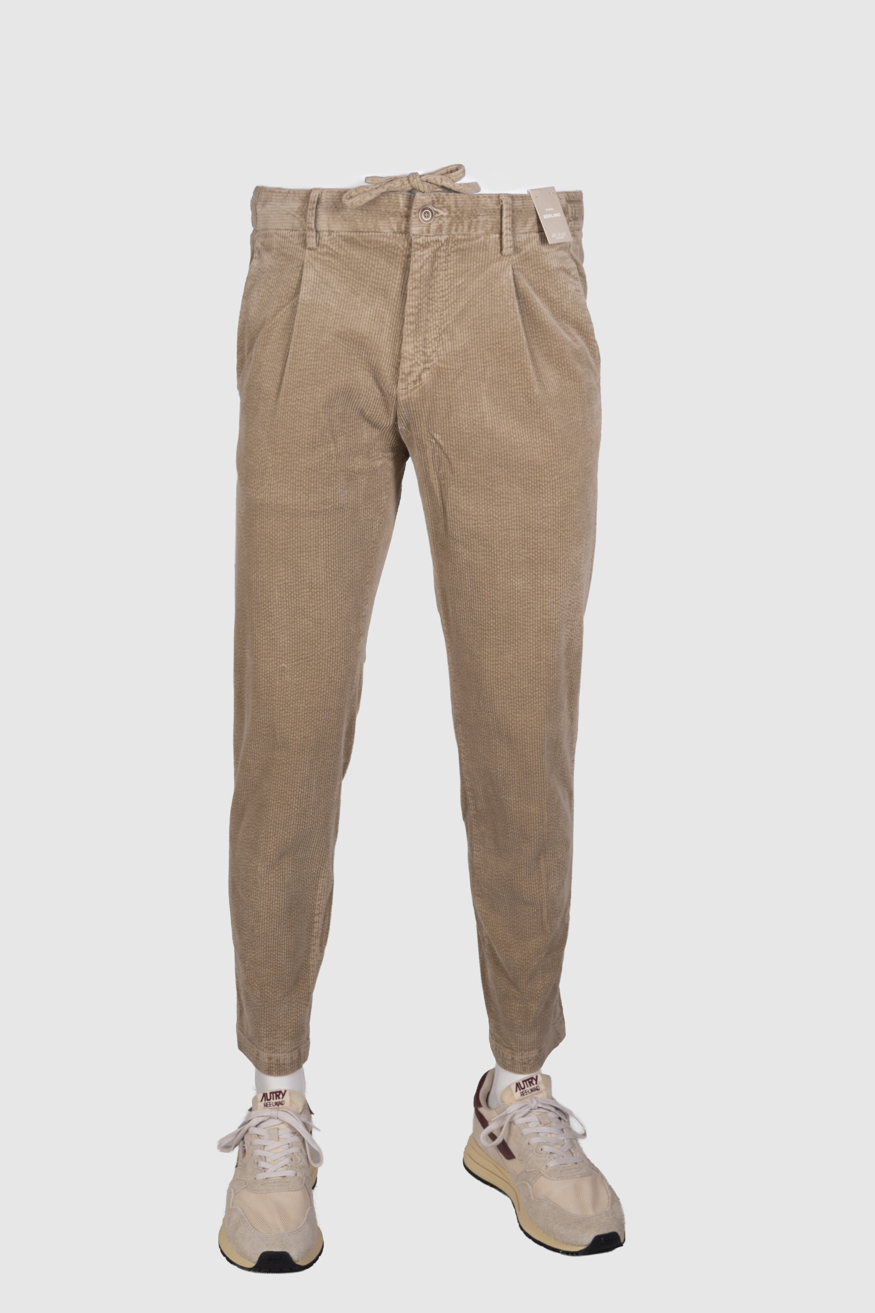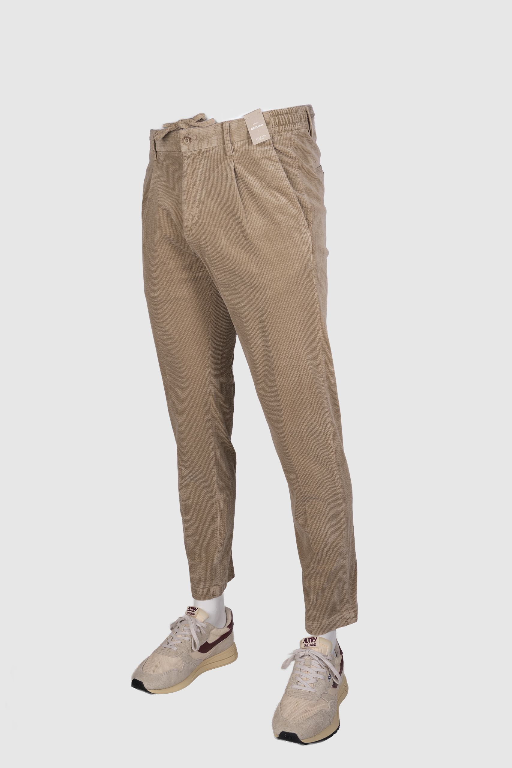 Pantalón de pana de 80% algodón 18% viscosa 2% elastane con pinza matada, cinturilla con gomas laterales para dar mas confort, vestibilidad regular fit y ancho de bocas a 17cm.