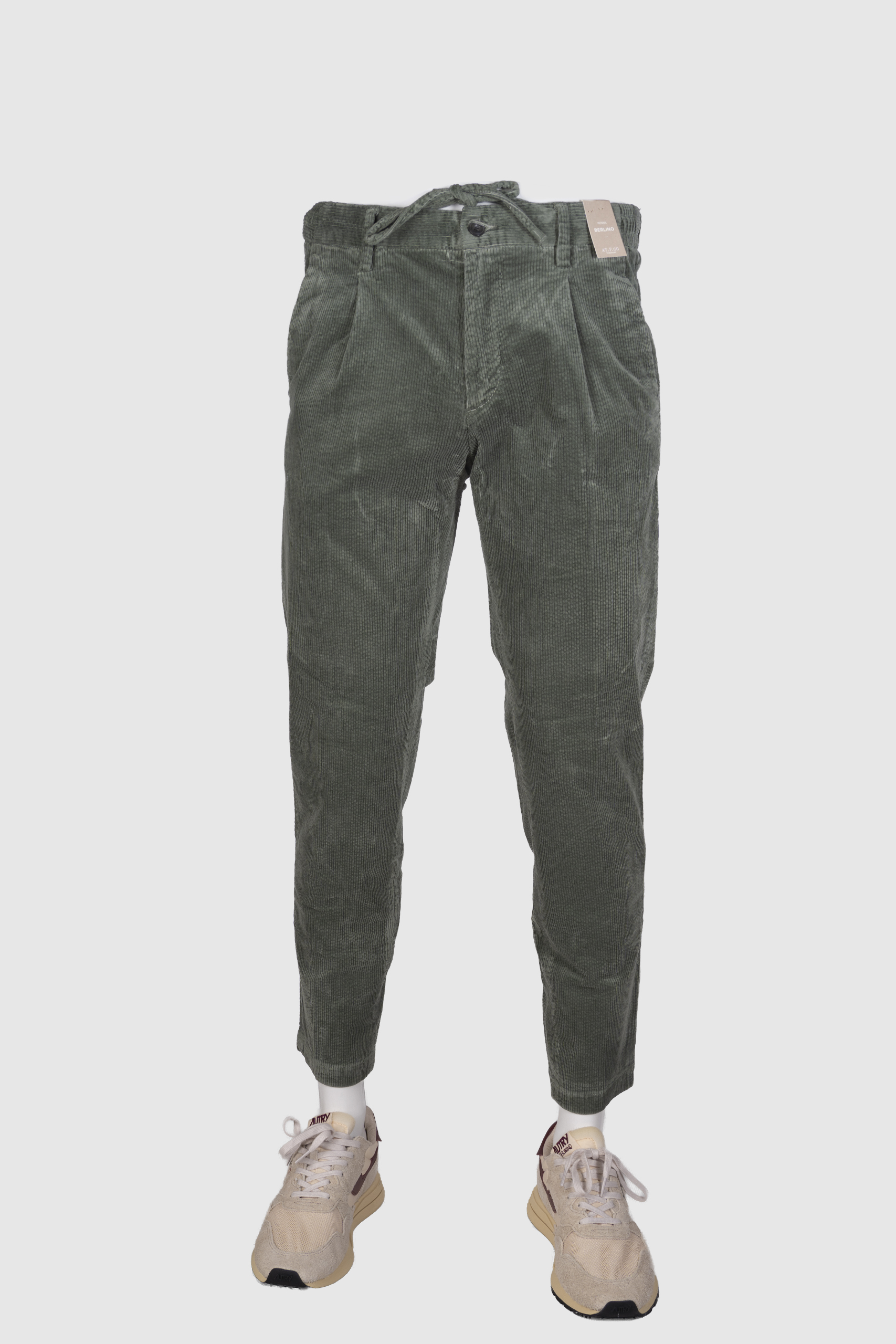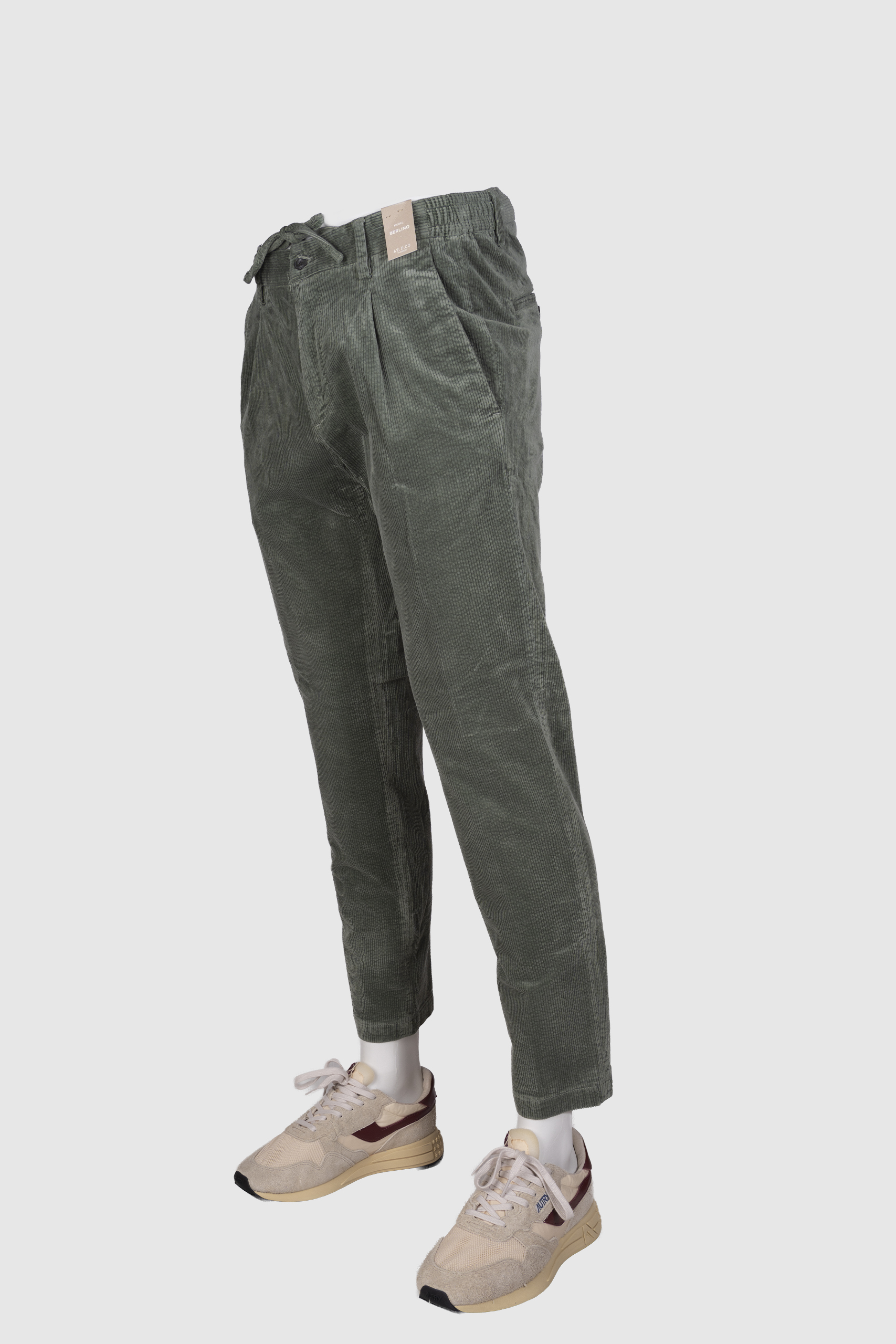 Pantalón de pana de 80% algodón 18% viscosa 2% elastane con pinza matada, cinturilla con gomas laterales para dar mas confort, vestibilidad regular fit y ancho de bocas a 17cm.