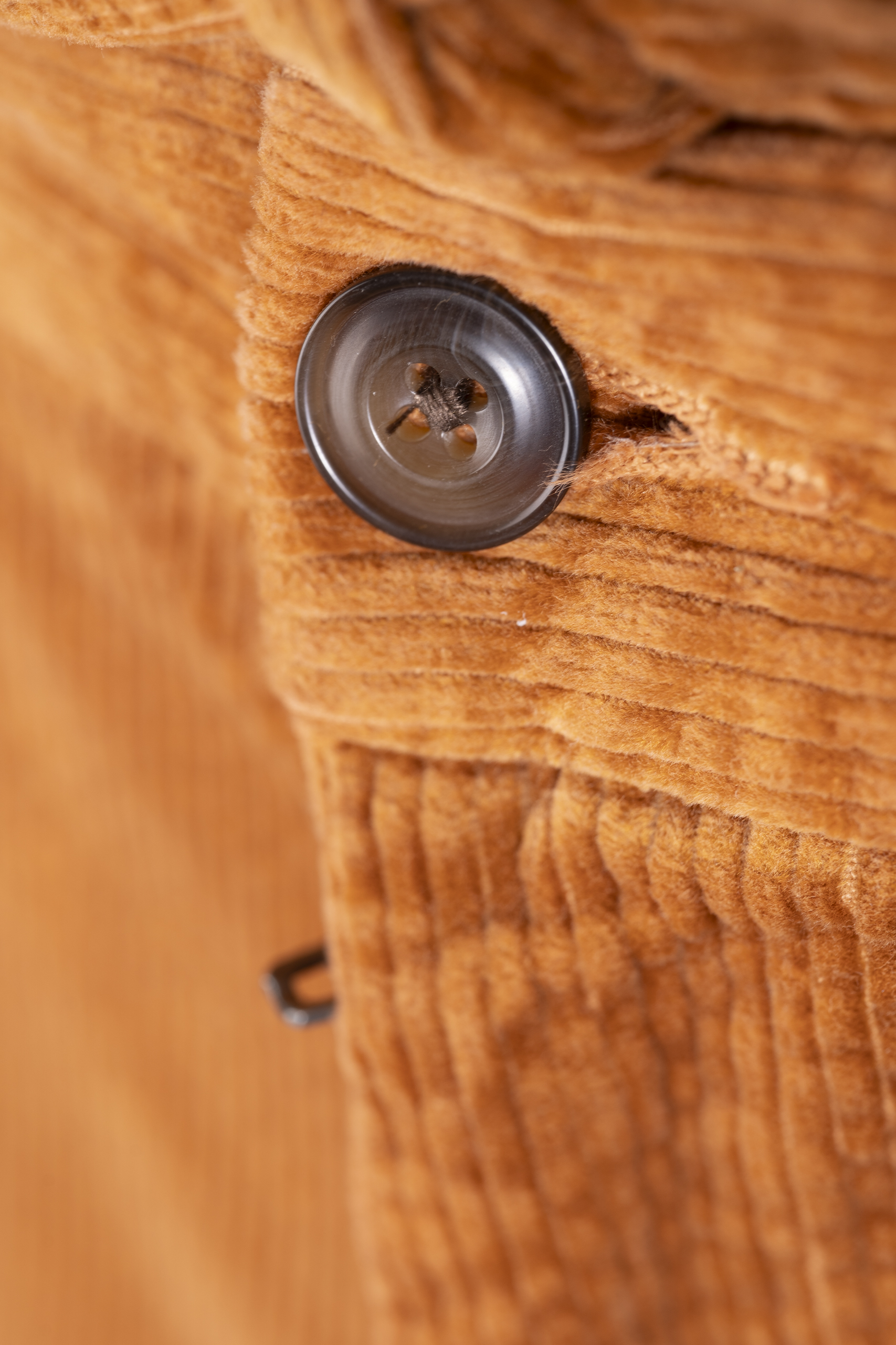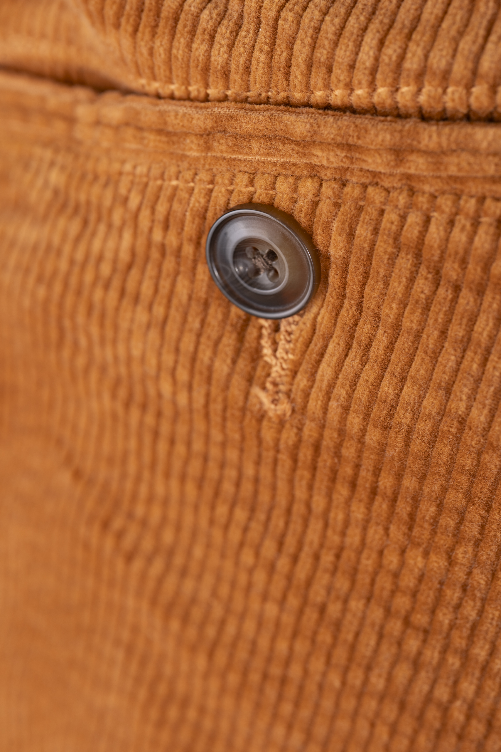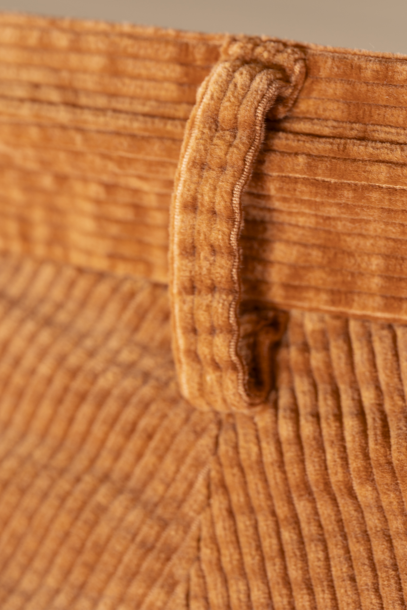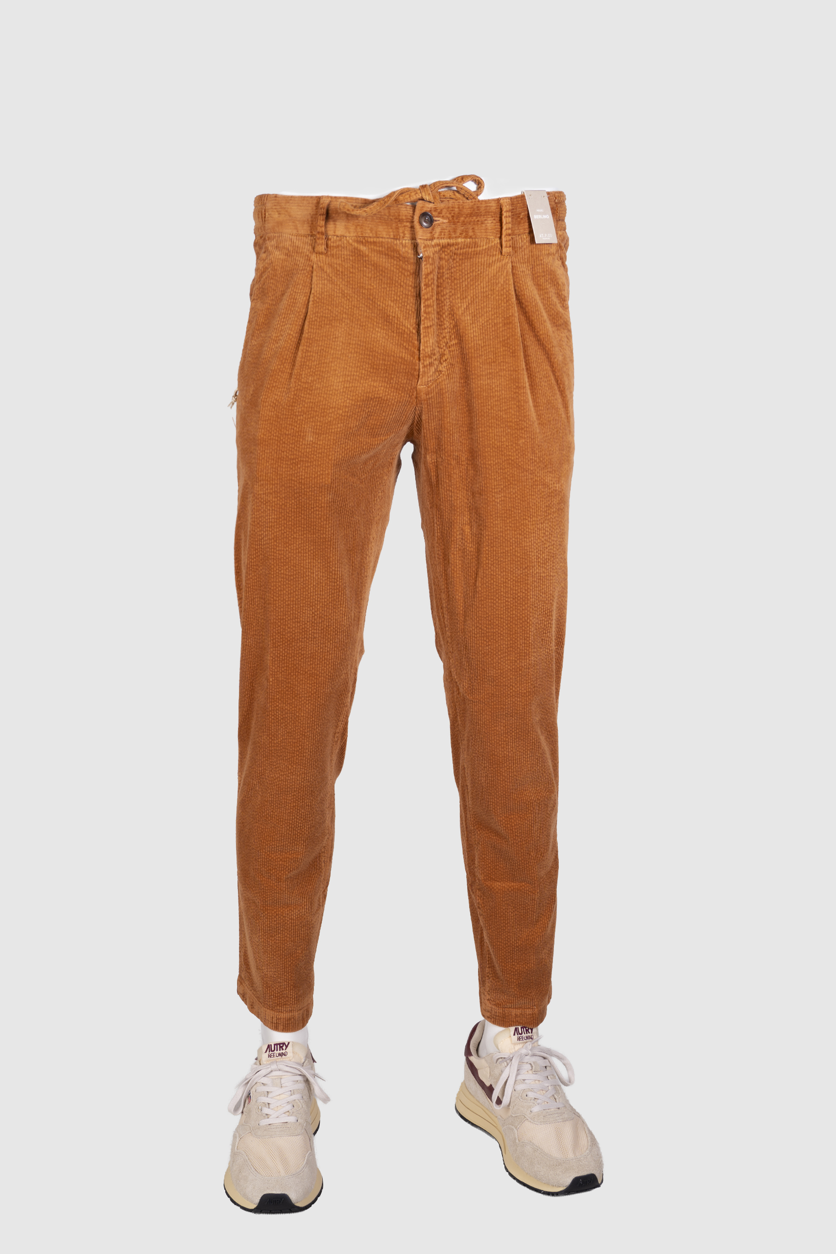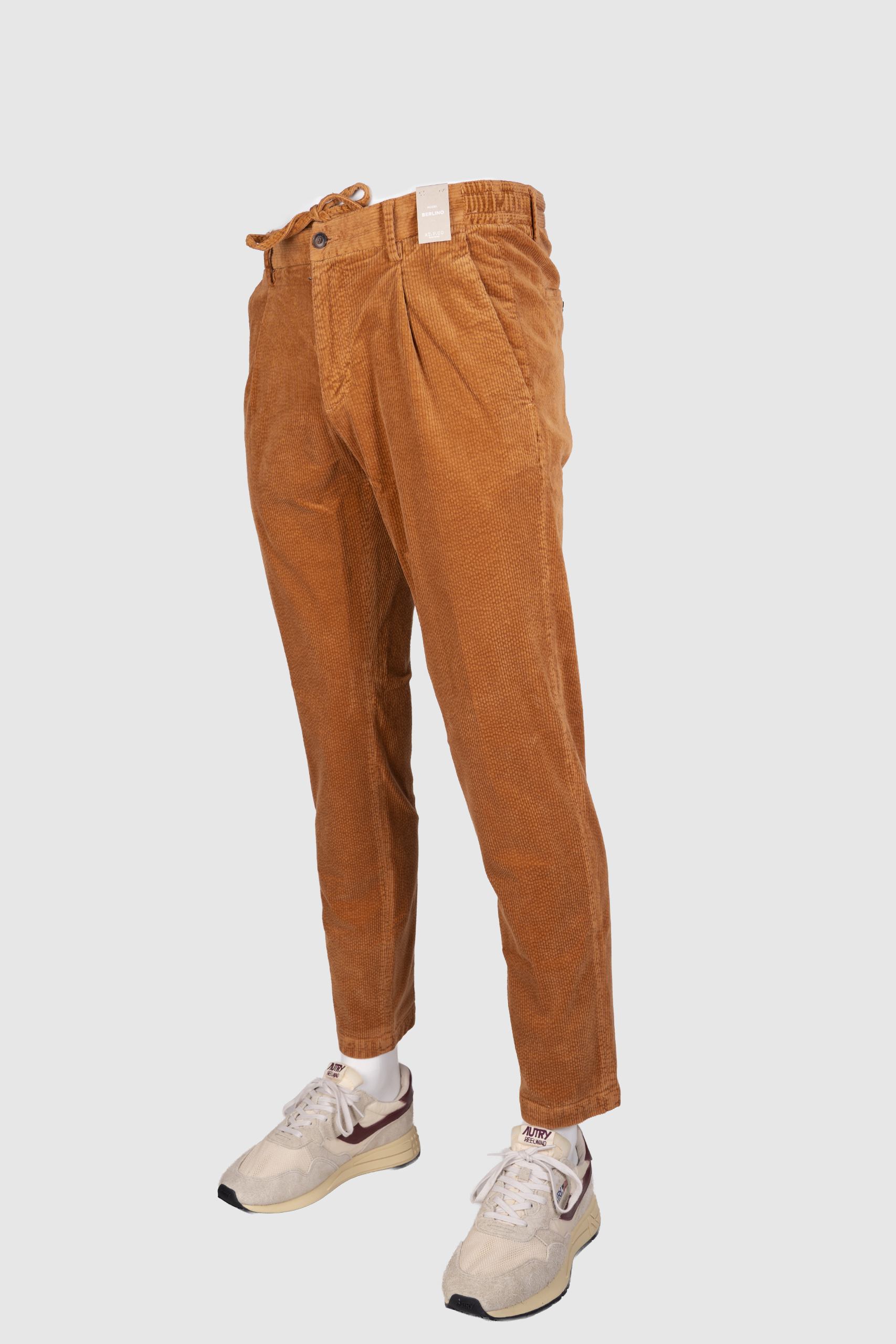 Pantalón de pana de 80% algodón 18% viscosa 2% elastane con pinza matada, cinturilla con gomas laterales para dar mas confort, vestibilidad regular fit y ancho de bocas a 17cm.