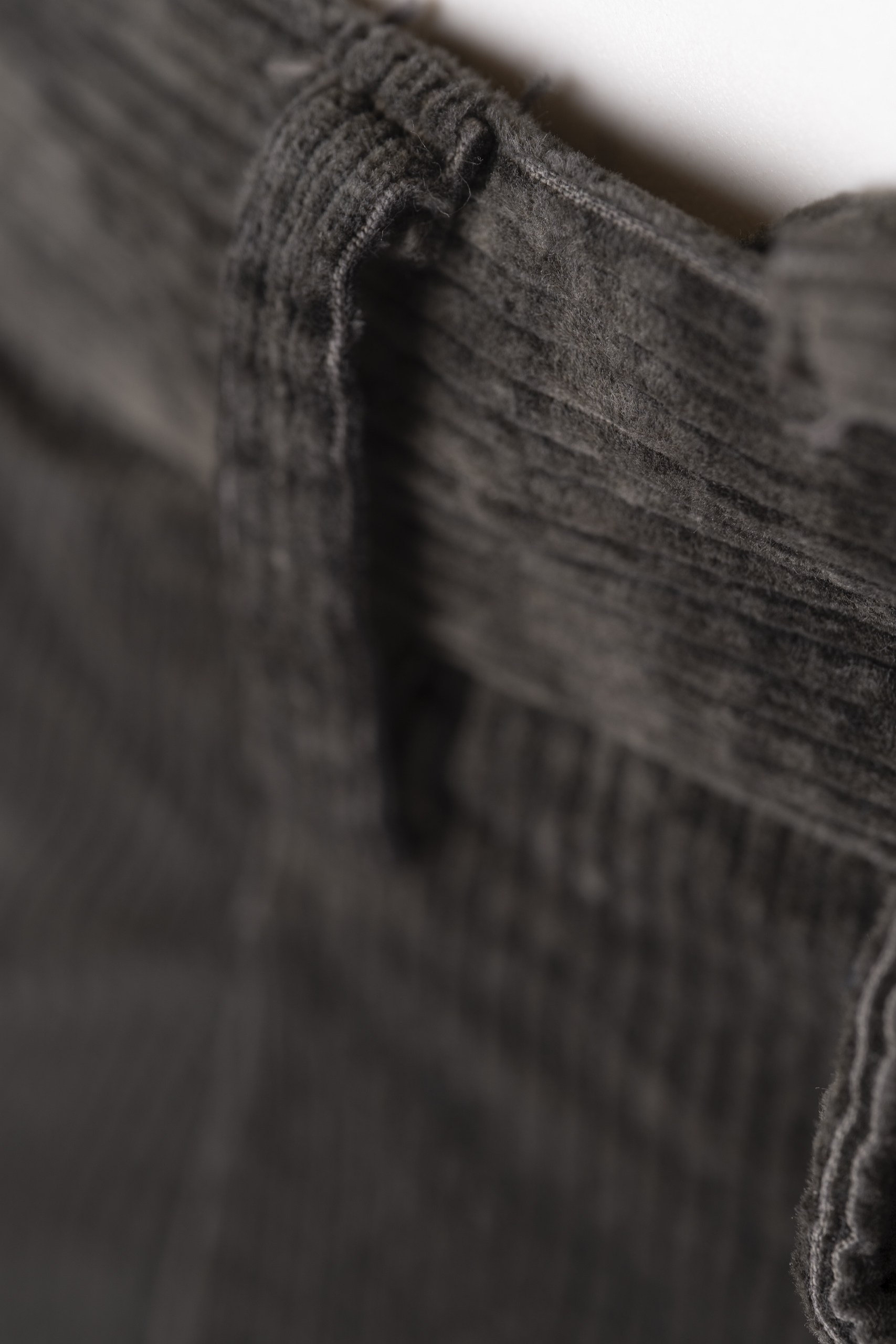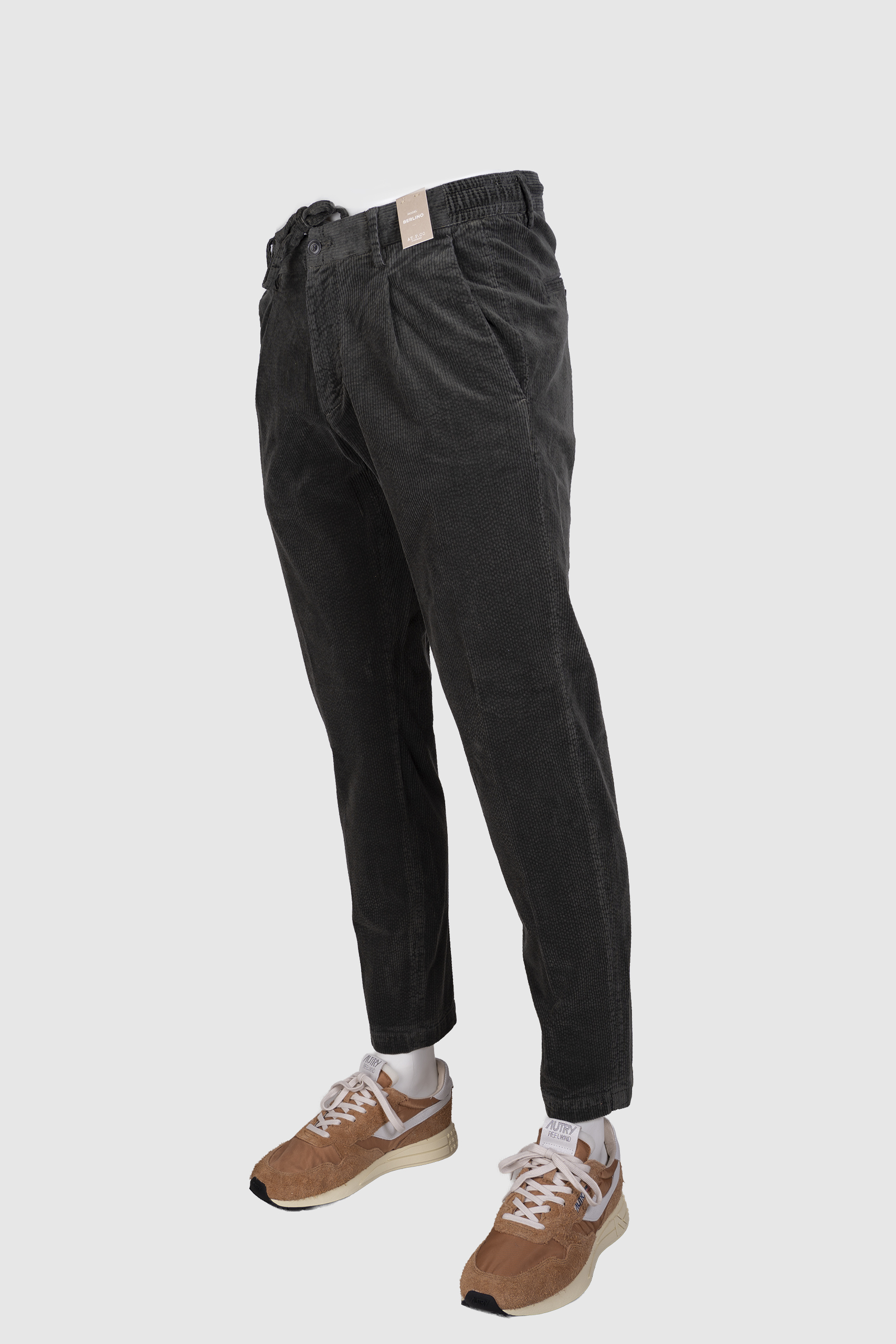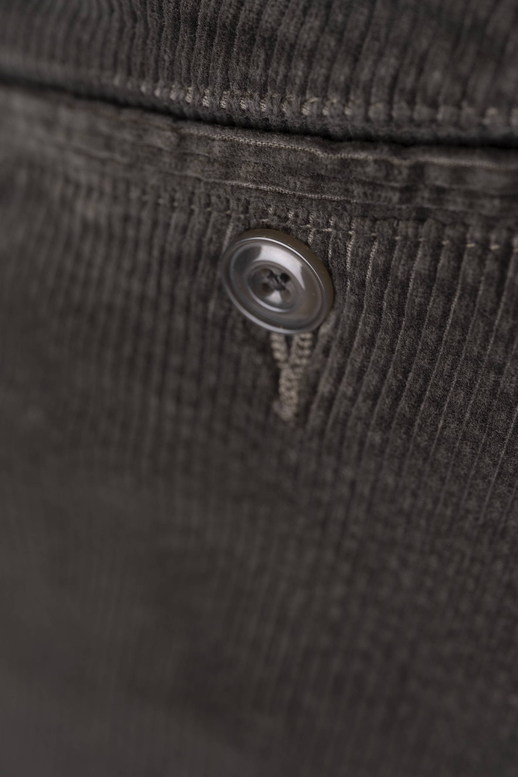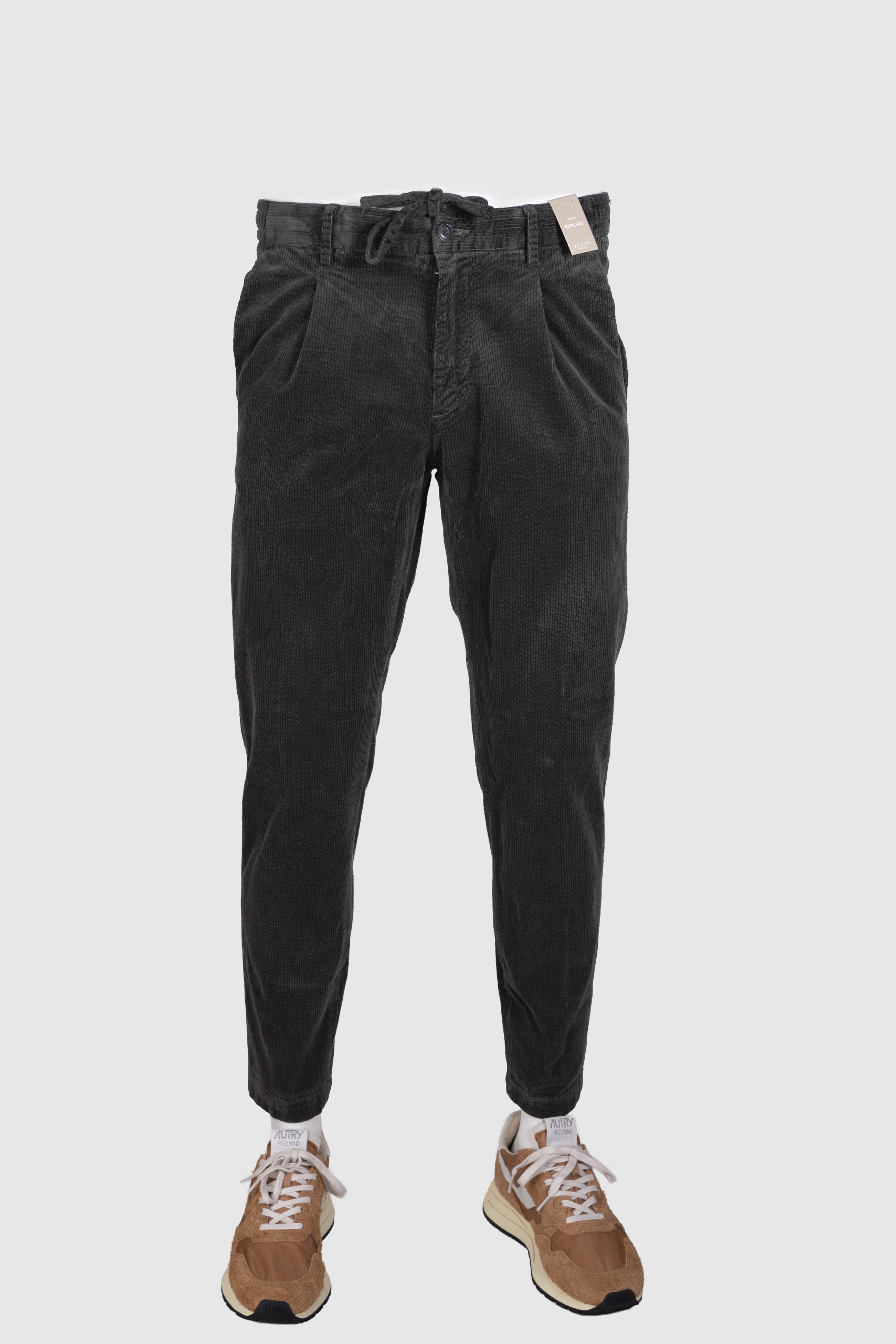 Pantalón de pana de 80% algodón 18% viscosa 2% elastane con pinza matada, cinturilla con gomas laterales para dar mas confort, vestibilidad regular fit y ancho de bocas a 17cm.
