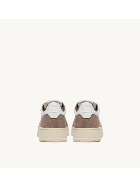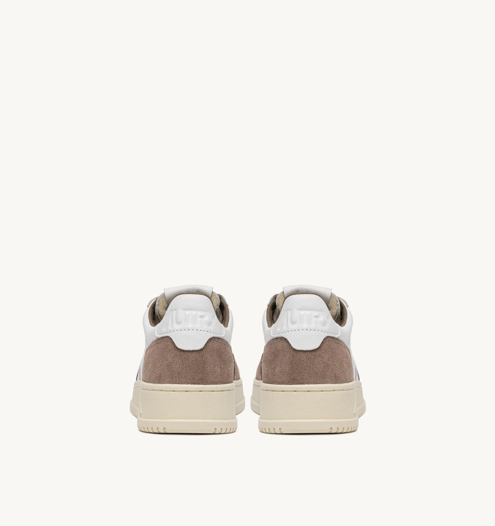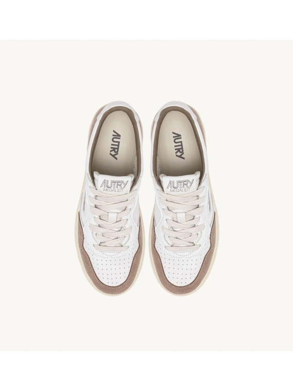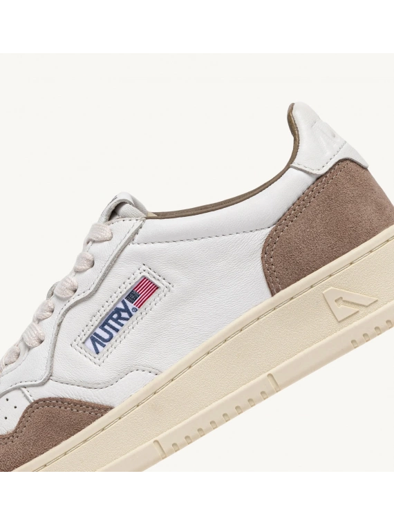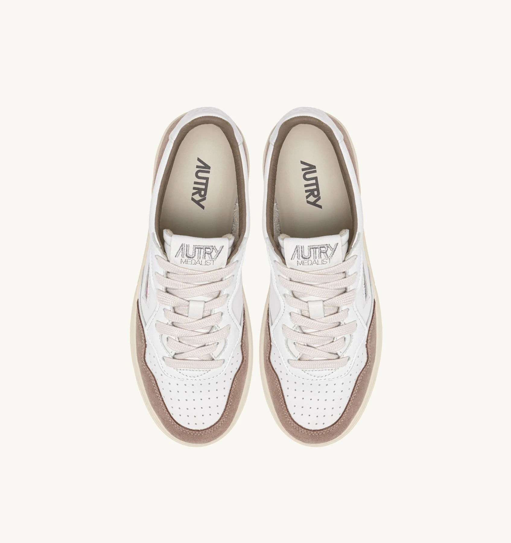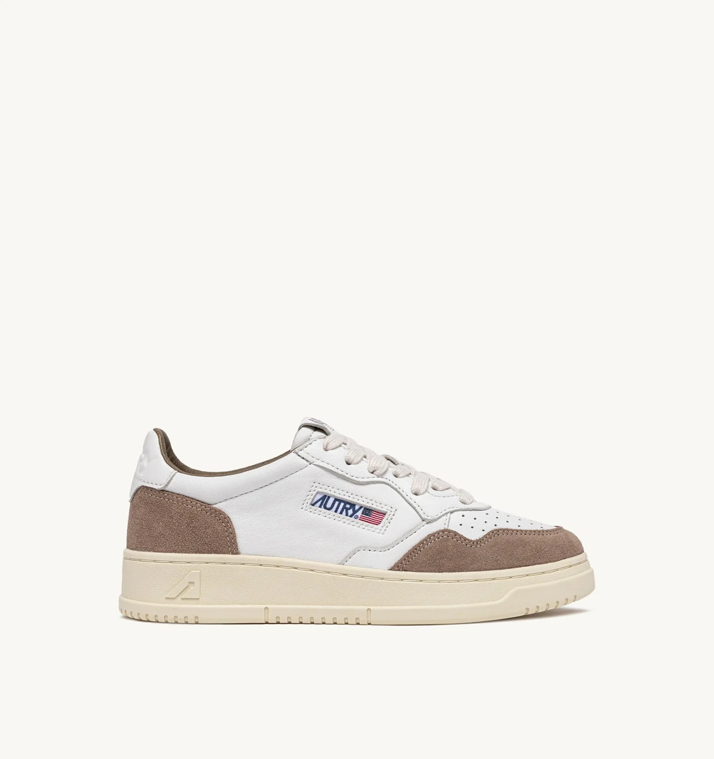 La Medalist de Autry inaugura una nueva era de estilo y comodidad. Con un perfil de tobillo low, esta zapatilla para mujer está confeccionada de piel de cabra blanca y presenta inserciones de ante marrón con un logo blanco en el talón para definir la Empeine.