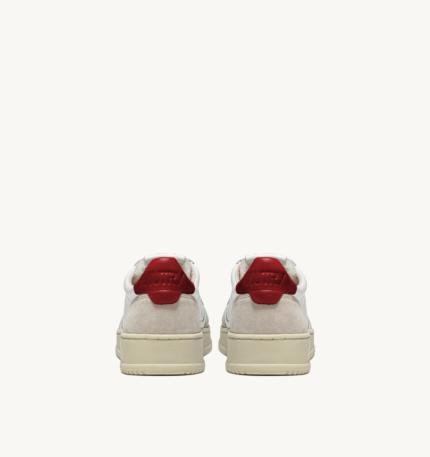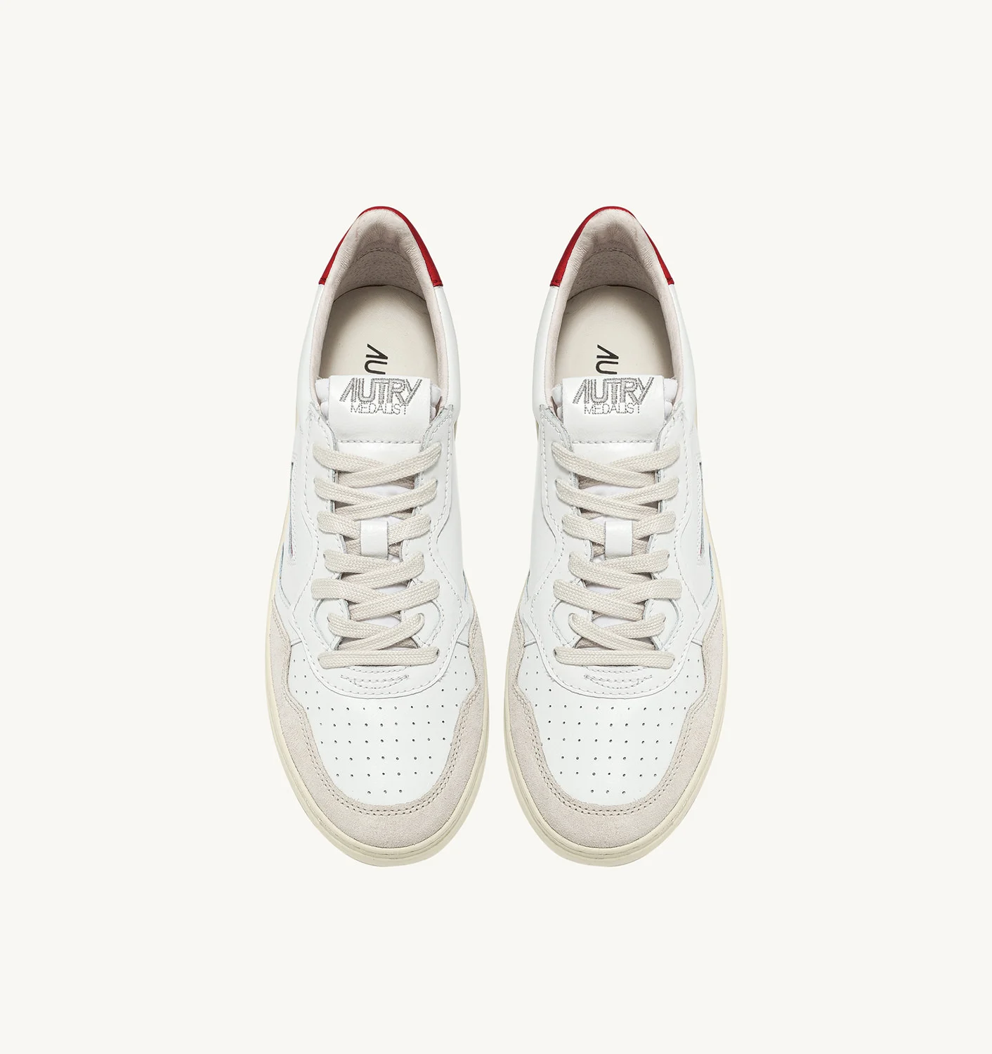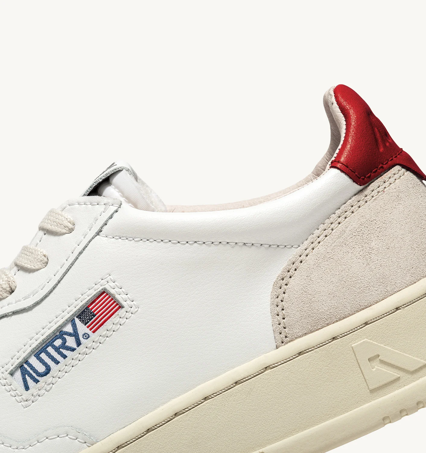 Estas zapatillas para mujer están confeccionadas en suave piel blanca de aspecto auténtico y acabadas con refuerzos de ante beige para una mezcla táctil y gráfica. El detalle de piel roja que decora el talón está personalizado con el logotipo de Autry.