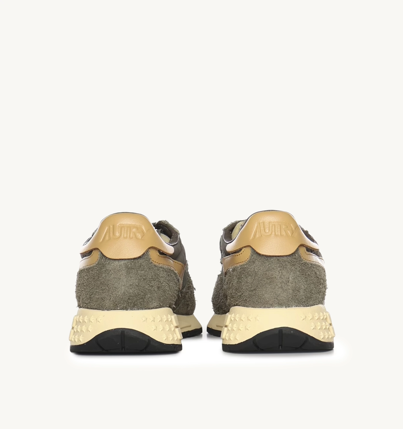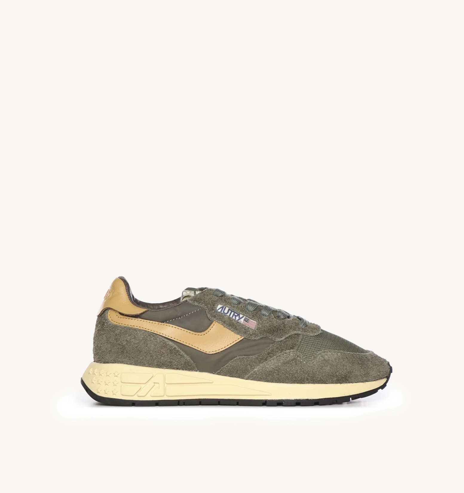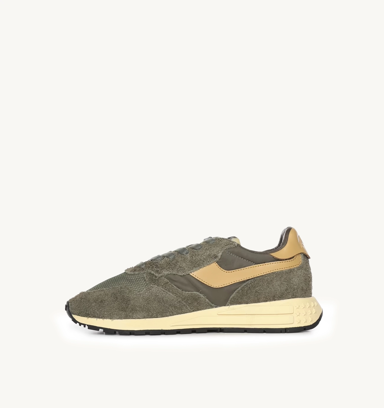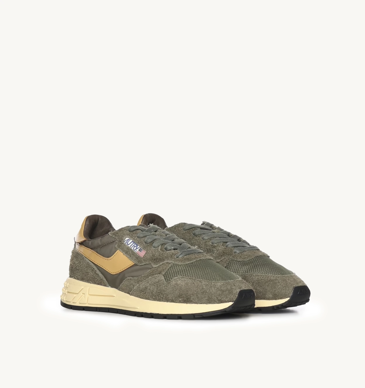 Las zapatillas Reelwind combinan el característico estilo de Autry con elementos inspirados en el mundo del running. Definidas por una silueta elegante y un diseño retro de los años 80, ofrecen ligereza, flexibilidad y un agarre óptimo. El modelo para hombre está hecho de una mezcla de nailon y ante verde con aplicaciones laterales de piel naranja.