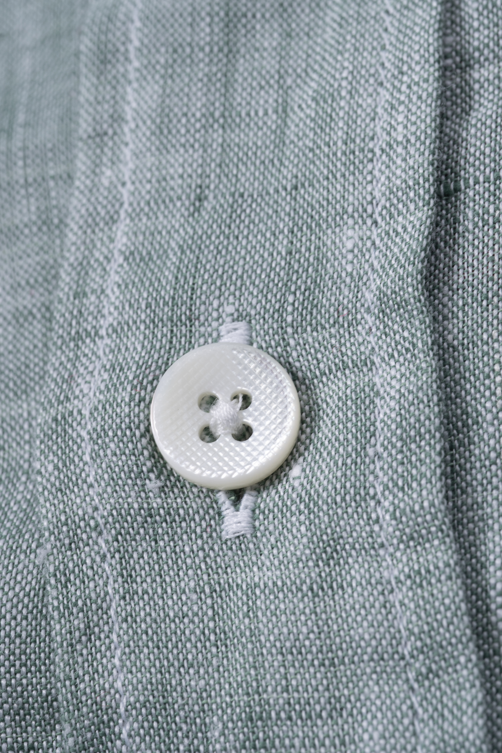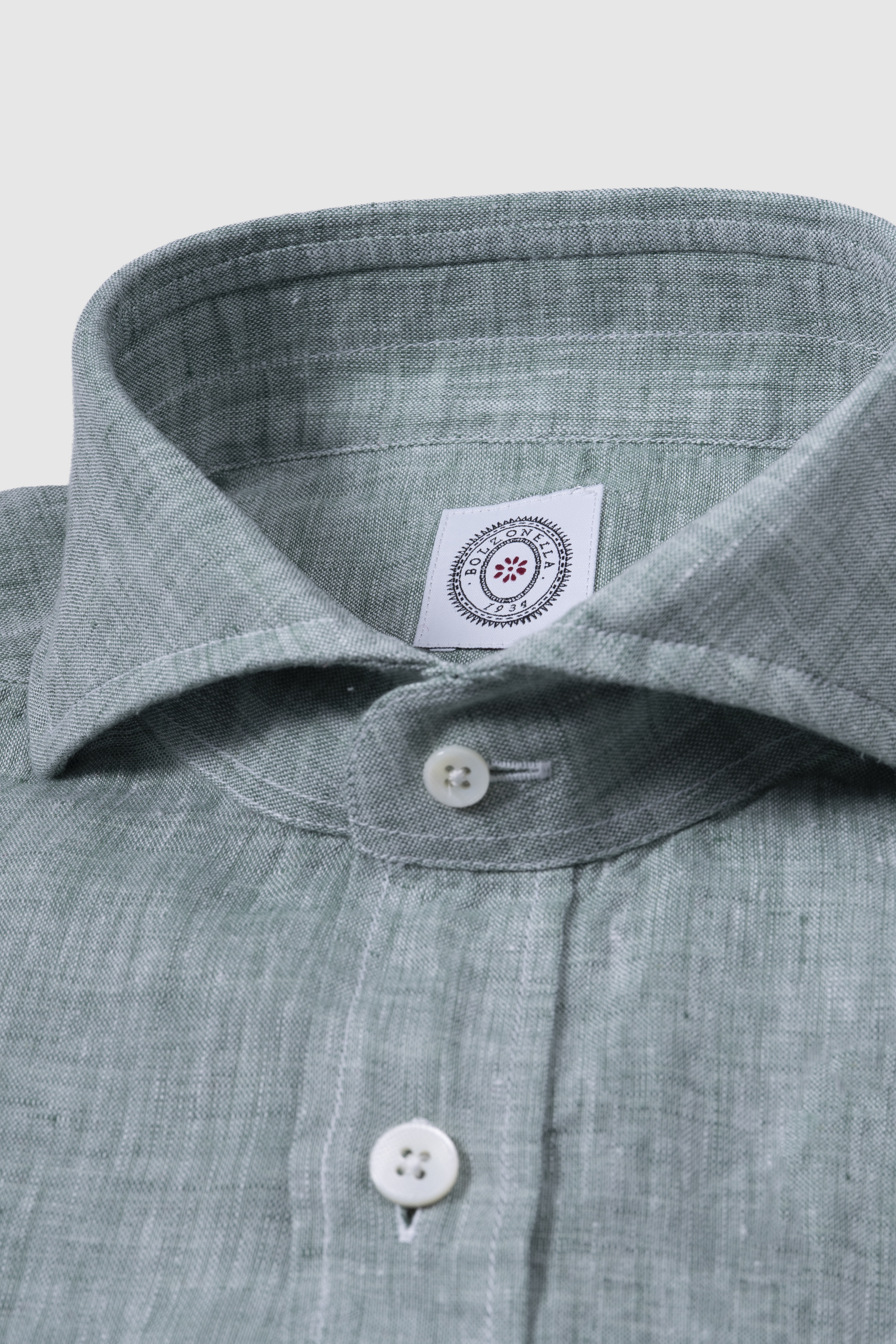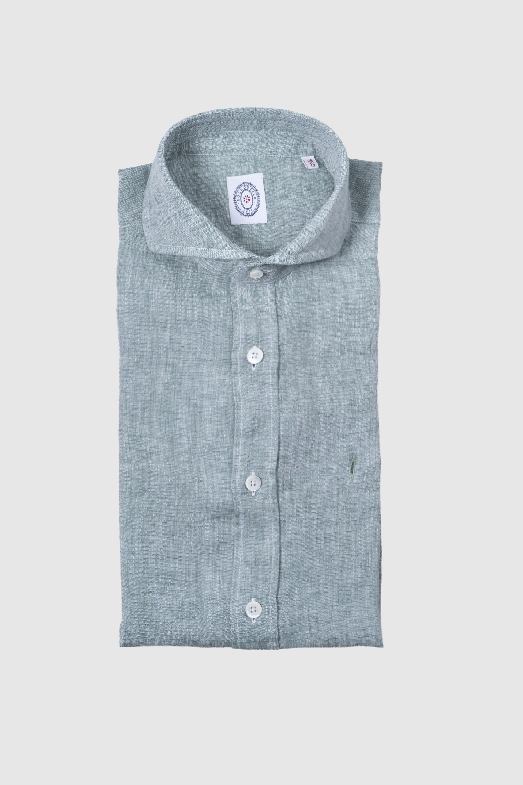 Camisa napolitana de lino 100%, vestibilidad slim fit, con ojal en el pecho bordado al tono, botonadura madre pelas en contraste. Made in Italy.