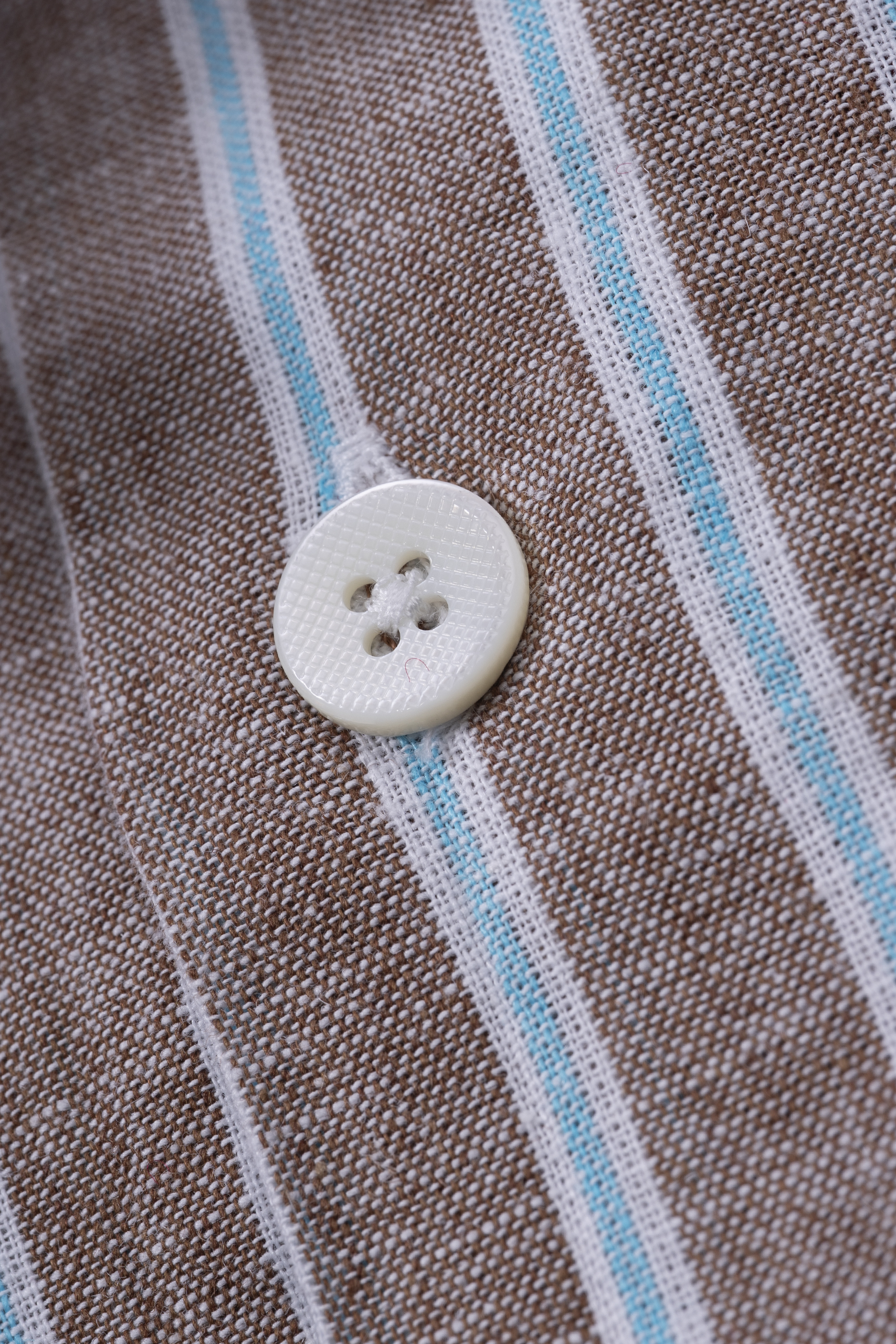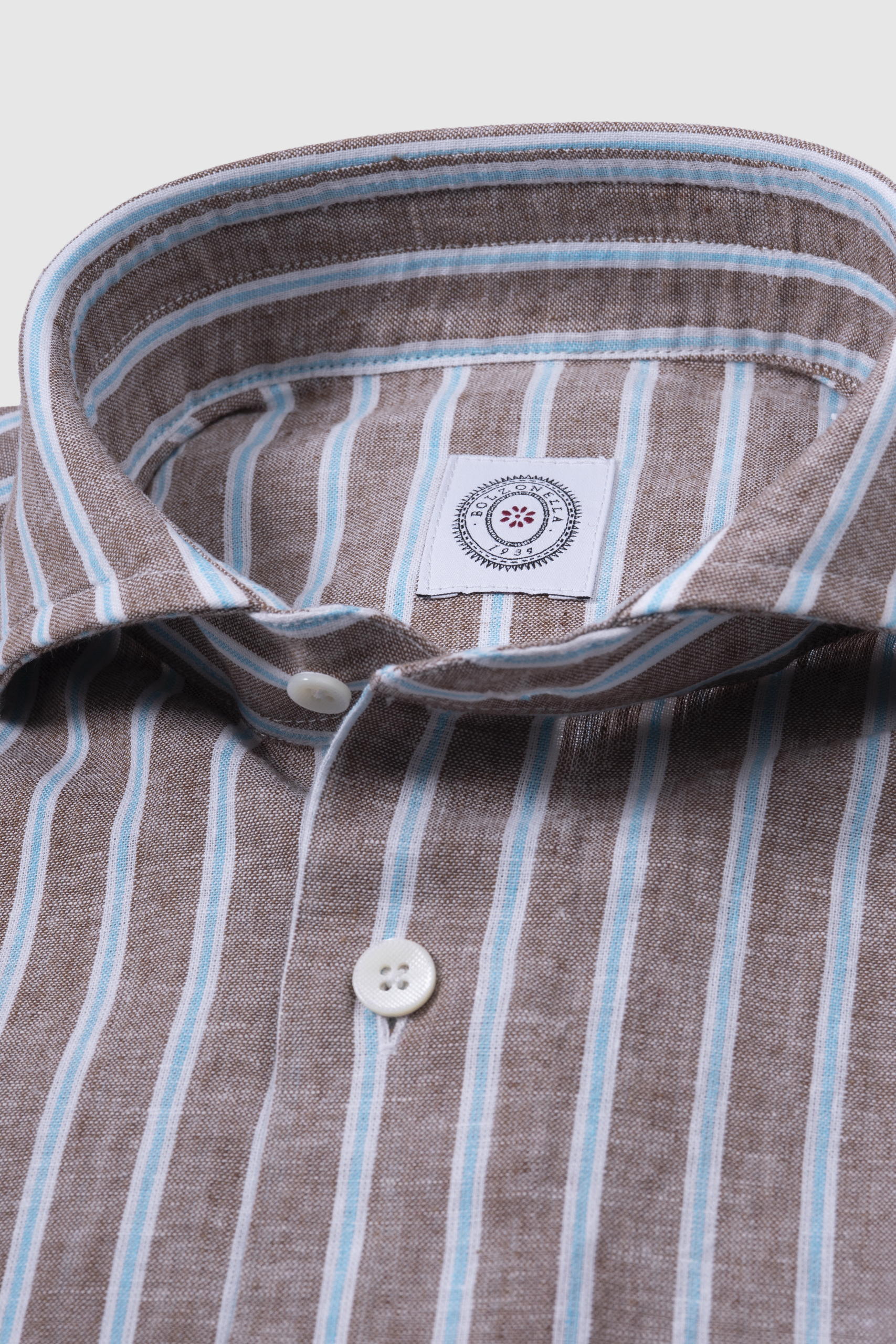 Camisa napolitana 55% lino, 45% algodón, vestibilidad slim fit, con ojal en pecho bordado en contraste, botonadura madre perla en contraste. Made in Italy.