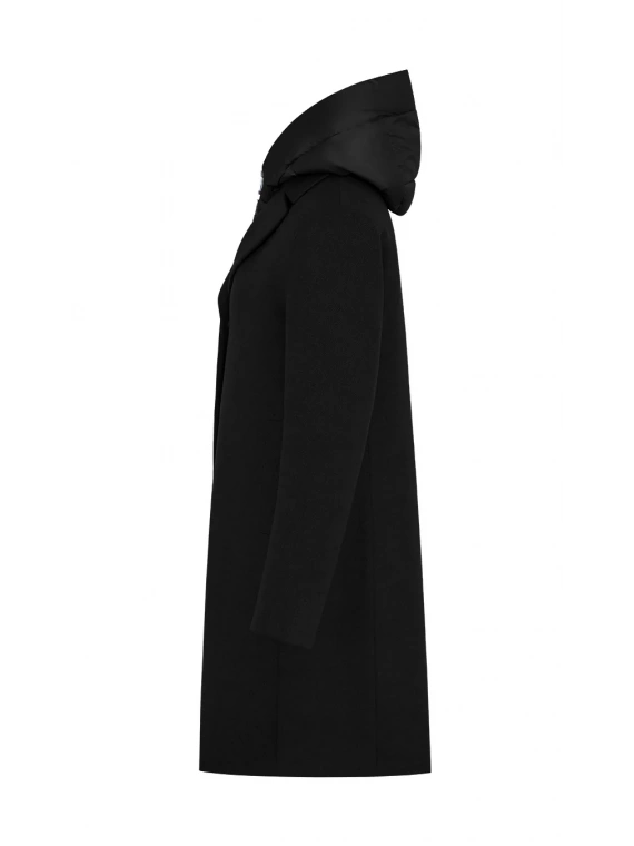 Abrigo de botonadura sencilla de lana técnica con relleno de plumón. Presenta pechera desmontable con capucha de tejido técnico superligero a juego y una profunda abertura central en la espalda con botones a presión ocultos. Cierre frontal con 3 botones y bolsillos laterales de ribete con cremallera.