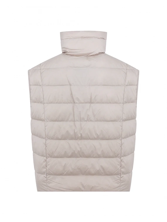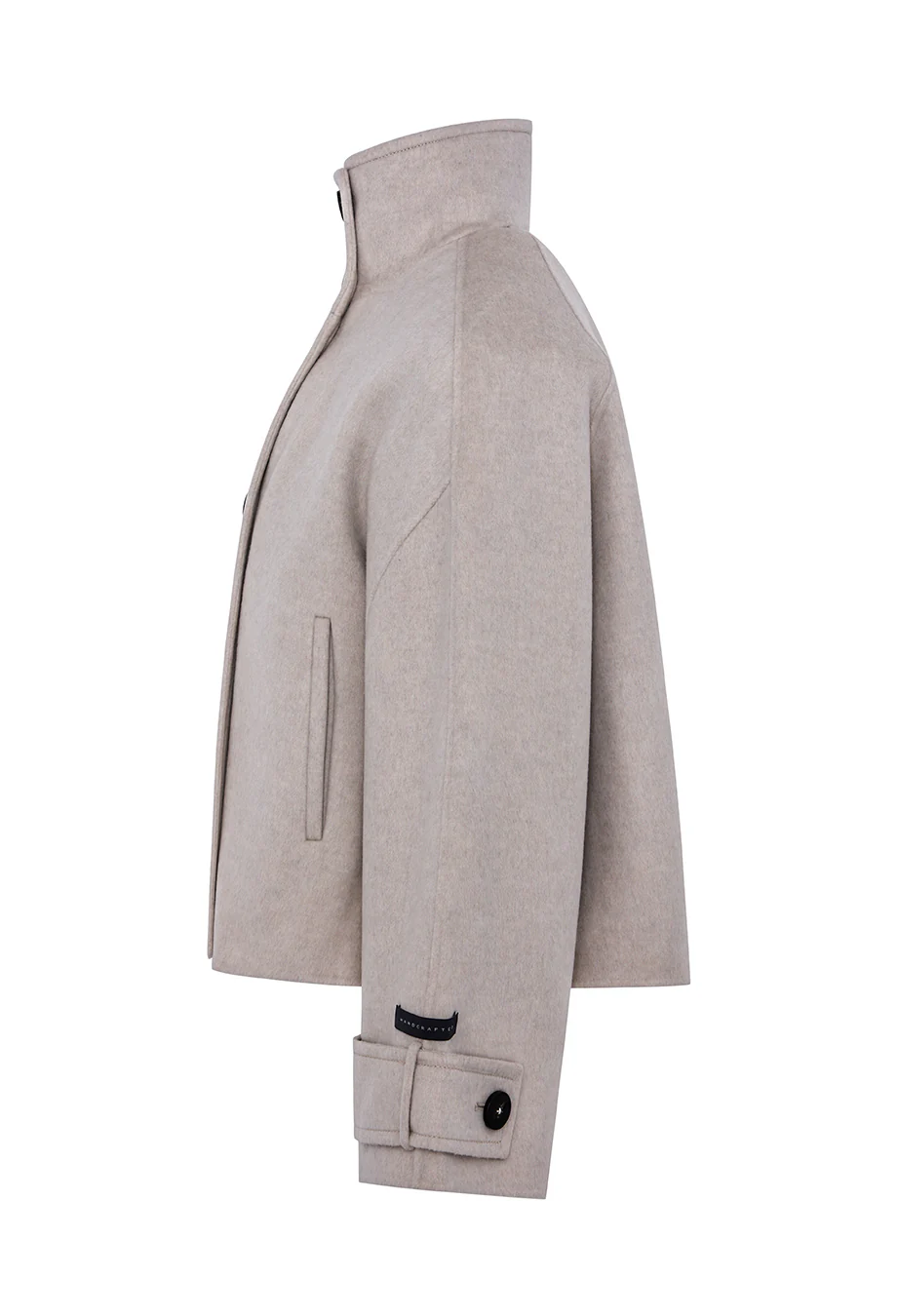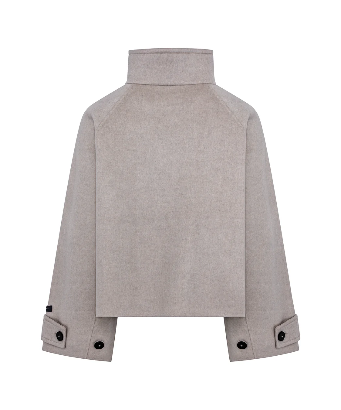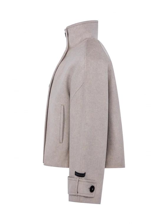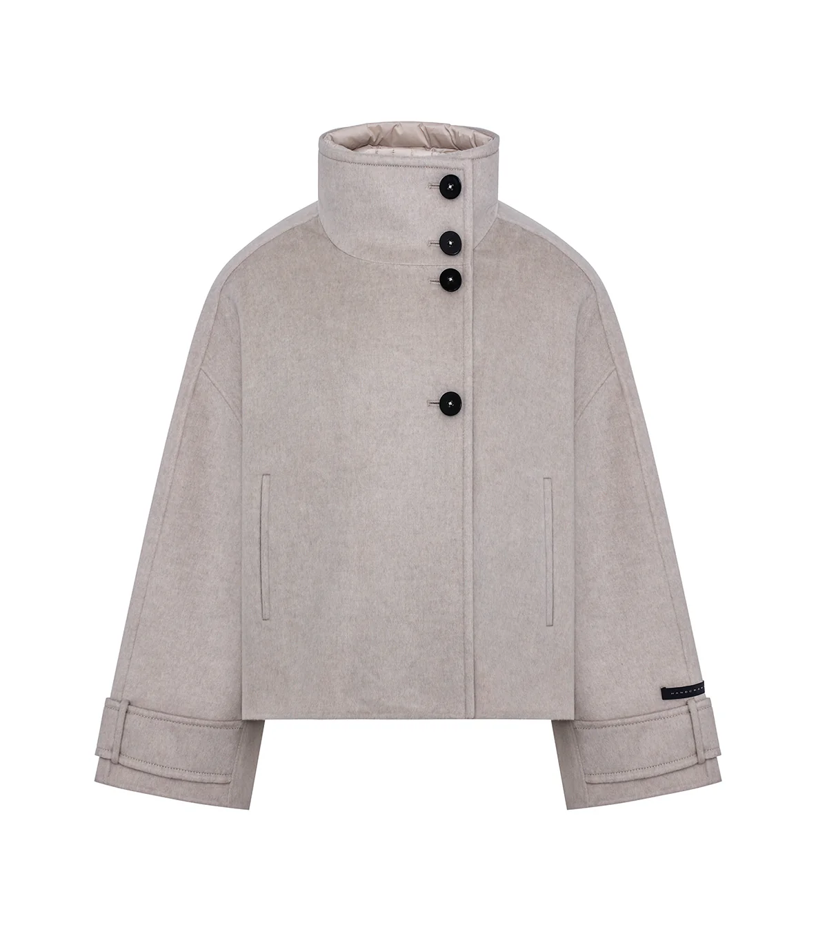 Chaqueta corta sin forro, perteneciente al proyecto “ATTIC” de DUNO para el segmento de prendas de lujo, confeccionada con tejido de doble capa de lana y cachemira a medida. La prenda presenta un bajo acampanado con mangas kimono, cuello amplio y redondo, y cierre frontal con botones solo en la parte superior. Bolsillos laterales de ribete y bajo de manga ajustable con tira y botones. En el interior, un chaleco desmontable de tejido técnico ligero con relleno de plumón, que se puede llevar por separado.