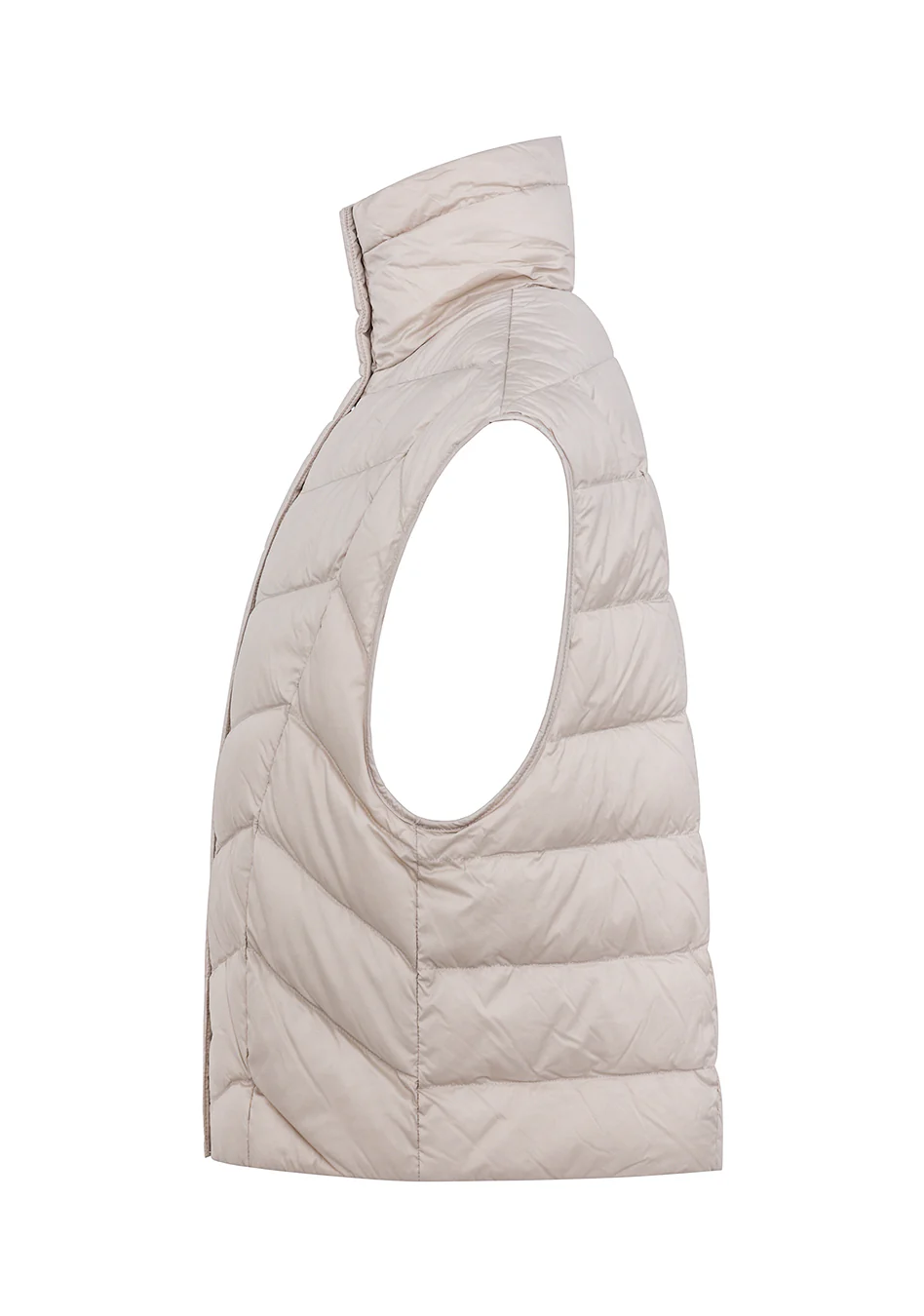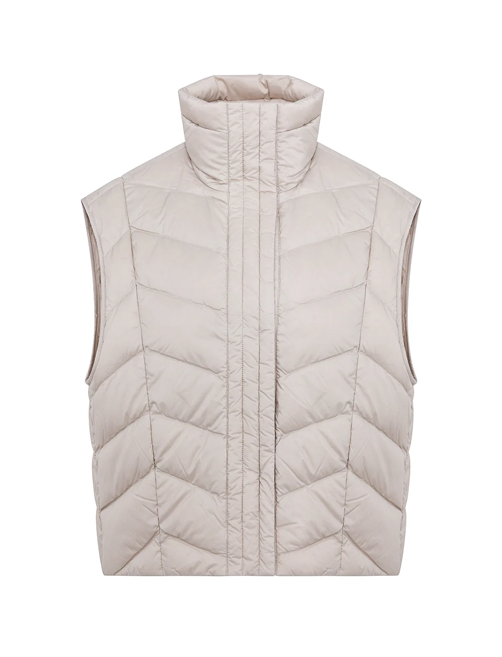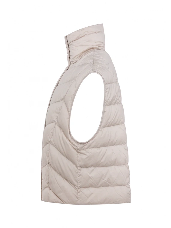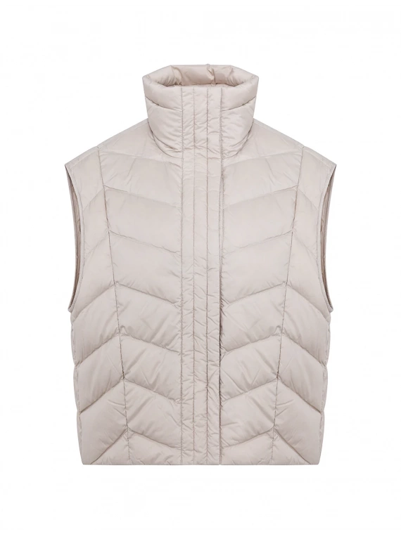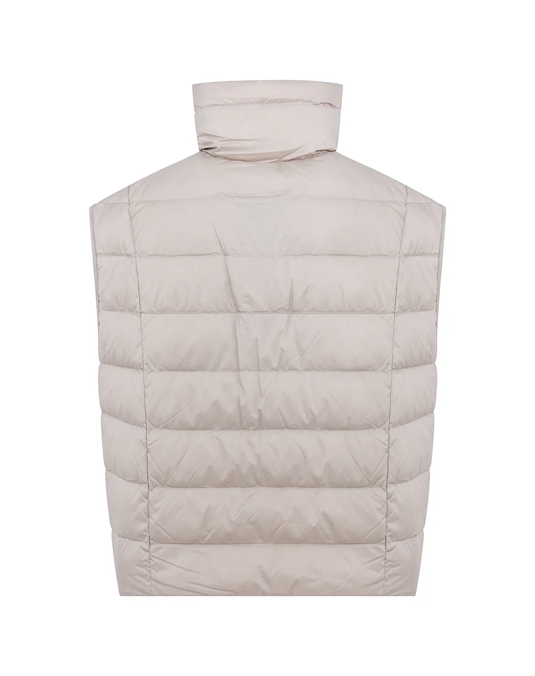 Chaqueta corta sin forro, perteneciente al proyecto “ATTIC” de DUNO para el segmento de prendas de lujo, confeccionada con tejido de doble capa de lana y cachemira a medida. La prenda presenta un bajo acampanado con mangas kimono, cuello amplio y redondo, y cierre frontal con botones solo en la parte superior. Bolsillos laterales de ribete y bajo de manga ajustable con tira y botones. En el interior, un chaleco desmontable de tejido técnico ligero con relleno de plumón, que se puede llevar por separado.