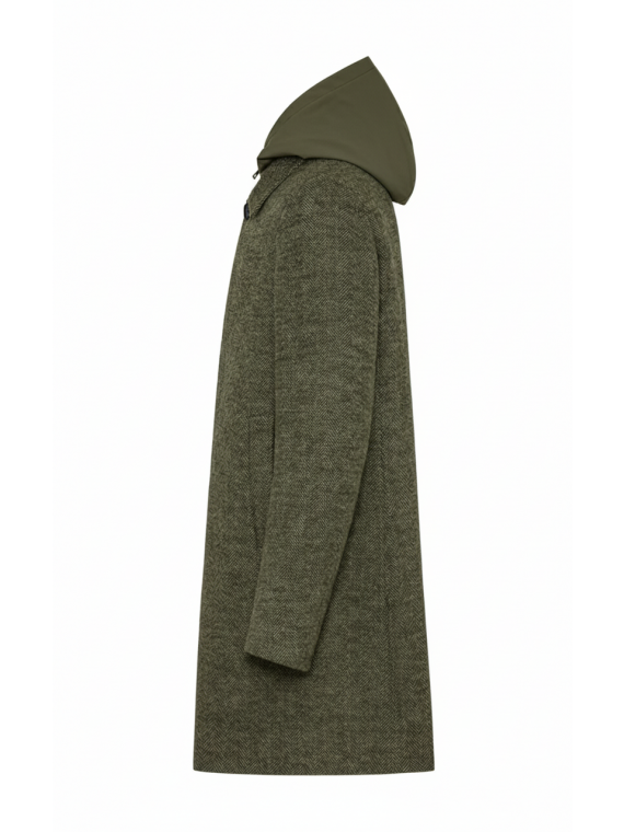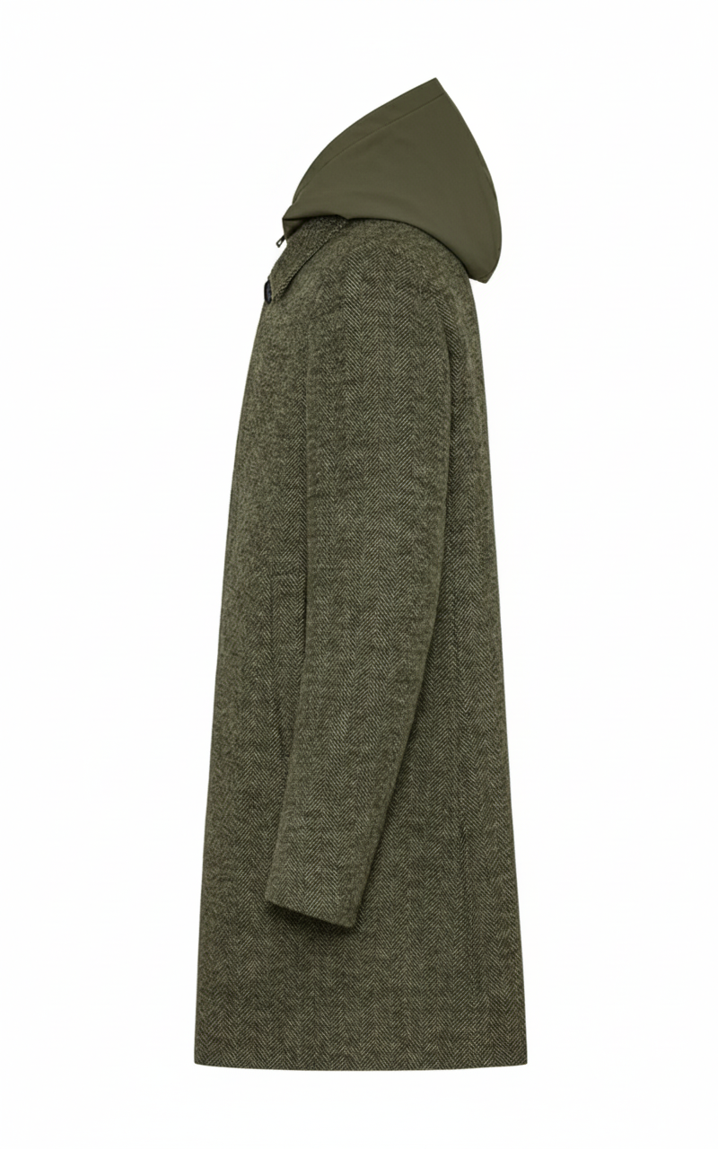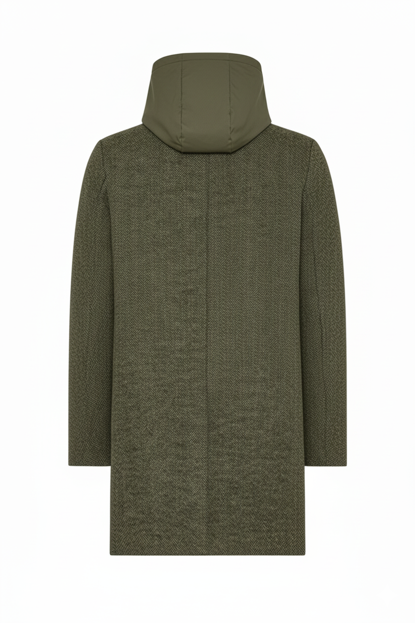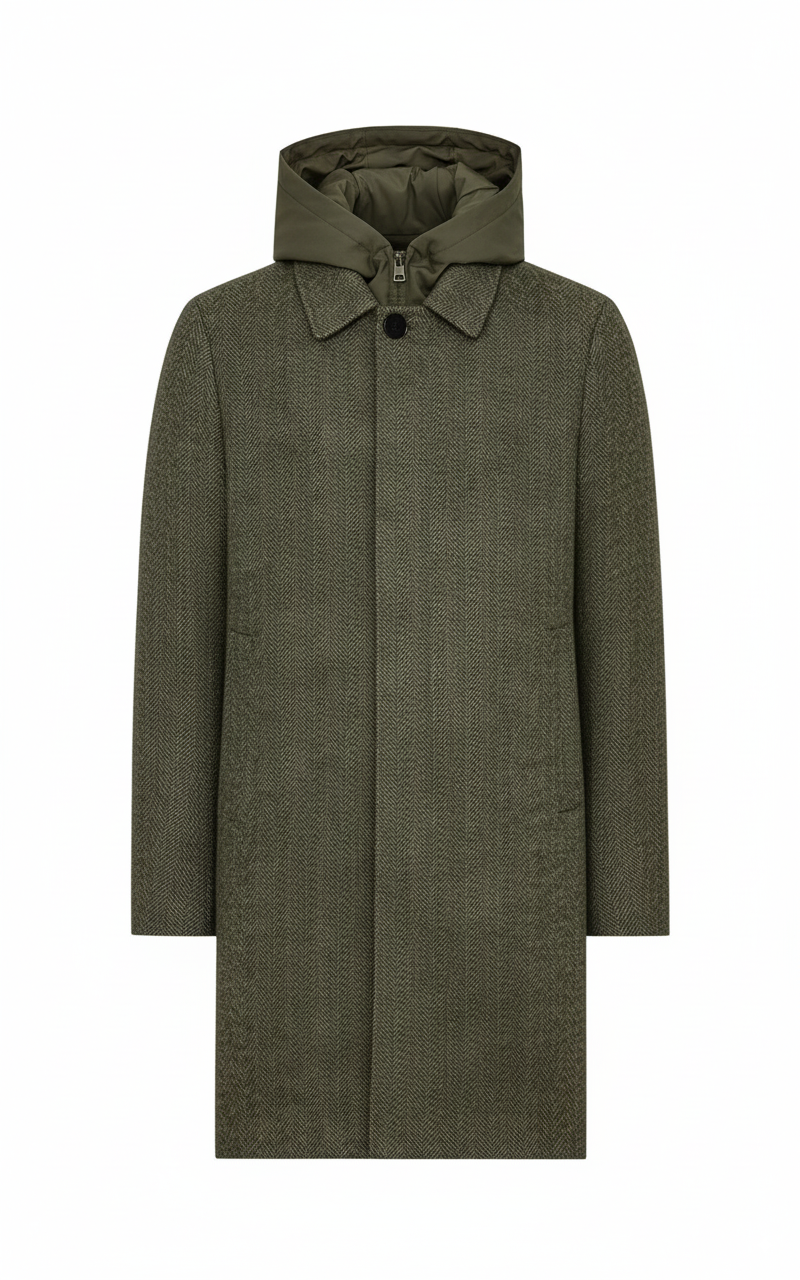 Abrigo de lana con estampado de espiga. Cuello camisero, bajocuello con pespuntes en zigzag, cierre con botones ocultos y pechera desmontable ligeramente acolchada en tejido técnico superligero con capucha y cremallera de doble cursor. Abertura central en la parte inferior trasera con botón a presión, bolsillos laterales de ribete inclinados con botón a presión y bolsillos interiores multifuncionales.