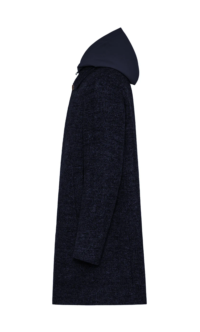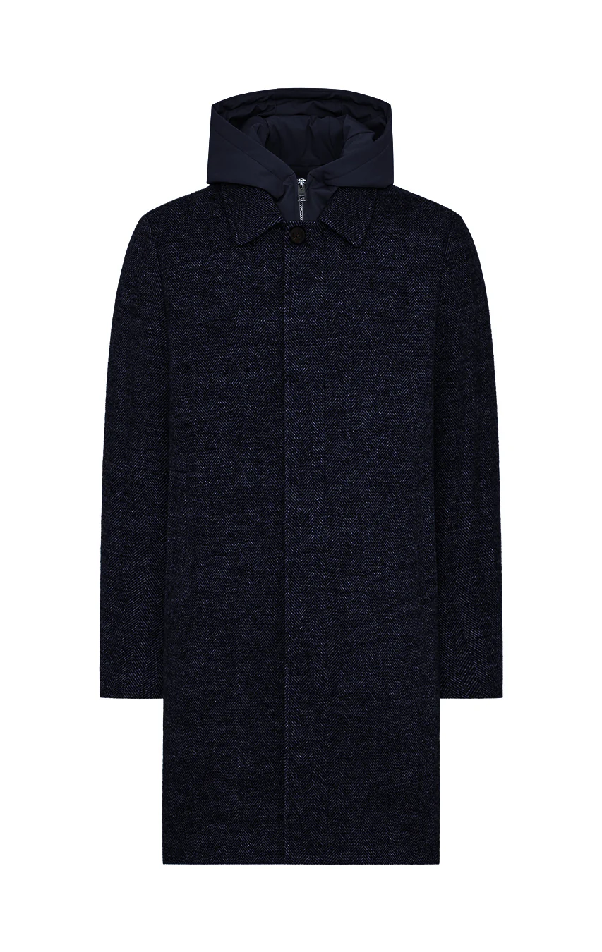 Abrigo de lana con estampado de espiga. Cuello camisero, bajocuello con pespuntes en zigzag, cierre con botones ocultos y pechera desmontable ligeramente acolchada en tejido técnico superligero con capucha y cremallera de doble cursor. Abertura central en la parte inferior trasera con botón a presión, bolsillos laterales de ribete inclinados con botón a presión y bolsillos interiores multifuncionales.