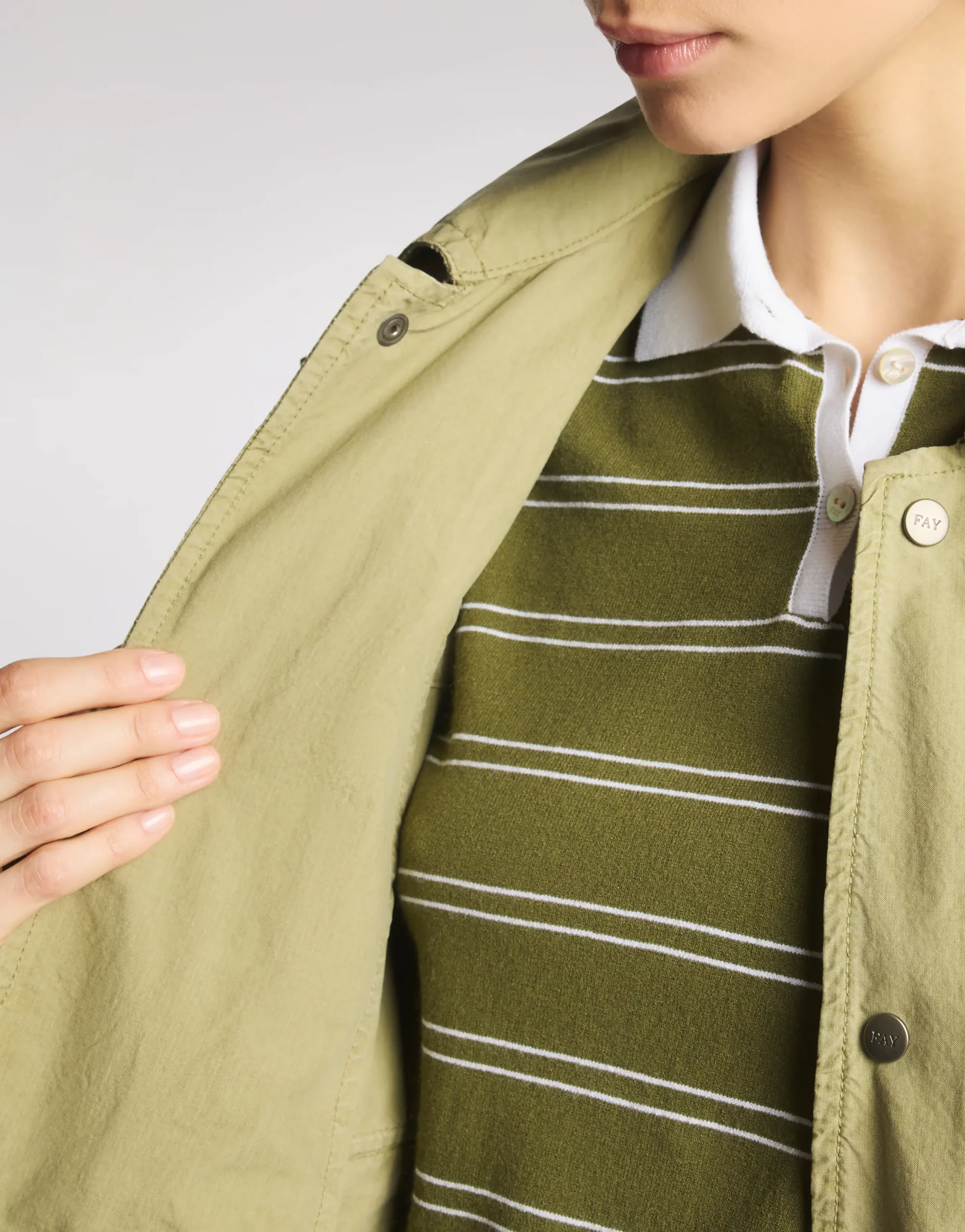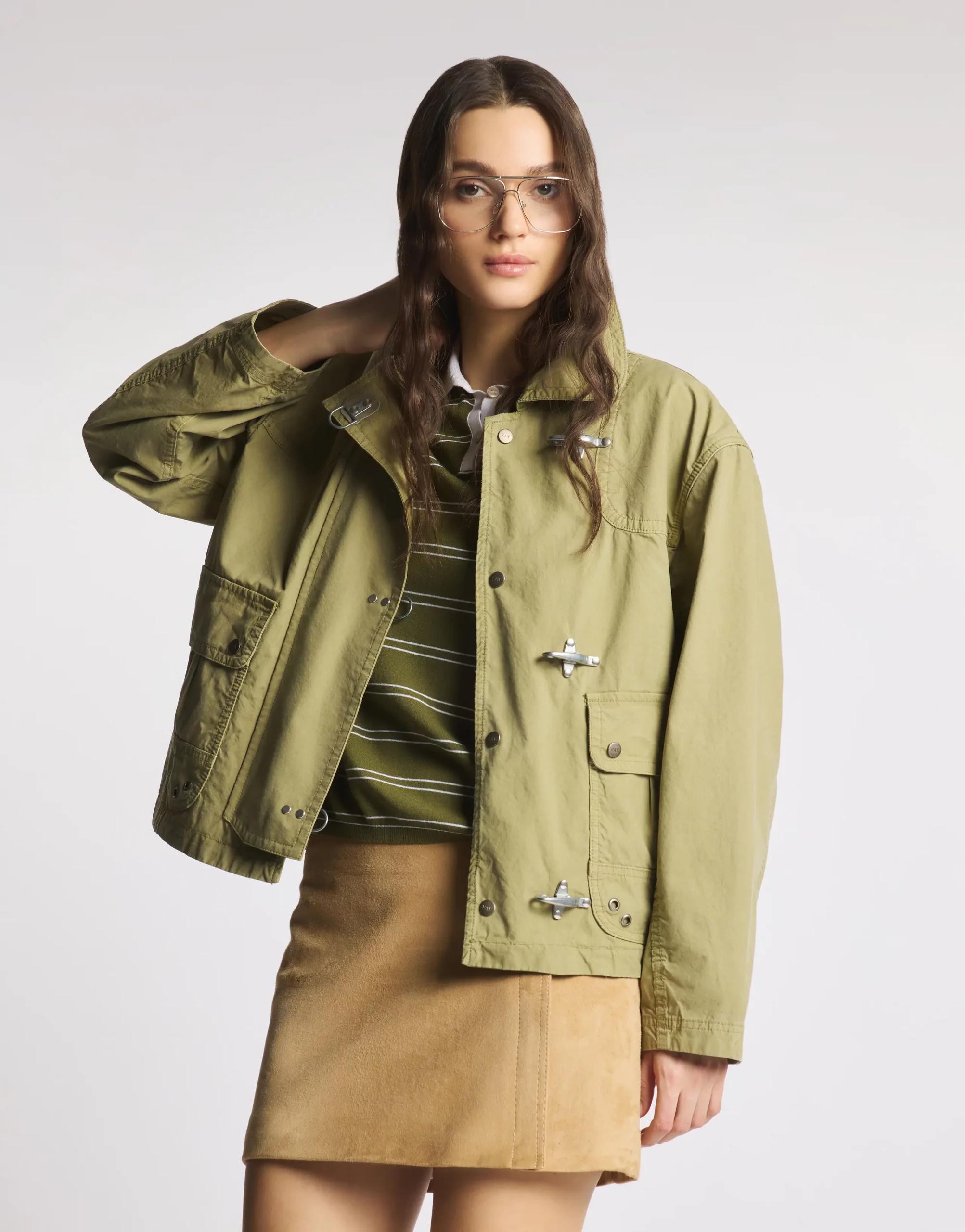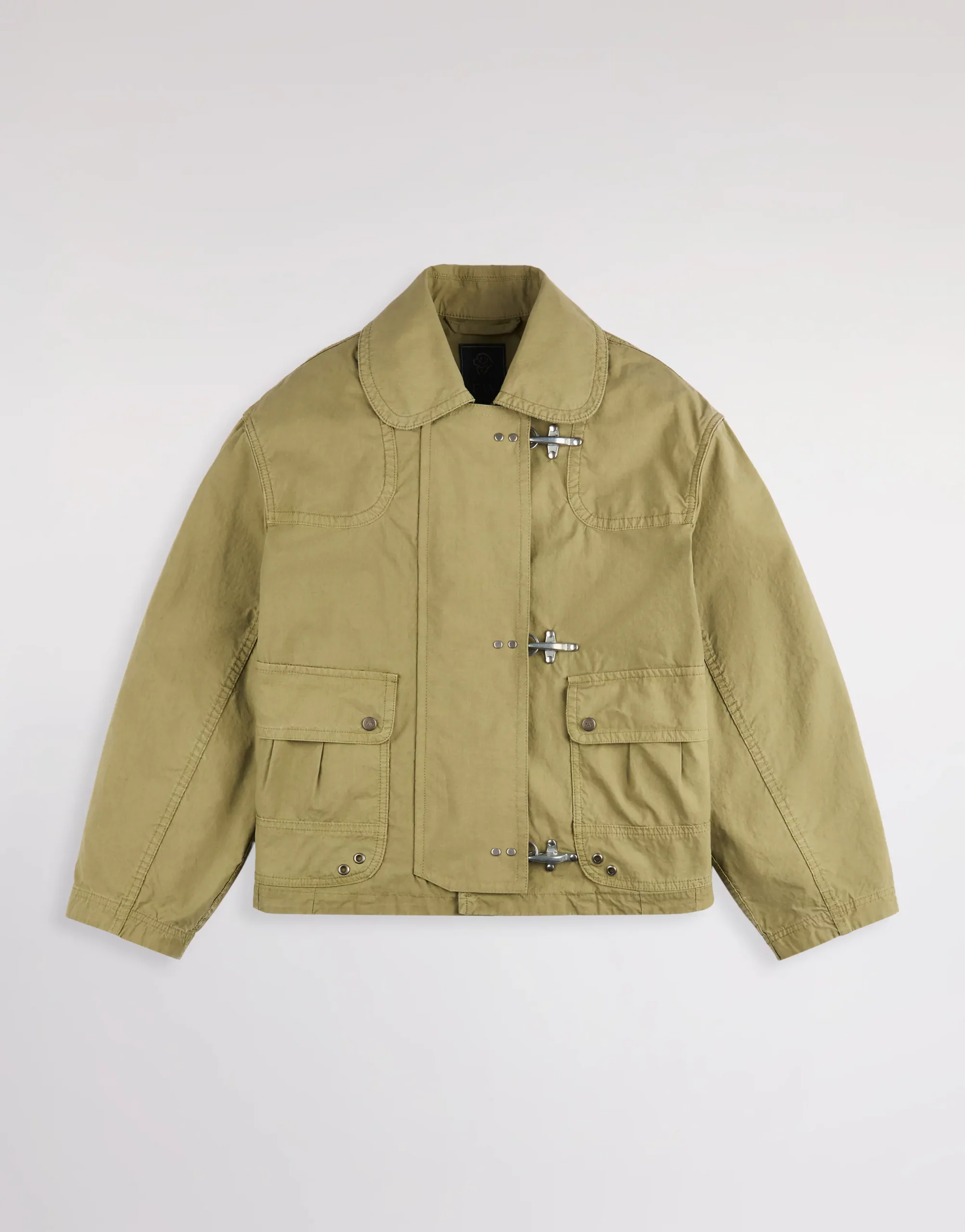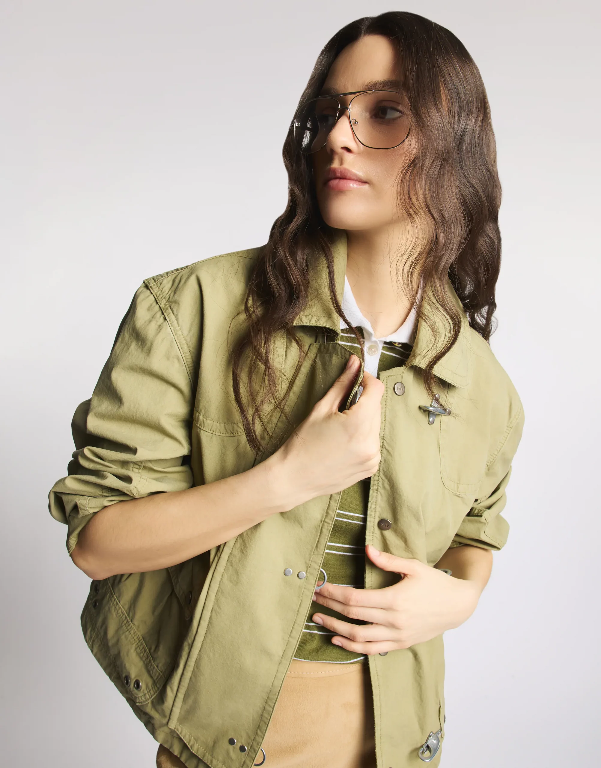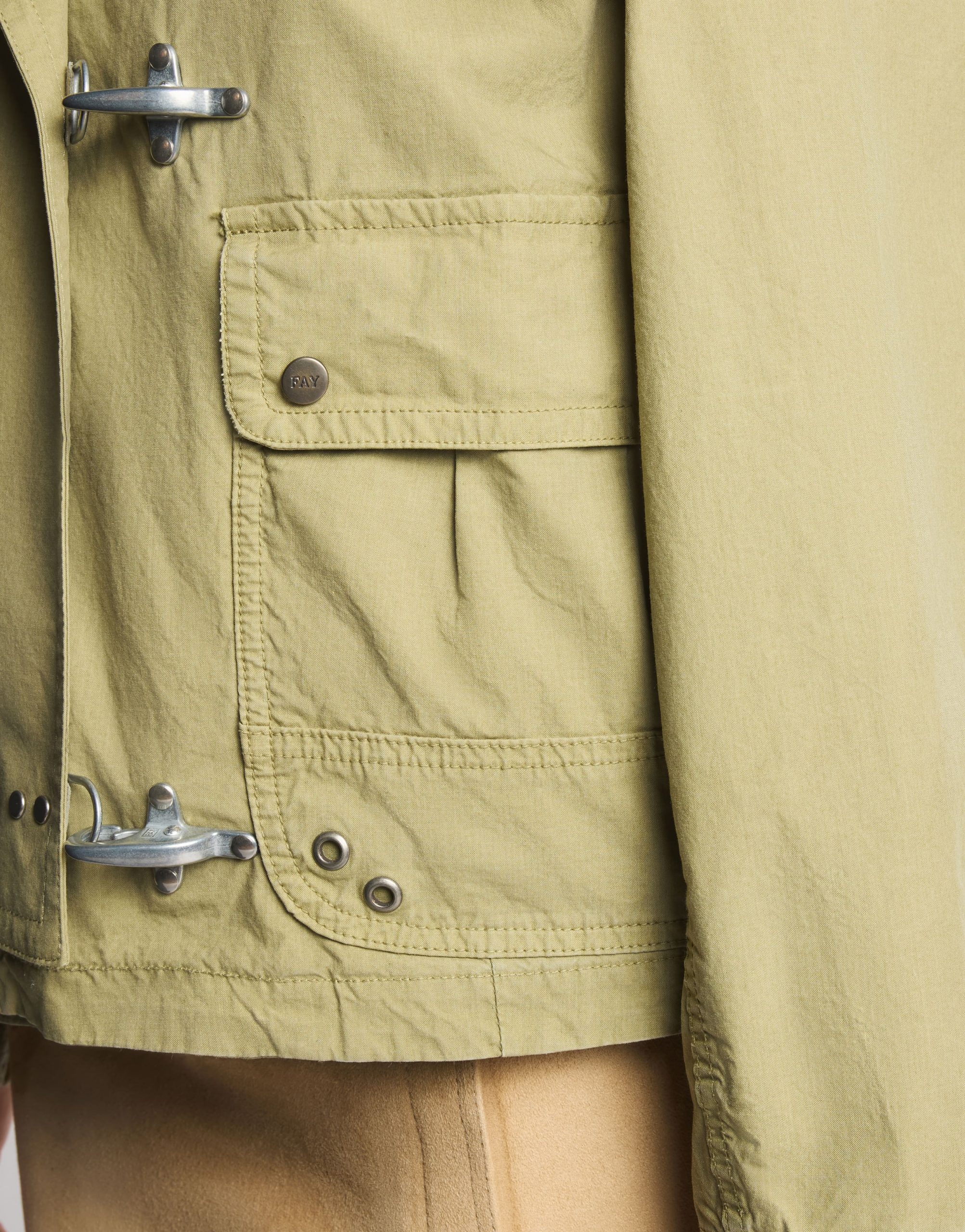 Interpretación femenina que se fija en la herencia de la marca, el 3 Ganci se caracteriza por un cuello over y el inconfudible cierre con los ganchos que recuerdan el mundo workwear. Esta versión sin forro ha sido realizada en tejido de algodón y nailon teñido en prenda. El modelo presenta un cierre con automáticos con logotipo ocultos, dos maxi bolsillos con solapa y botones.