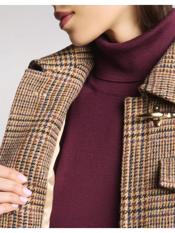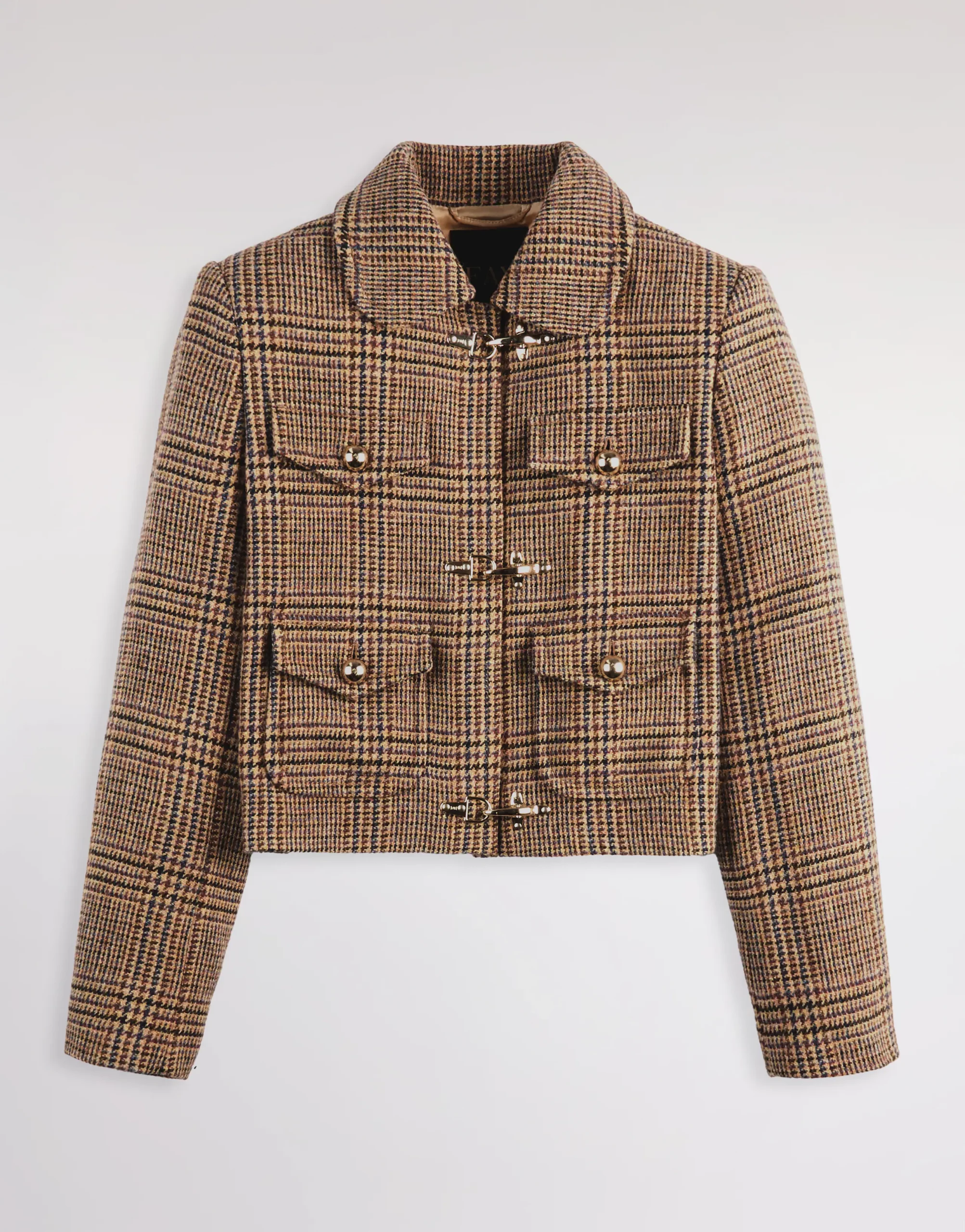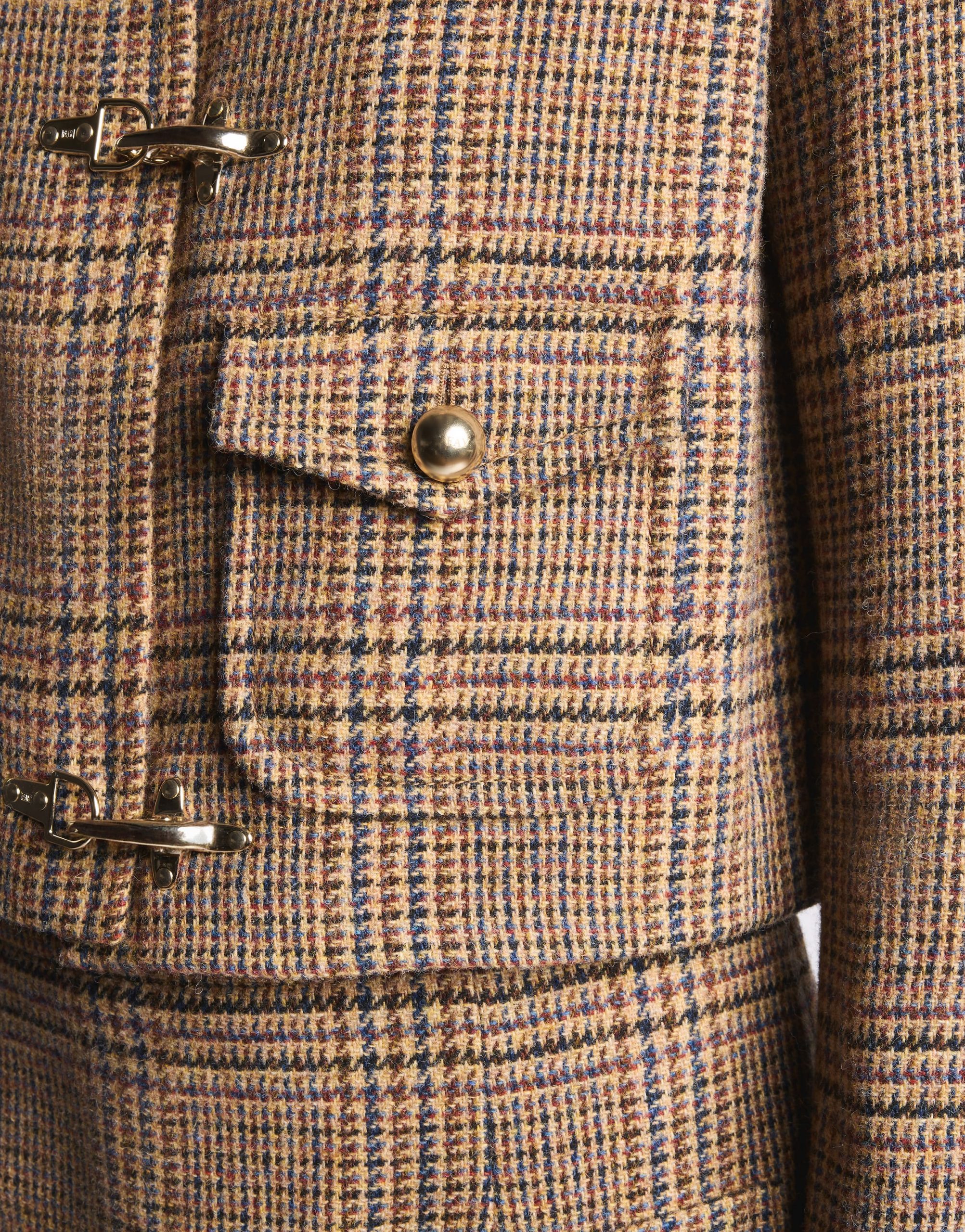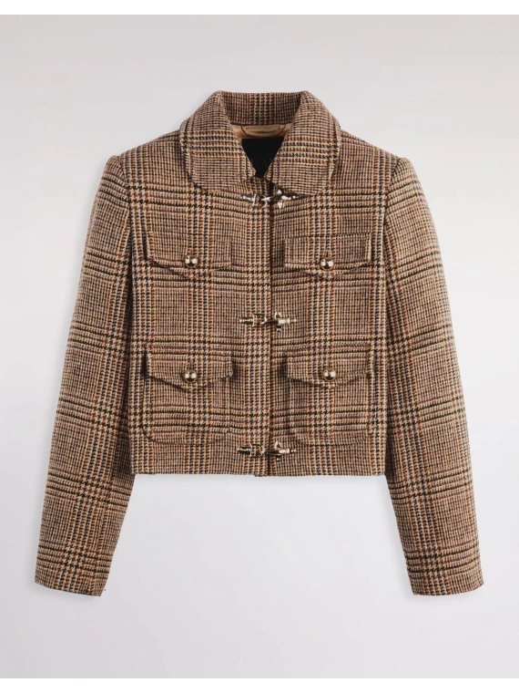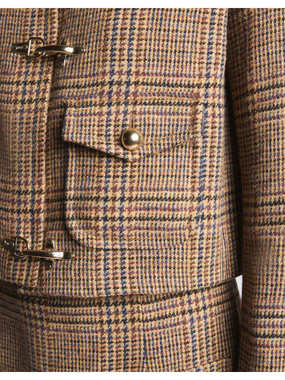 Realizado en suave lana con decoración Príncipe de Gales, se completa gracias a un sistema de cuatro bolsillos con solapa y botones en metal con logotipo.