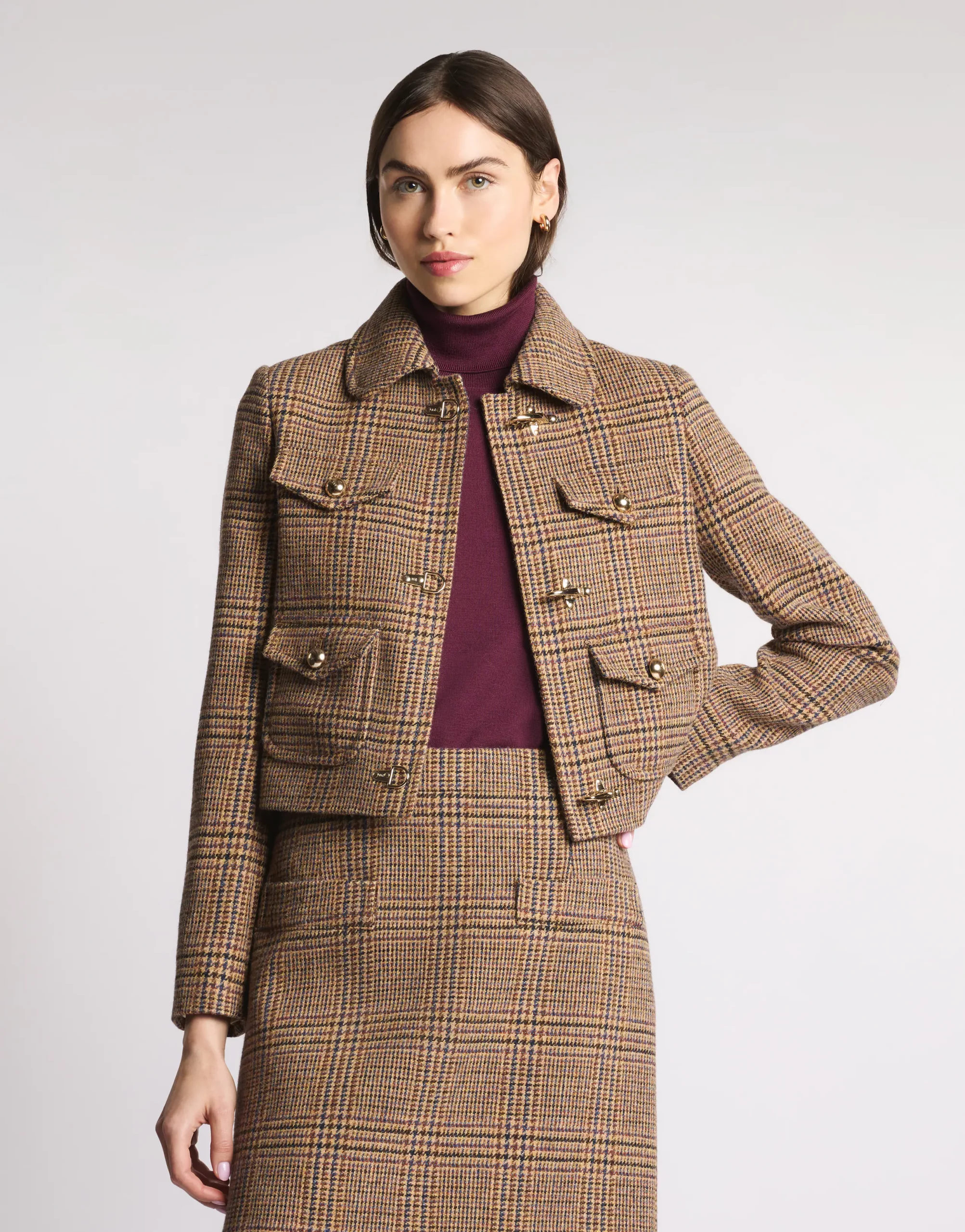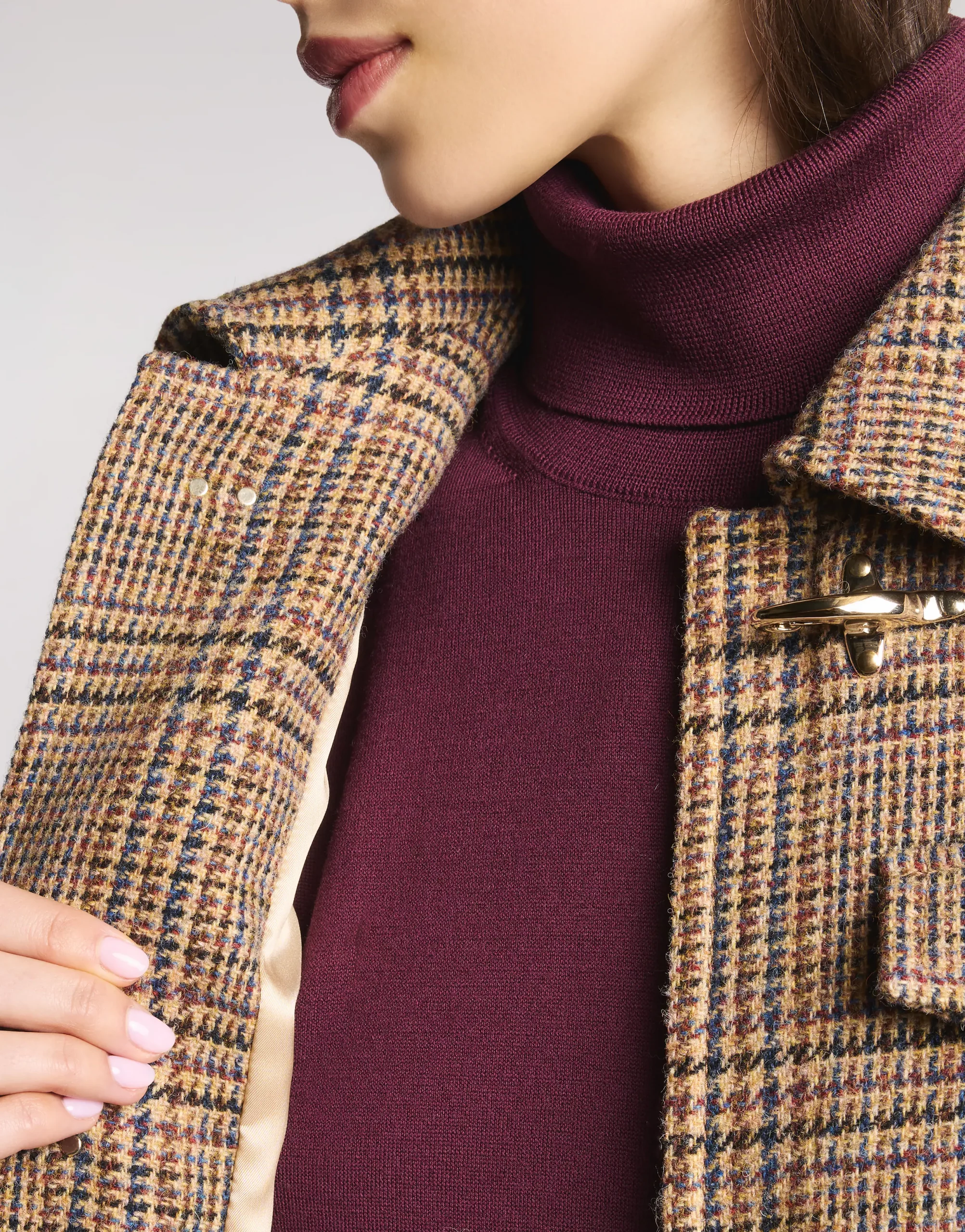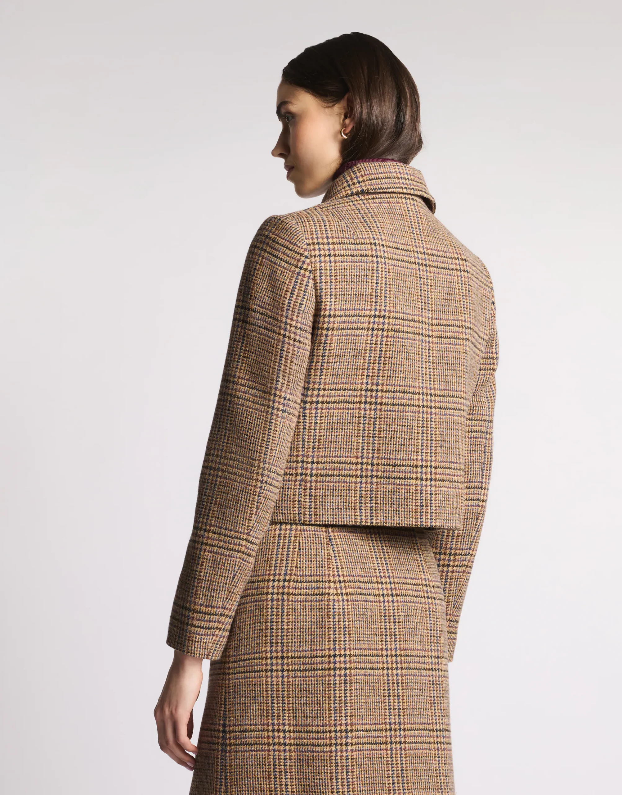 Realizado en suave lana con decoración Príncipe de Gales, se completa gracias a un sistema de cuatro bolsillos con solapa y botones en metal con logotipo.