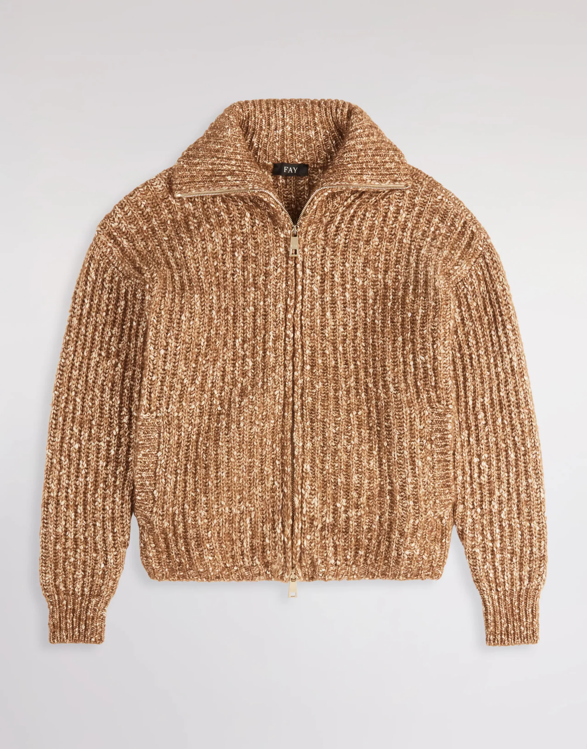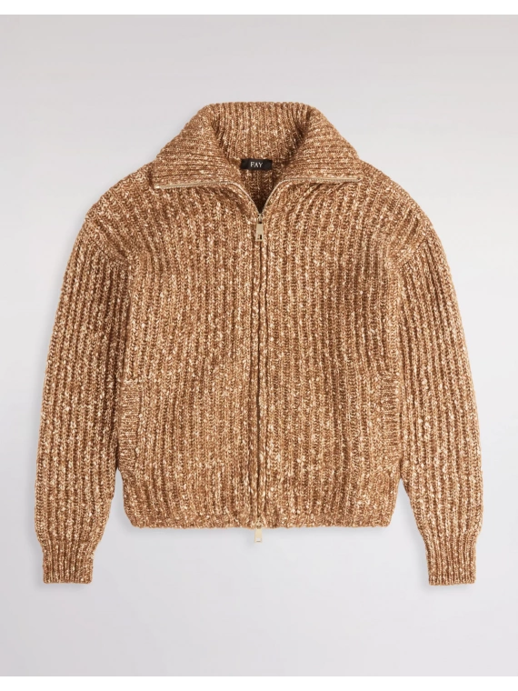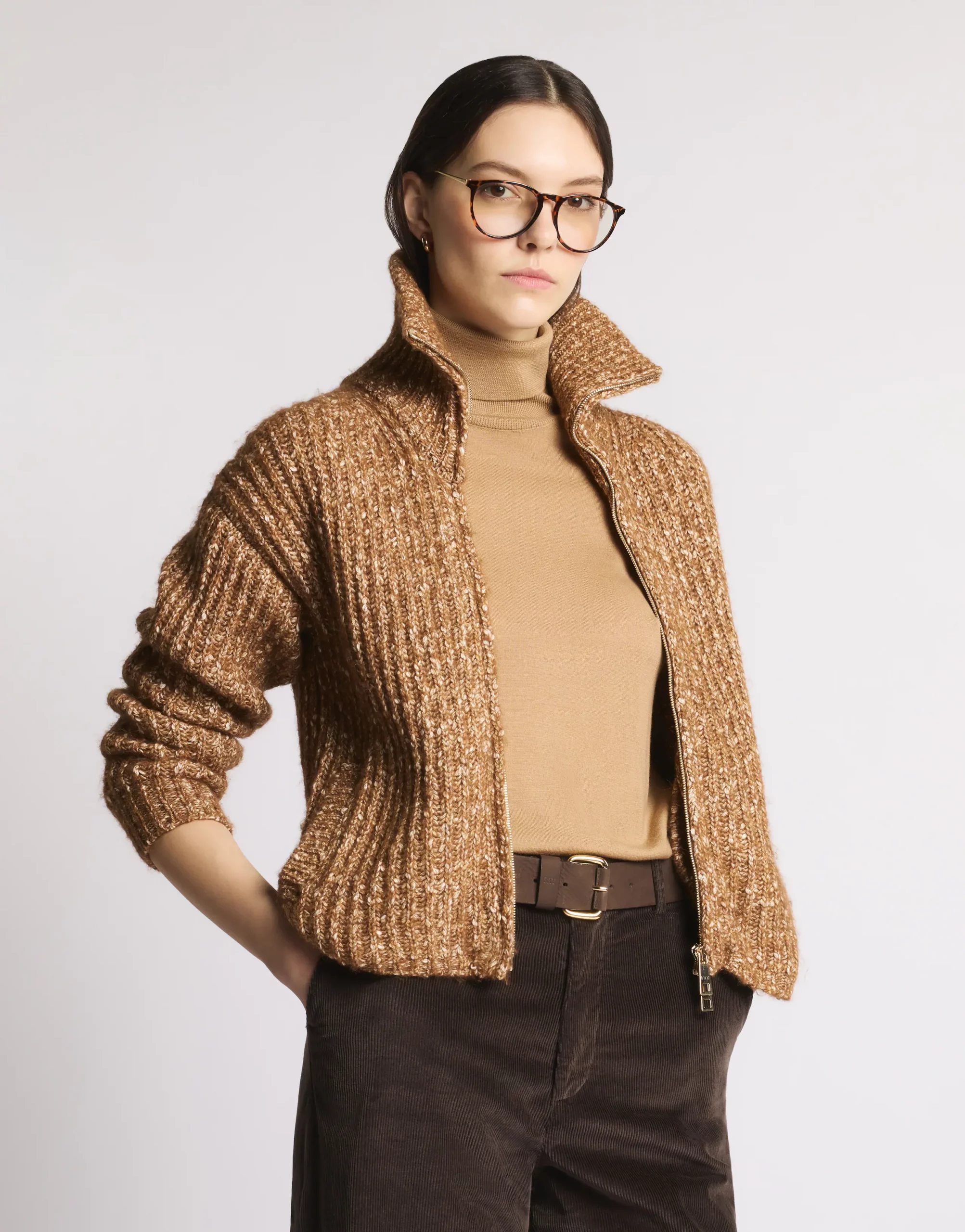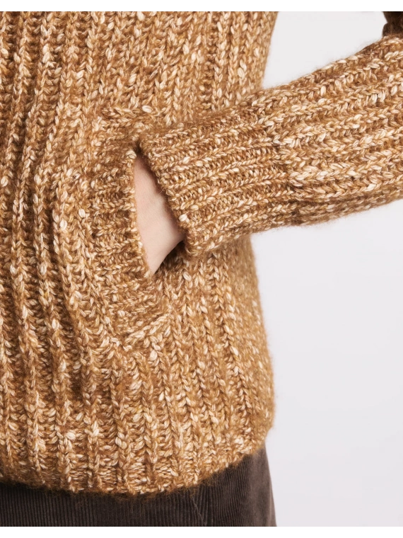 Bomber realizado en punto melange de algodón, lana y alpaca con elaboración acanalada. Presenta un cierre con cremallera y doble cursor, bolsillos ribeteados laterales.