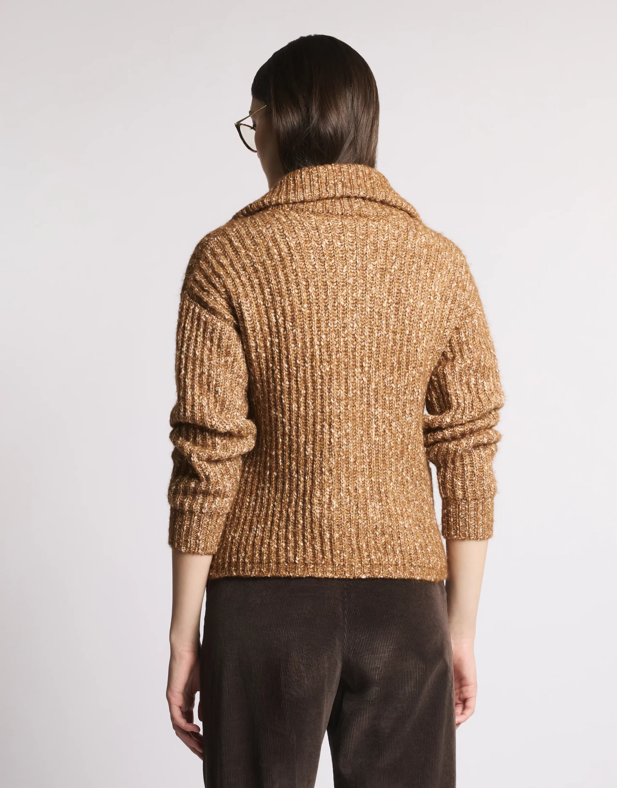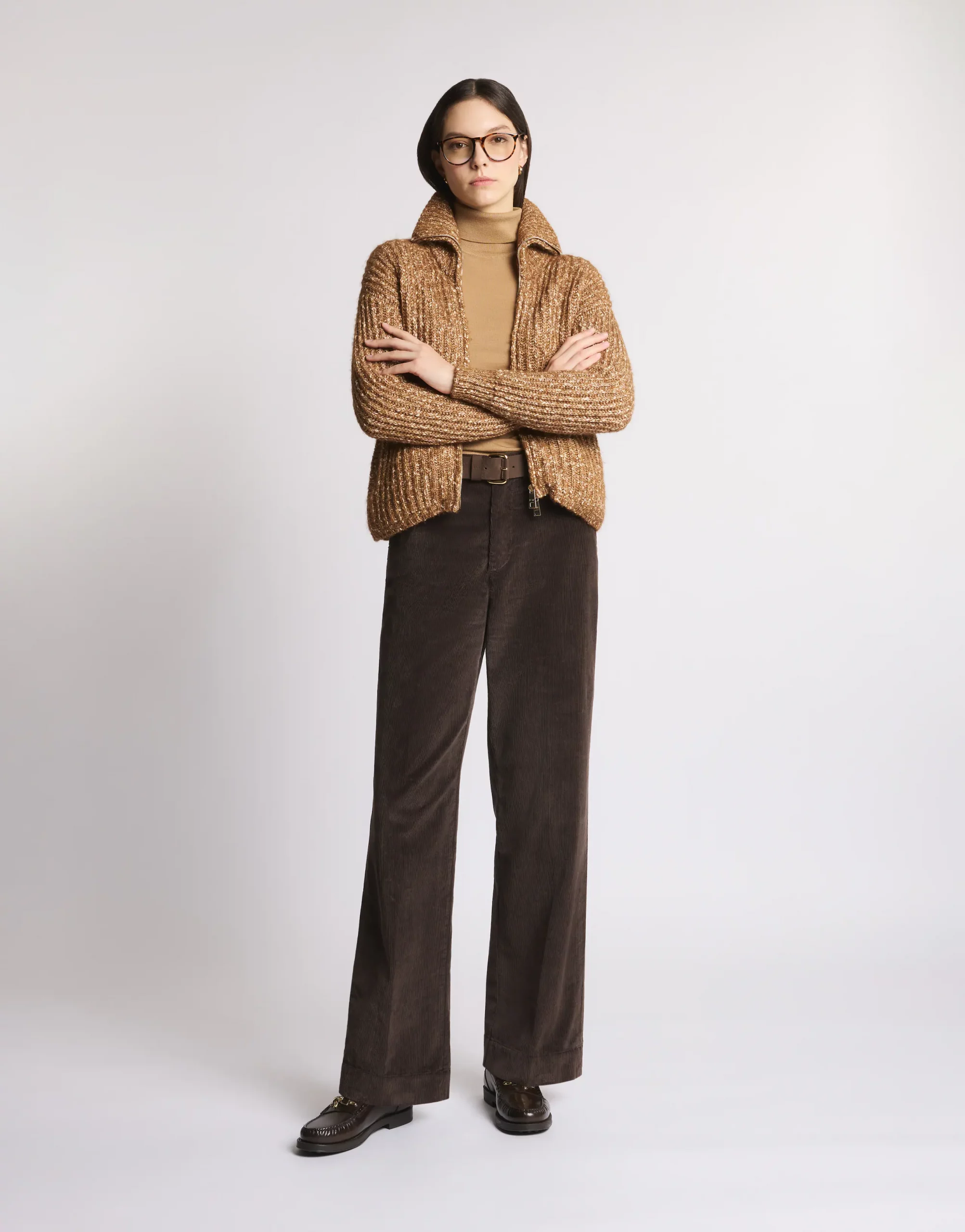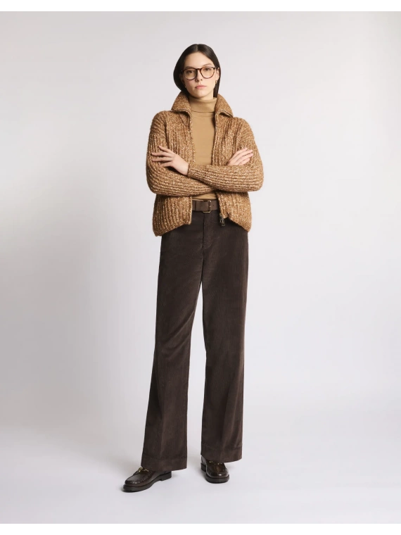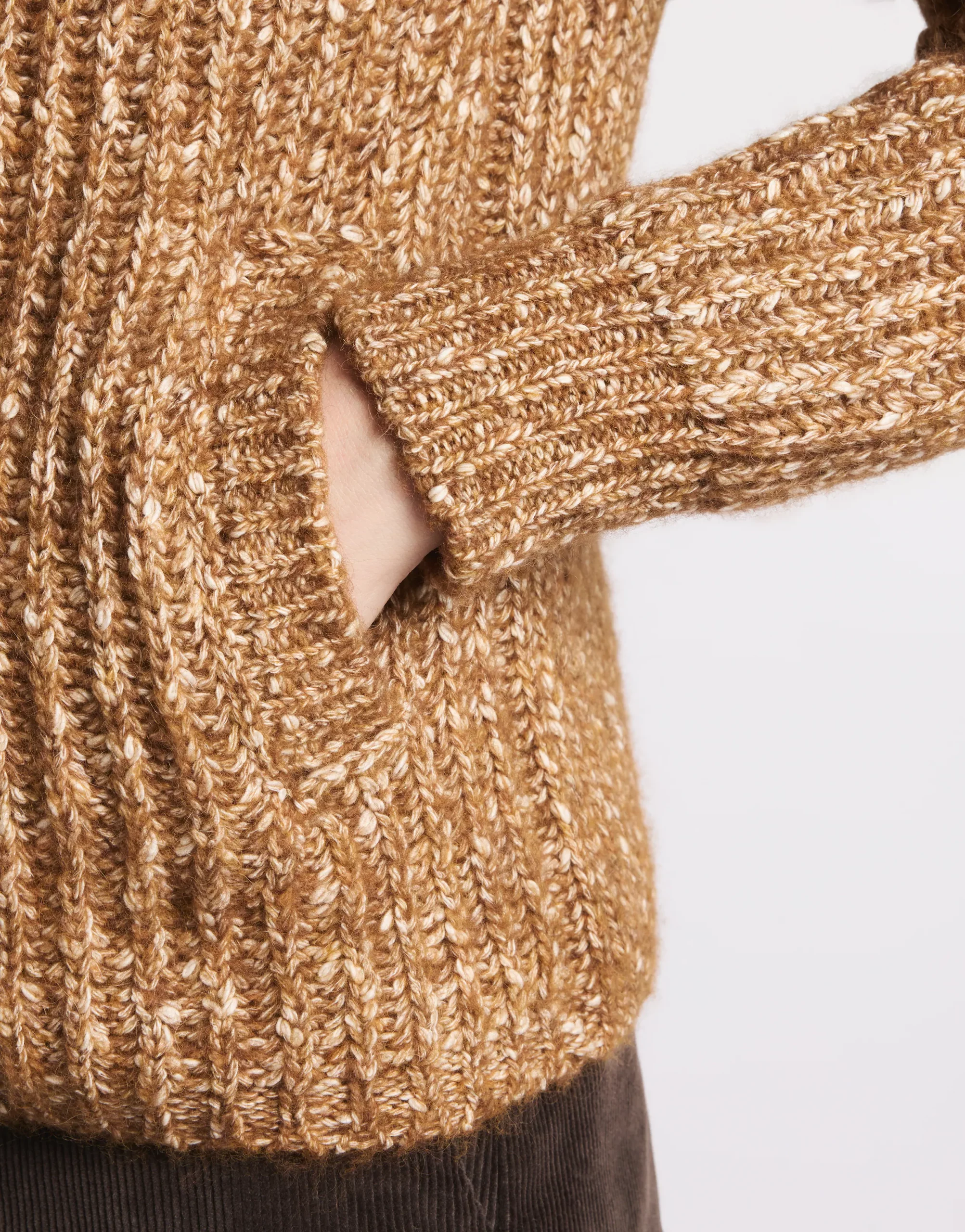 Bomber realizado en punto melange de algodón, lana y alpaca con elaboración acanalada. Presenta un cierre con cremallera y doble cursor, bolsillos ribeteados laterales.