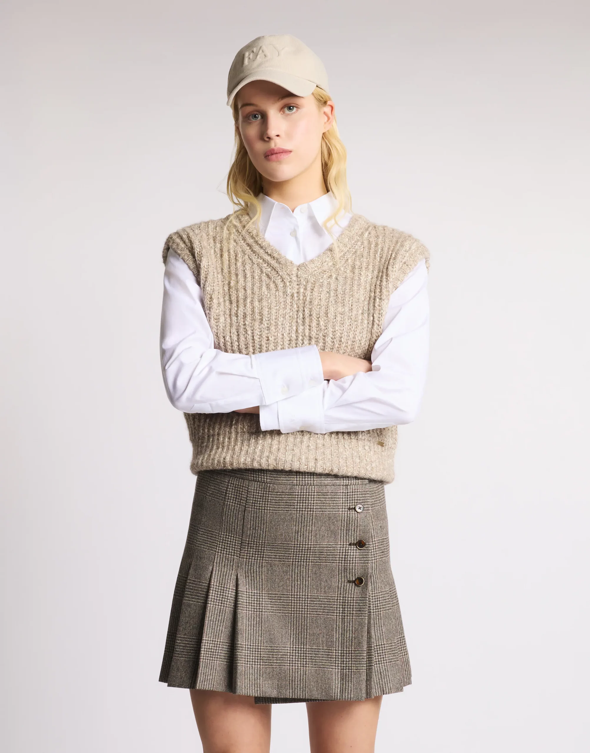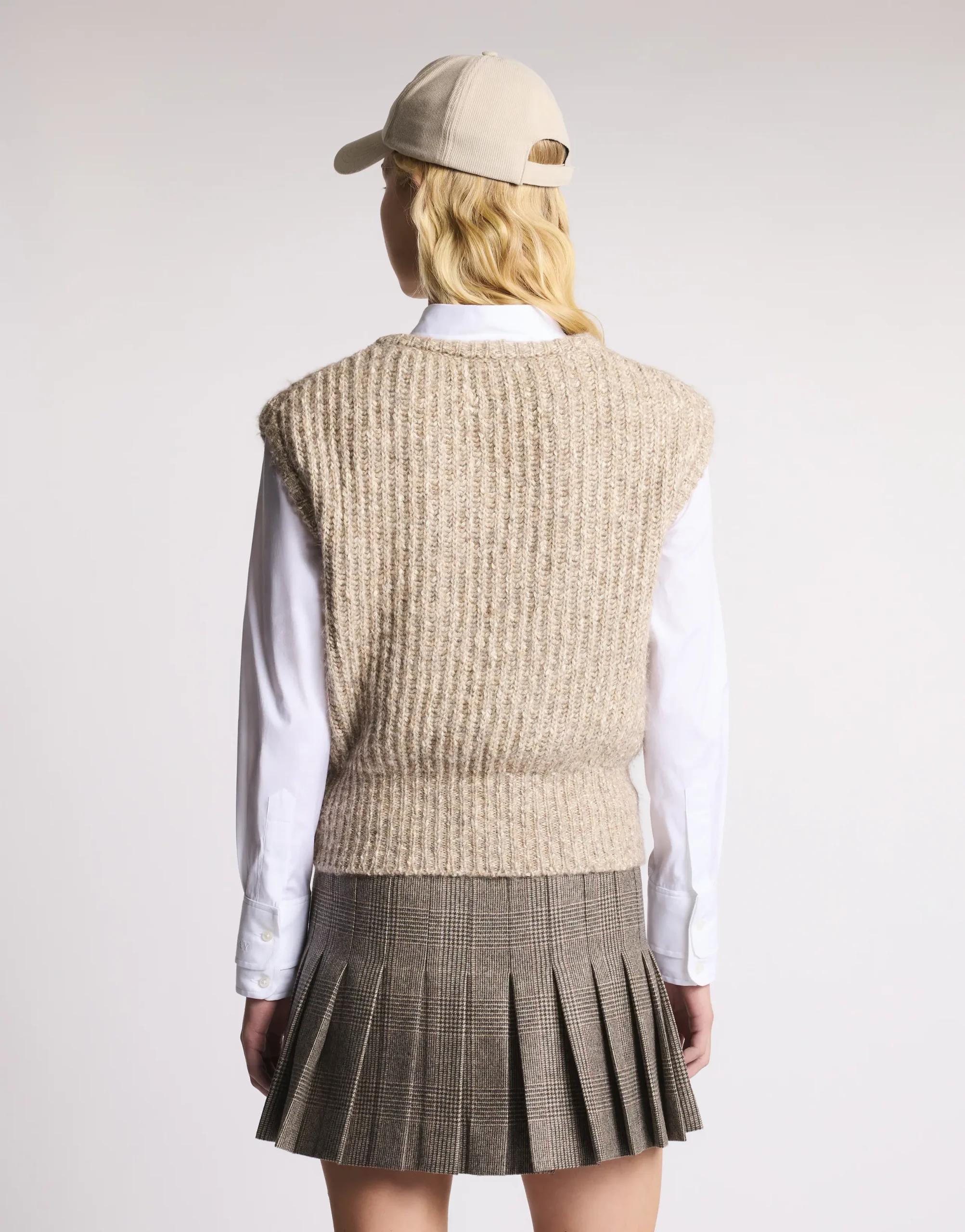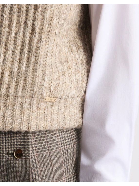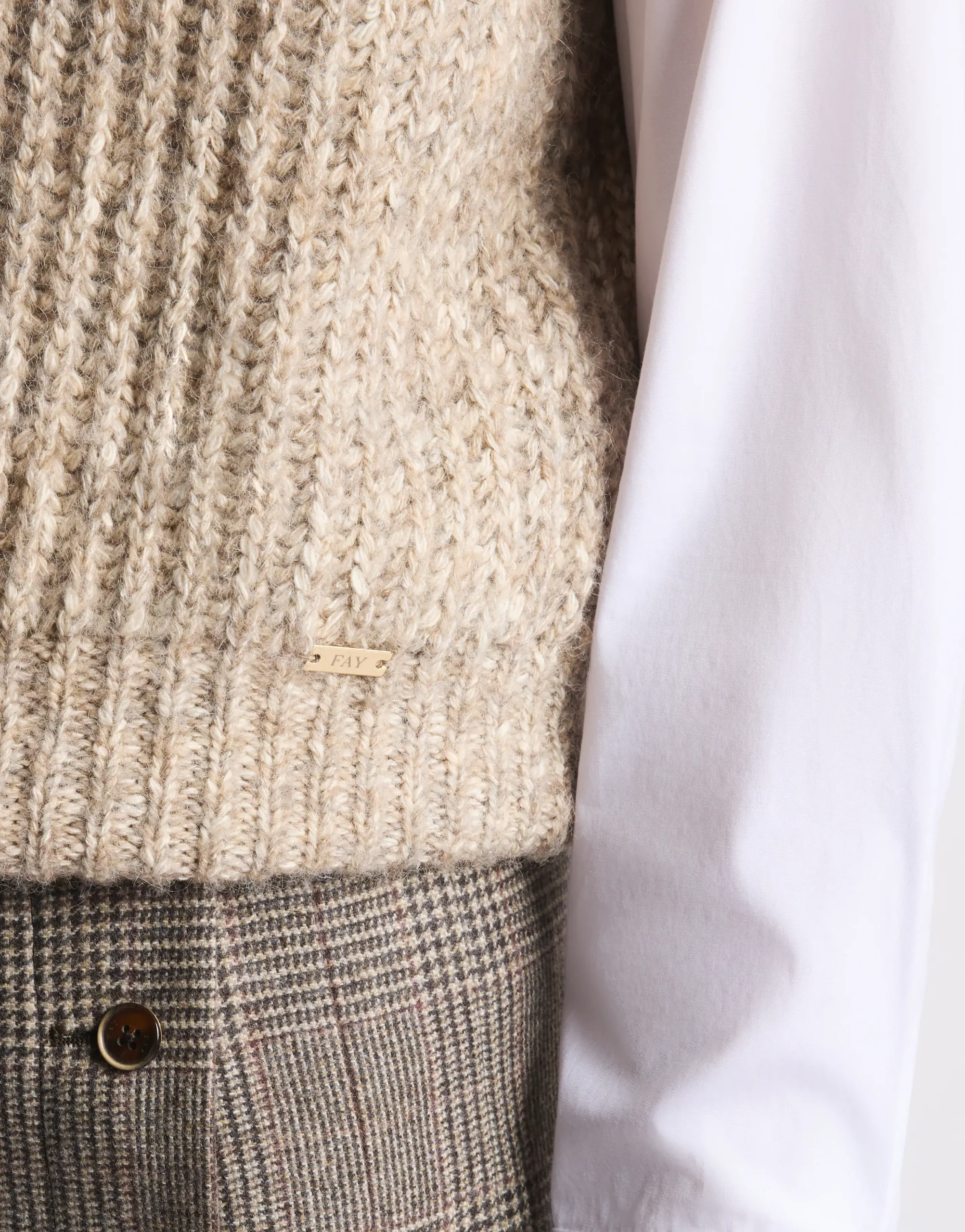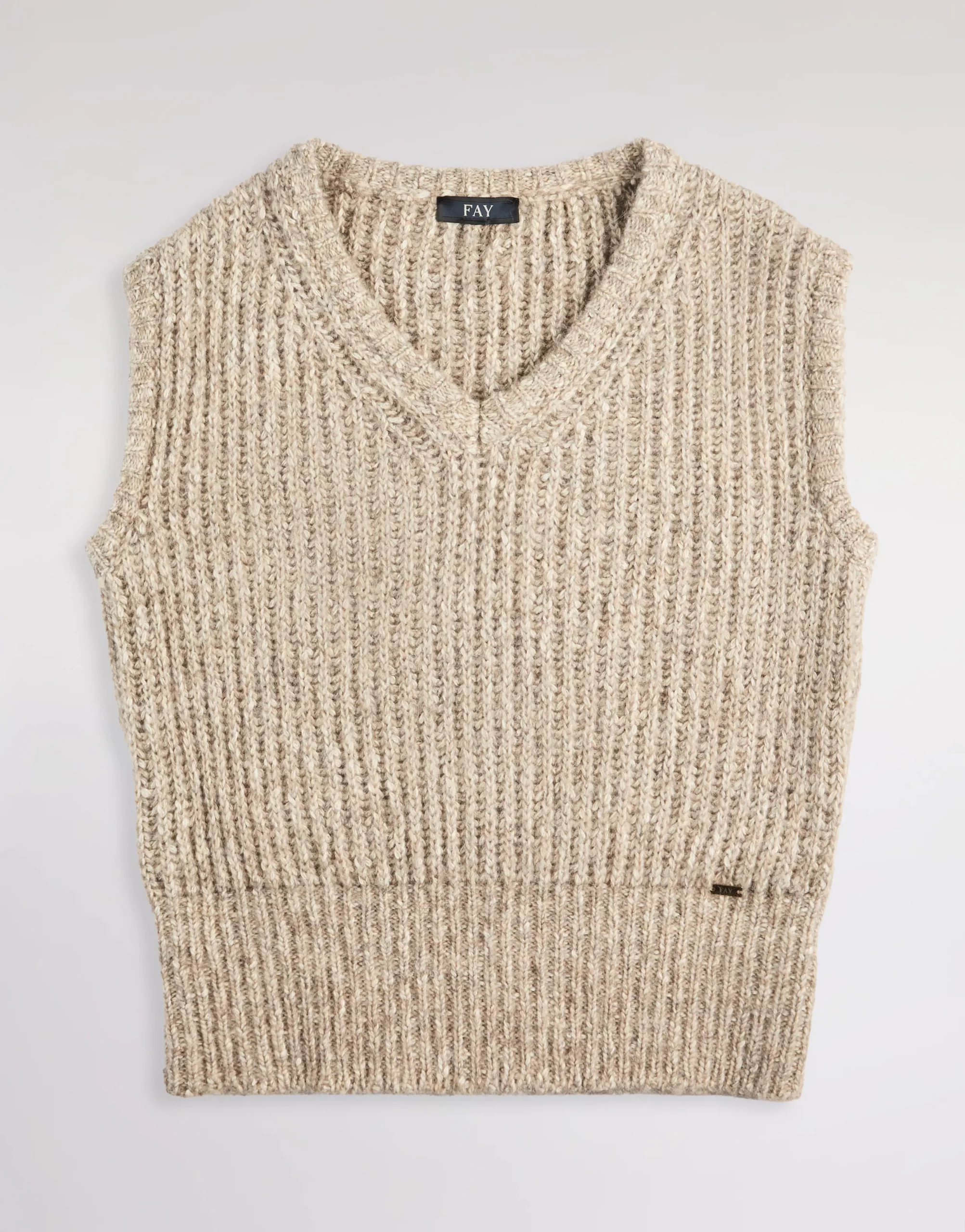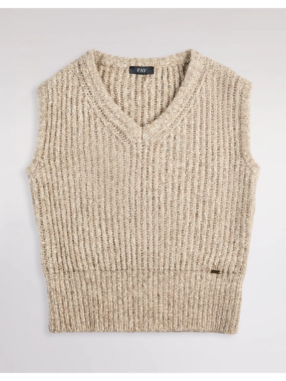 Chaleco cropped realizado en punto melange de algodón, lana y alpaca con elaboración acanalada. Presenta bordes acanalados y placa en metal con logotipo Fay.