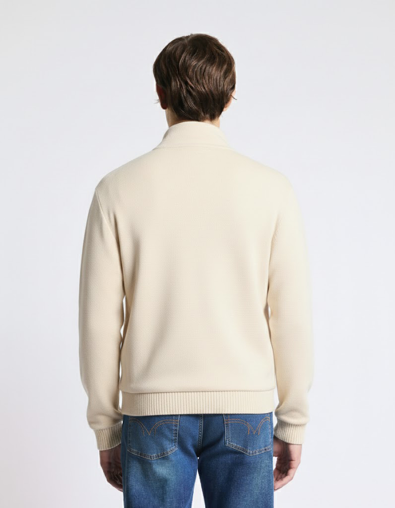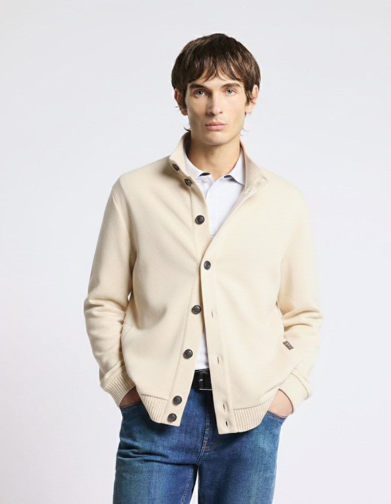 Chaqueta realizada en algodón piqué double, presenta cierre con botones. Se caracteriza por cuello elevado, puños y base en punto acanalado, completan la prenda