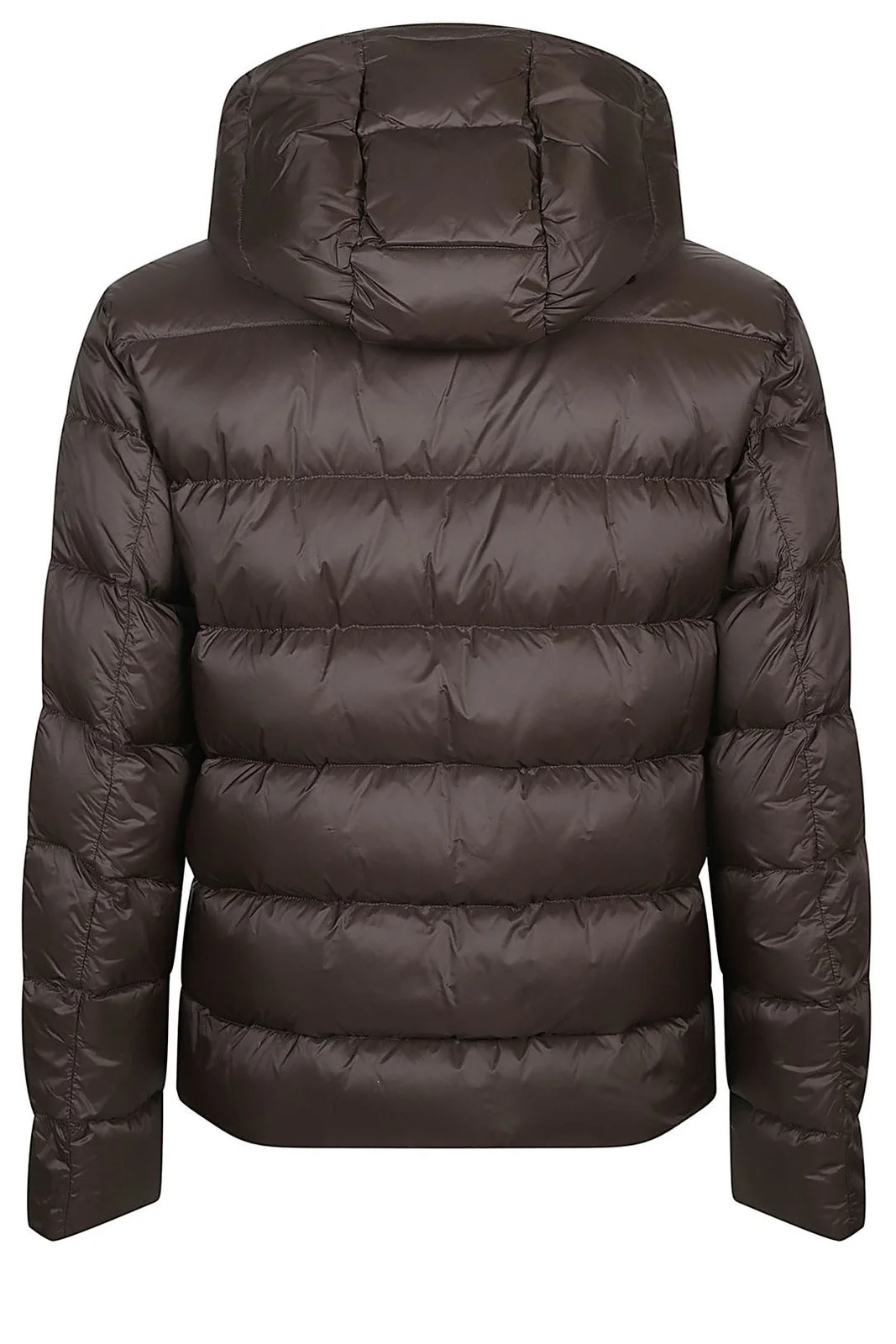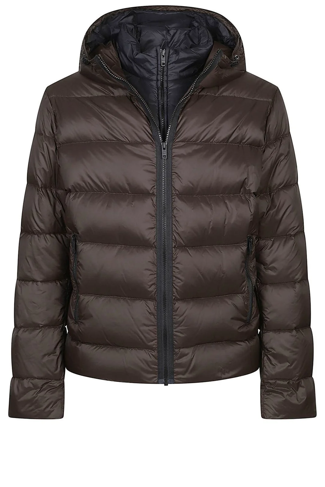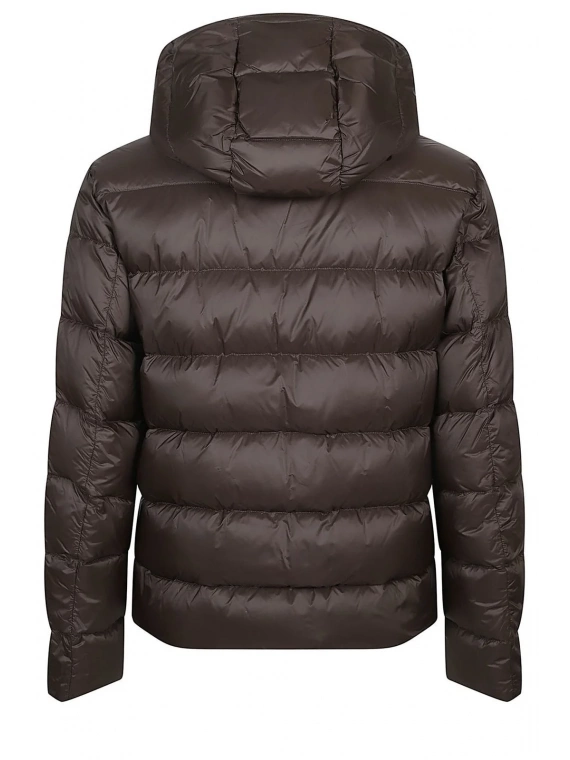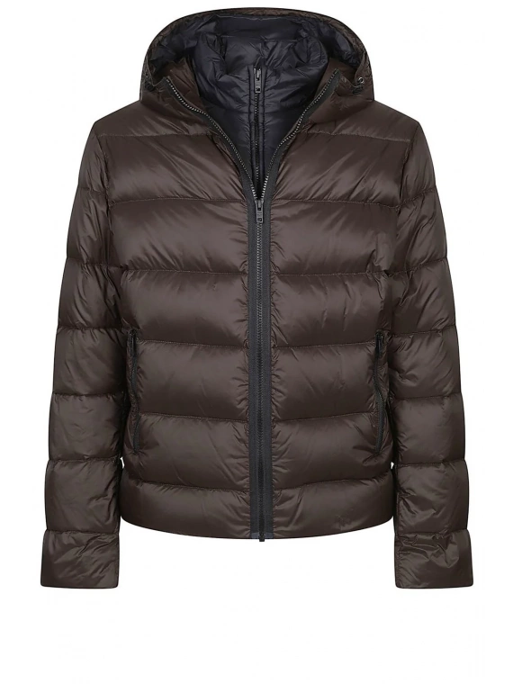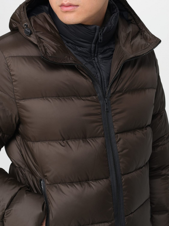 Con un corte regular y mangas largas, esta chaqueta presenta una silueta minimalista en una paleta predominantemente marrón chocolate con sutiles detalles en gris carbón. El cierre de cremallera y el diseño con capucha la convierten en una prenda esencial para salidas informales, manteniendo un estilo clásico.