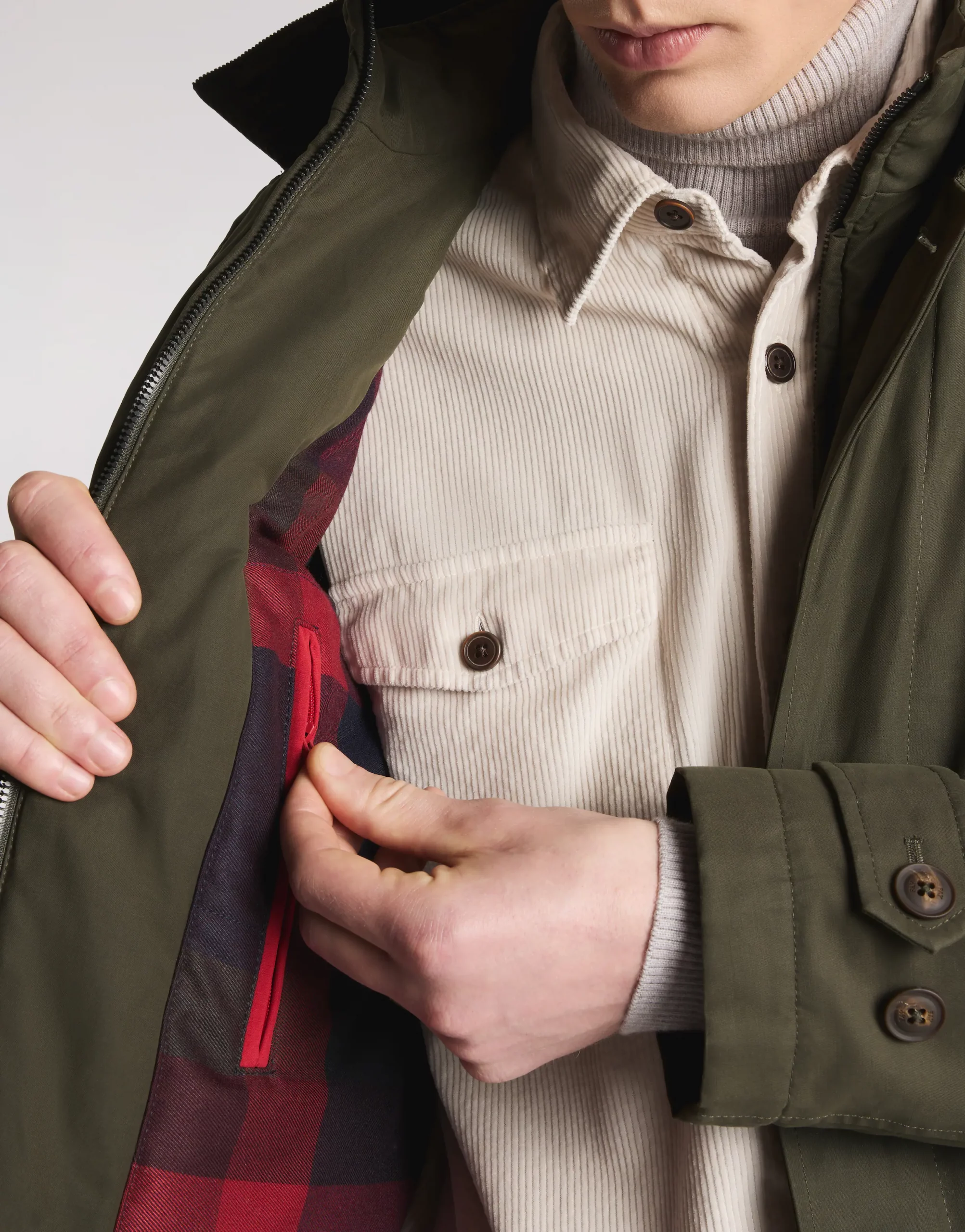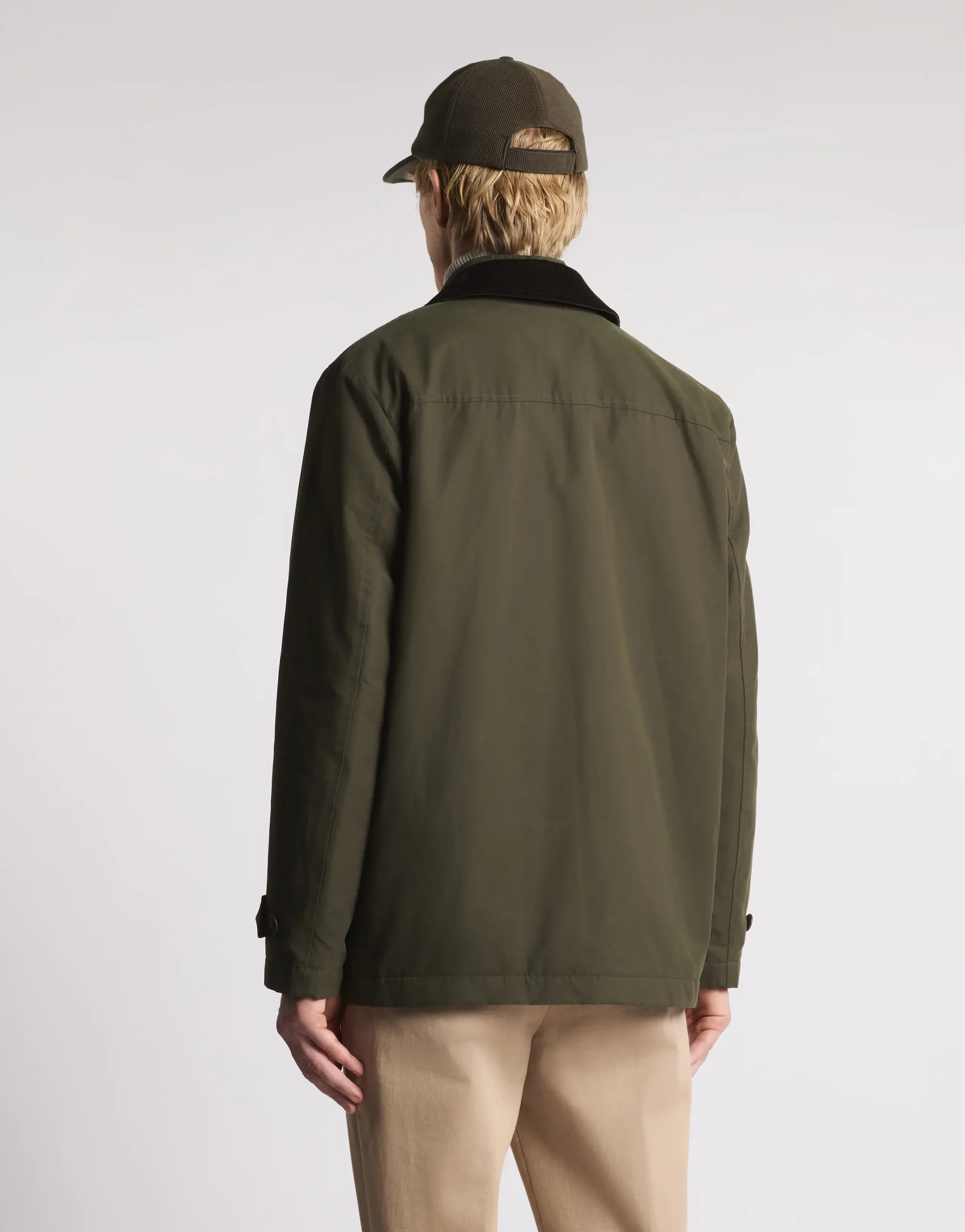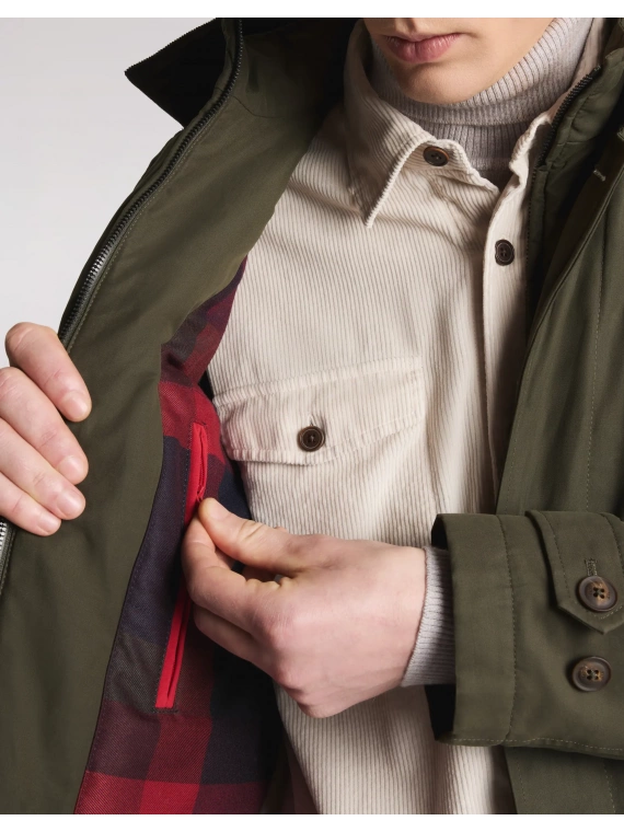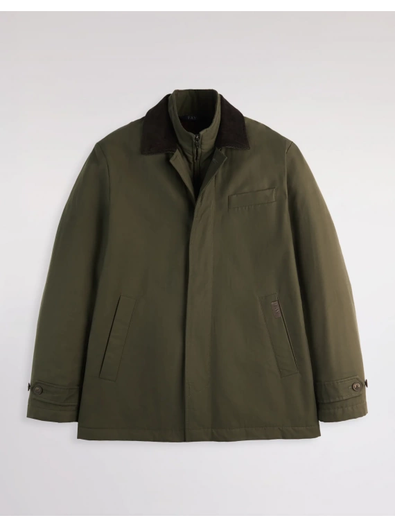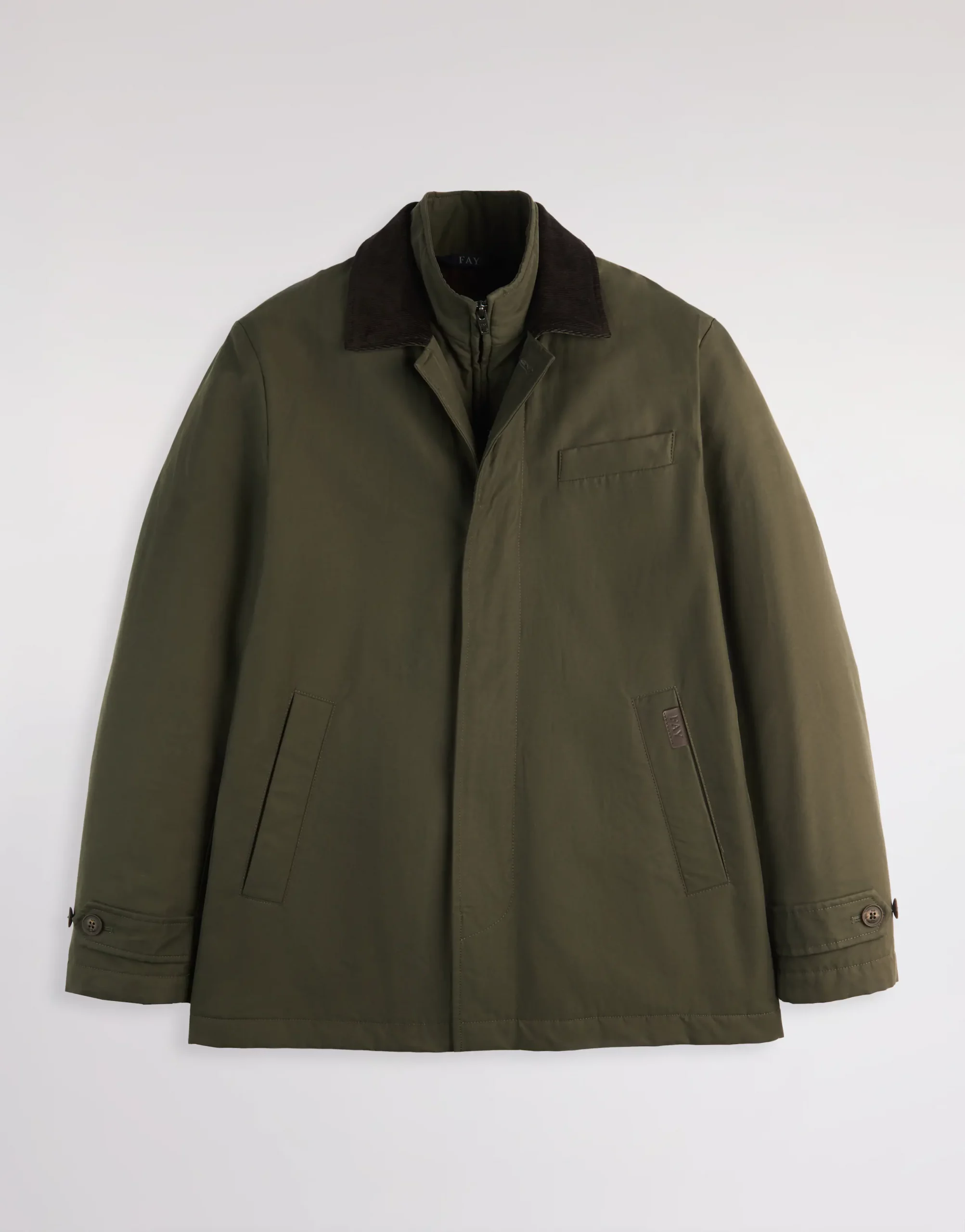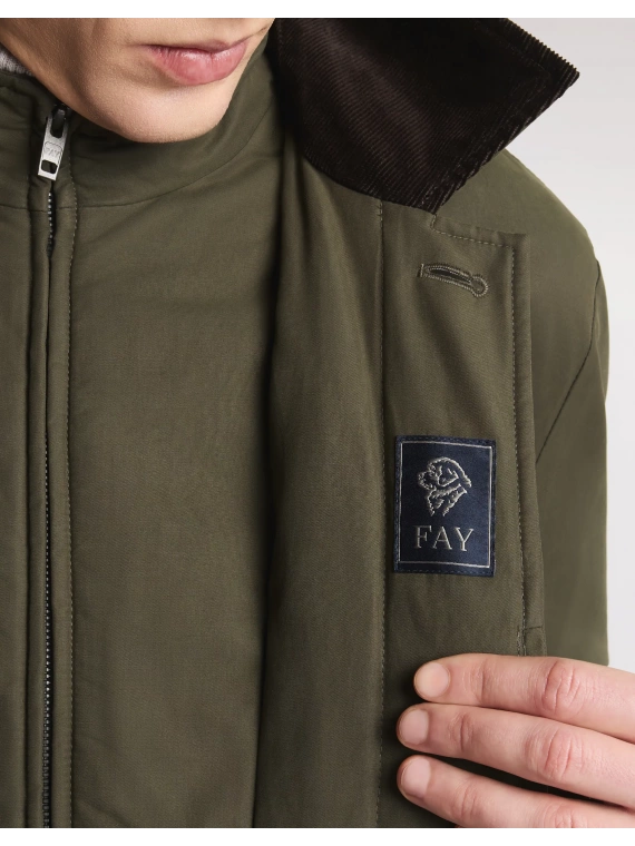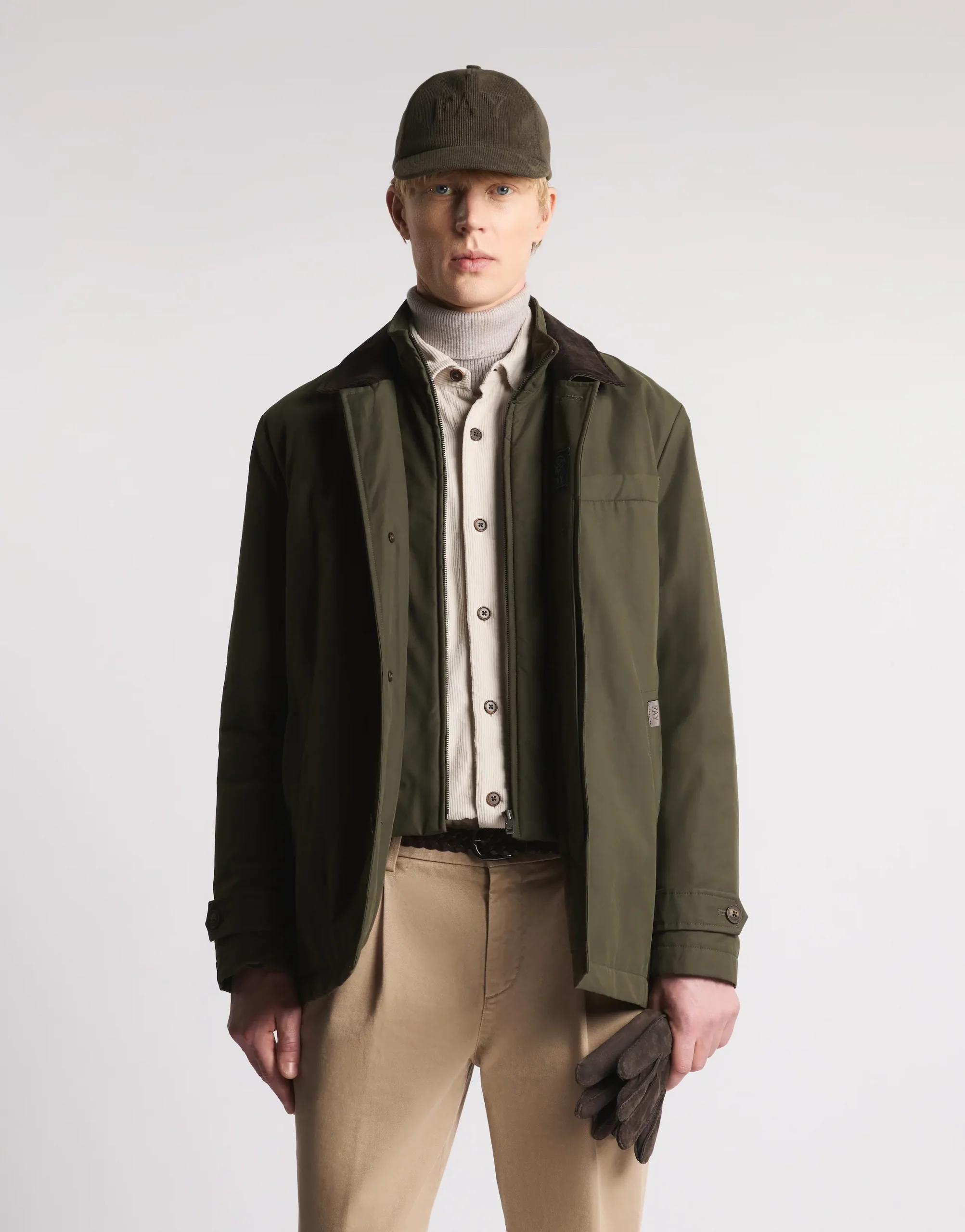 Este modelo de inspiración british presenta bolsillos ribeteados laterales, una etiqueta en piel con logotipo Fay y un bolsillo superior. Completa la prenda un cierre con cremallera, botones ocultos y un práctico bolsillo interior.