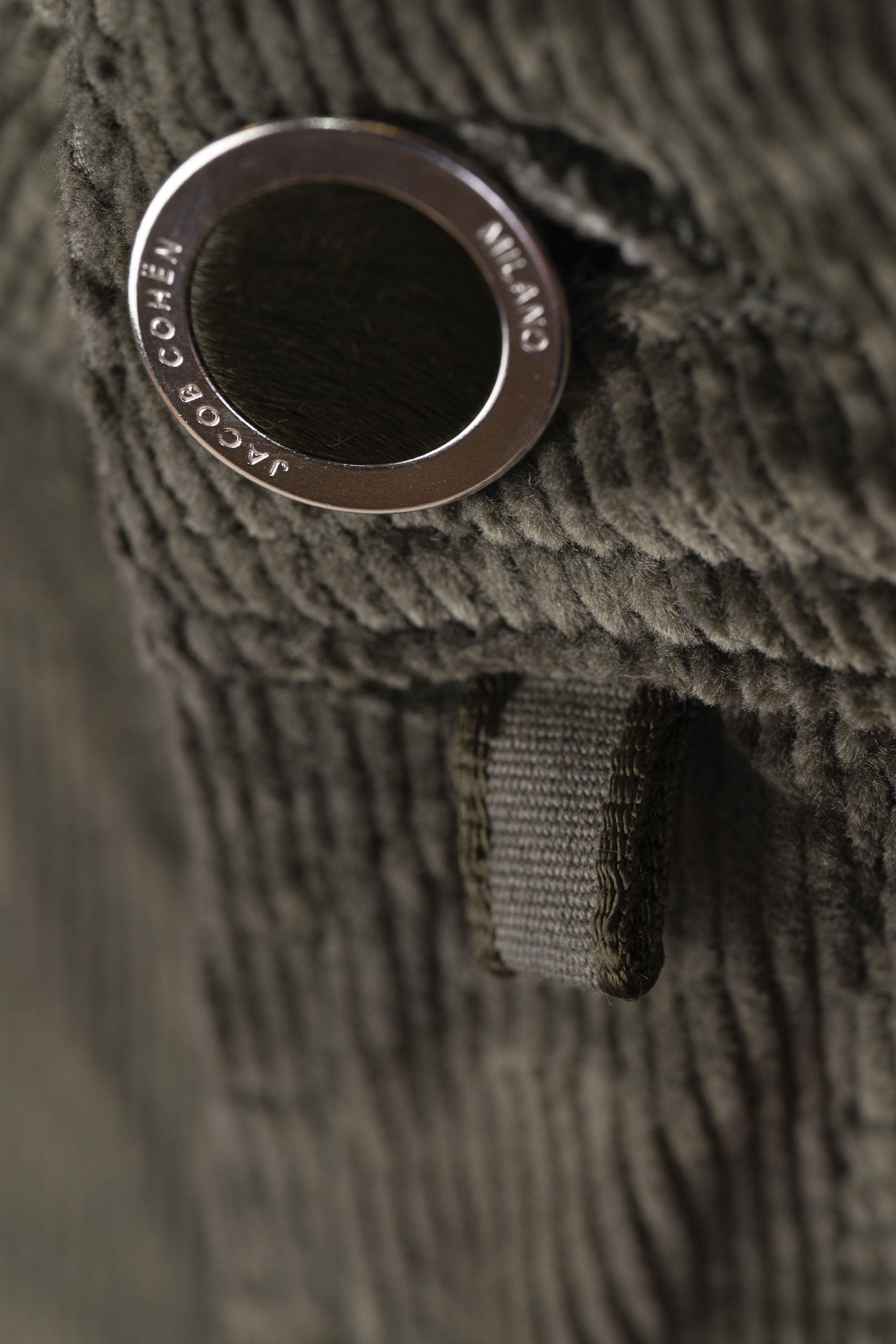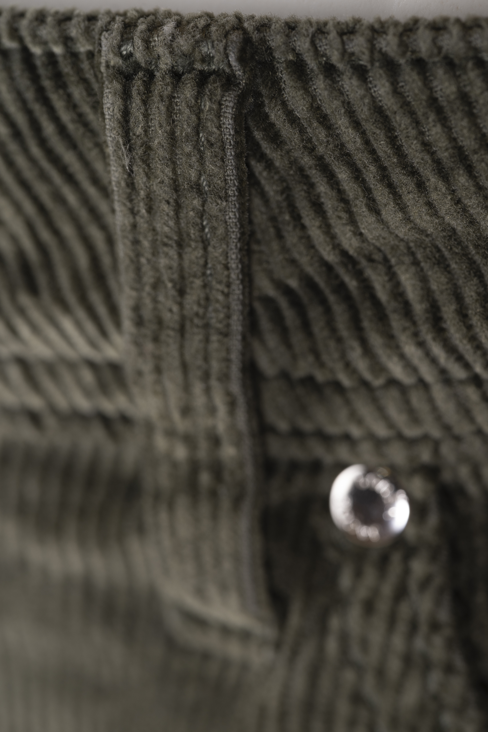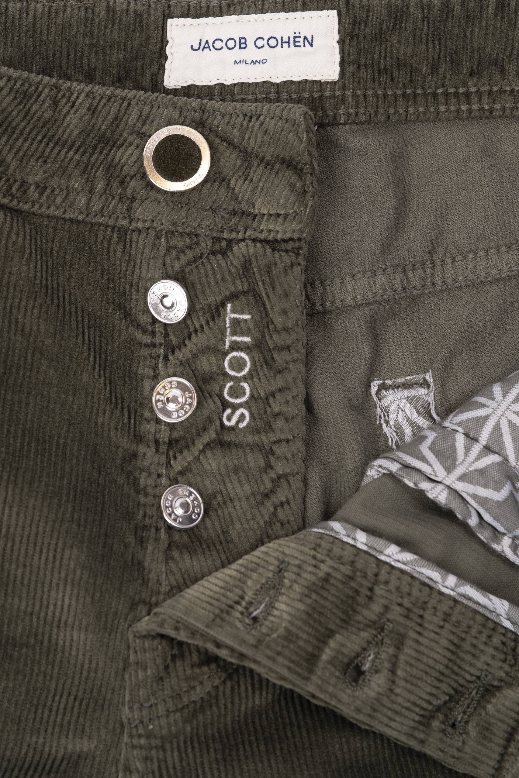 Pantalón Scott de cinco bolsillos, corte zanahoria cropped, ajustado y de tiro bajo. Hechos de pana elástica azul marino, mezcla de algodón y modal, teñidos en prenda. Parche trasero de pelo de becerro azul con logotipo bordado. Incluye pañuelo con estampado de mosaico y carrete de hilo. Bordado con el nombre del modelo y la cita del fundador en la placa interior.