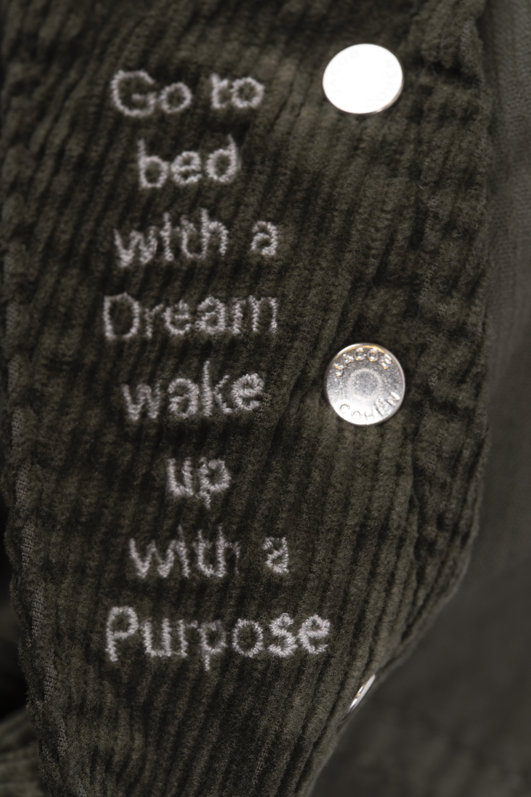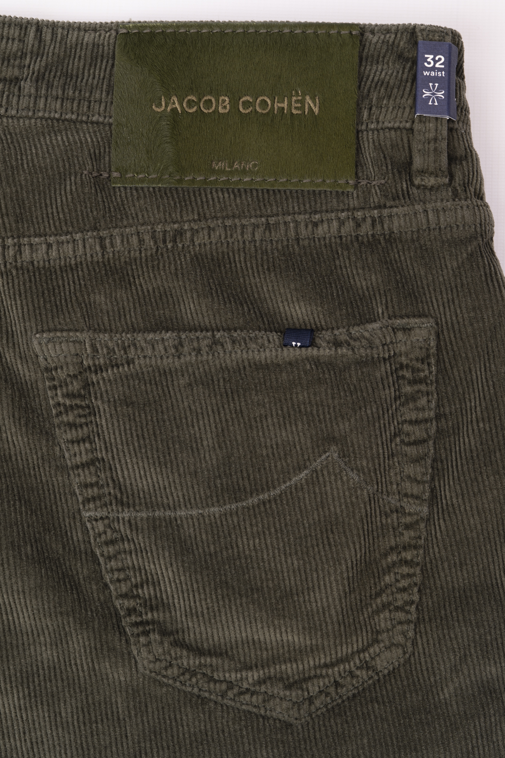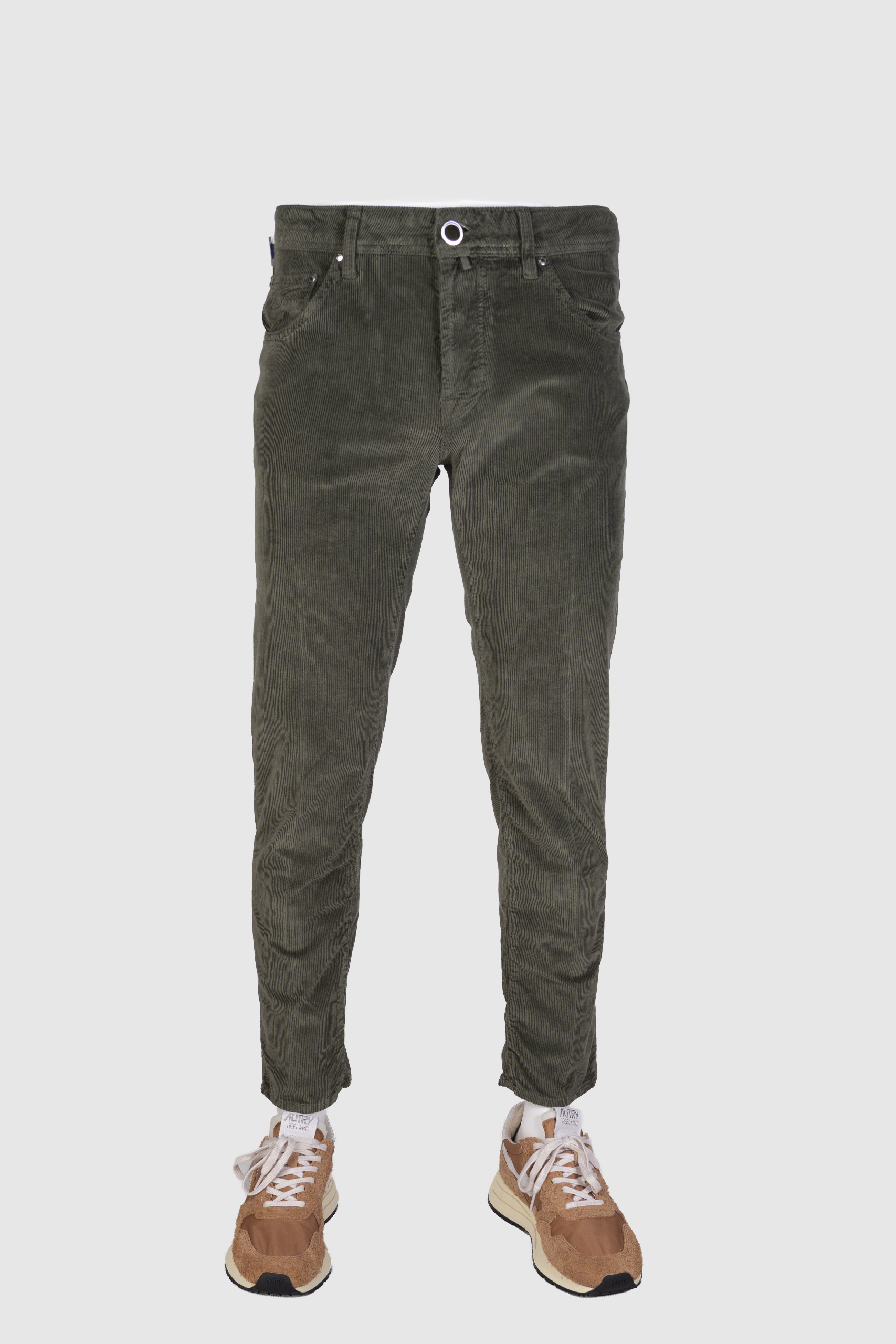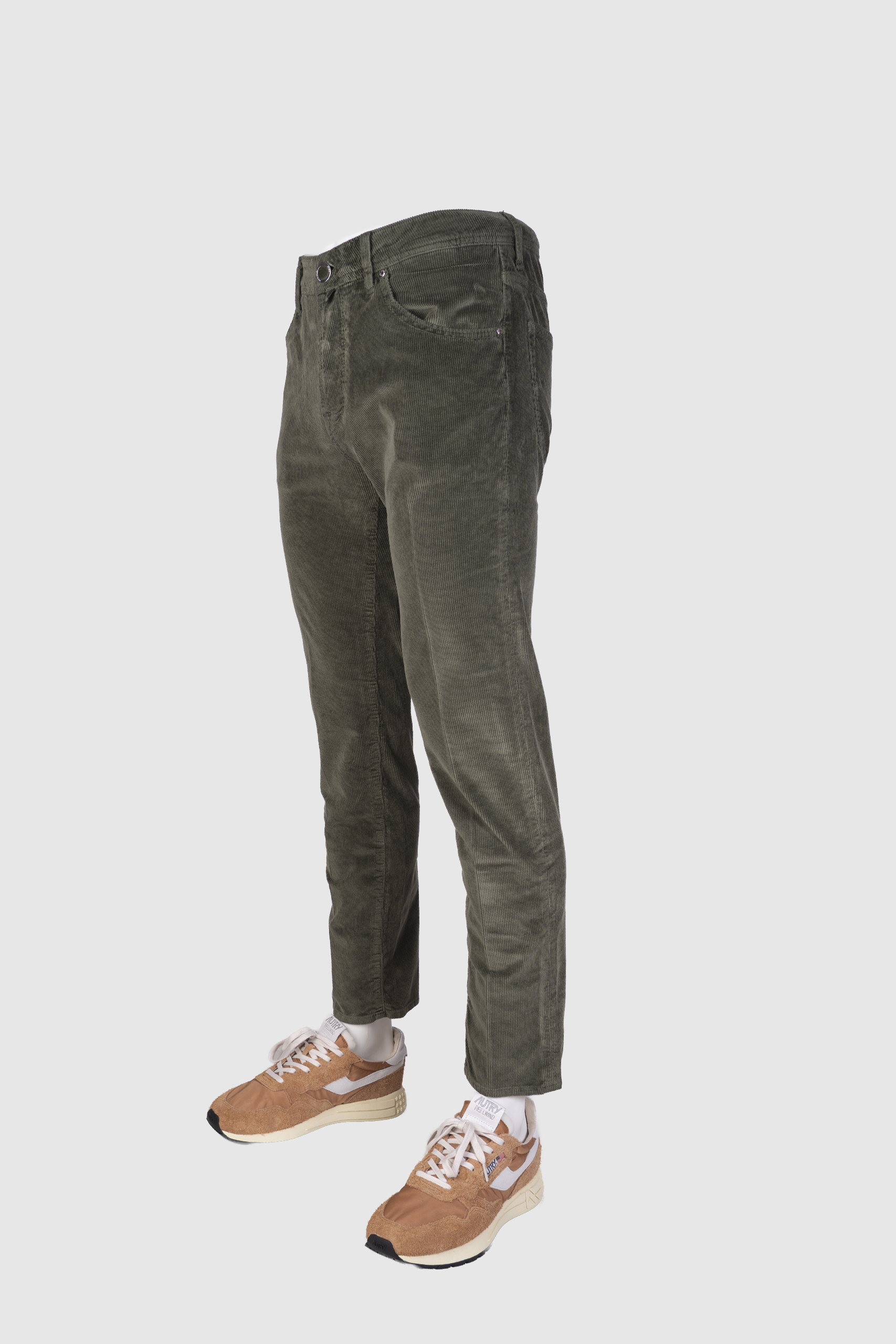 Pantalón Scott de cinco bolsillos, corte zanahoria cropped, ajustado y de tiro bajo. Hechos de pana elástica azul marino, mezcla de algodón y modal, teñidos en prenda. Parche trasero de pelo de becerro azul con logotipo bordado. Incluye pañuelo con estampado de mosaico y carrete de hilo. Bordado con el nombre del modelo y la cita del fundador en la placa interior.