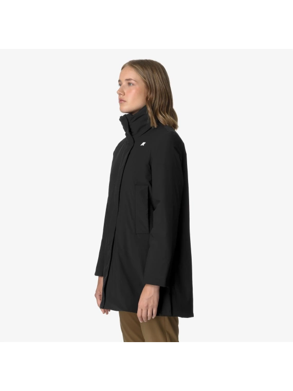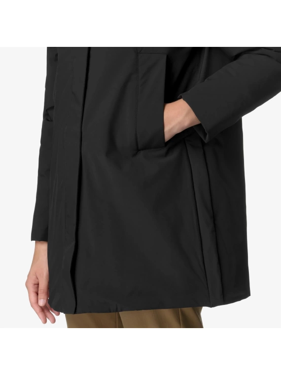 Marla es una chaqueta de longitud tres cuartos para mujer que interpreta las prendas de abrigo clásicas, funcionales y urbanas de una manera elegante y femenina. Esta chaqueta cuenta con la capacidad de ajustar las aberturas laterales con prácticos botones a presión invisibles desde el exterior, lo que permite que la prenda pase de un estilo clásico y simple a uno femenino y llamativo. Su capucha integrada en el alto cuello, que es fácil de extraer en caso de lluvia repentina, añade una practicidad adicional. Un grado de calidez medio adecuado para otoño e invierno temprano es proporcionado por el acolchado de fibra sintética.