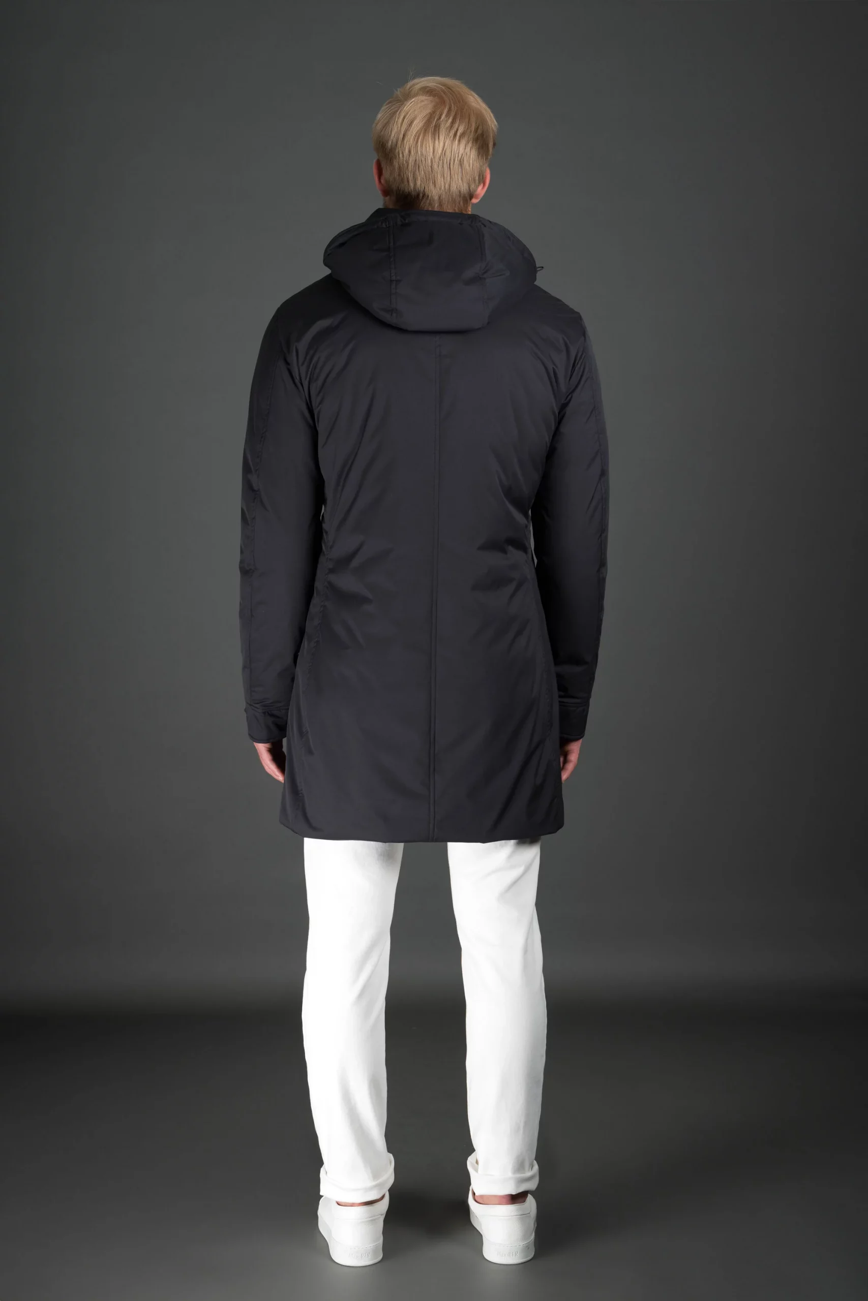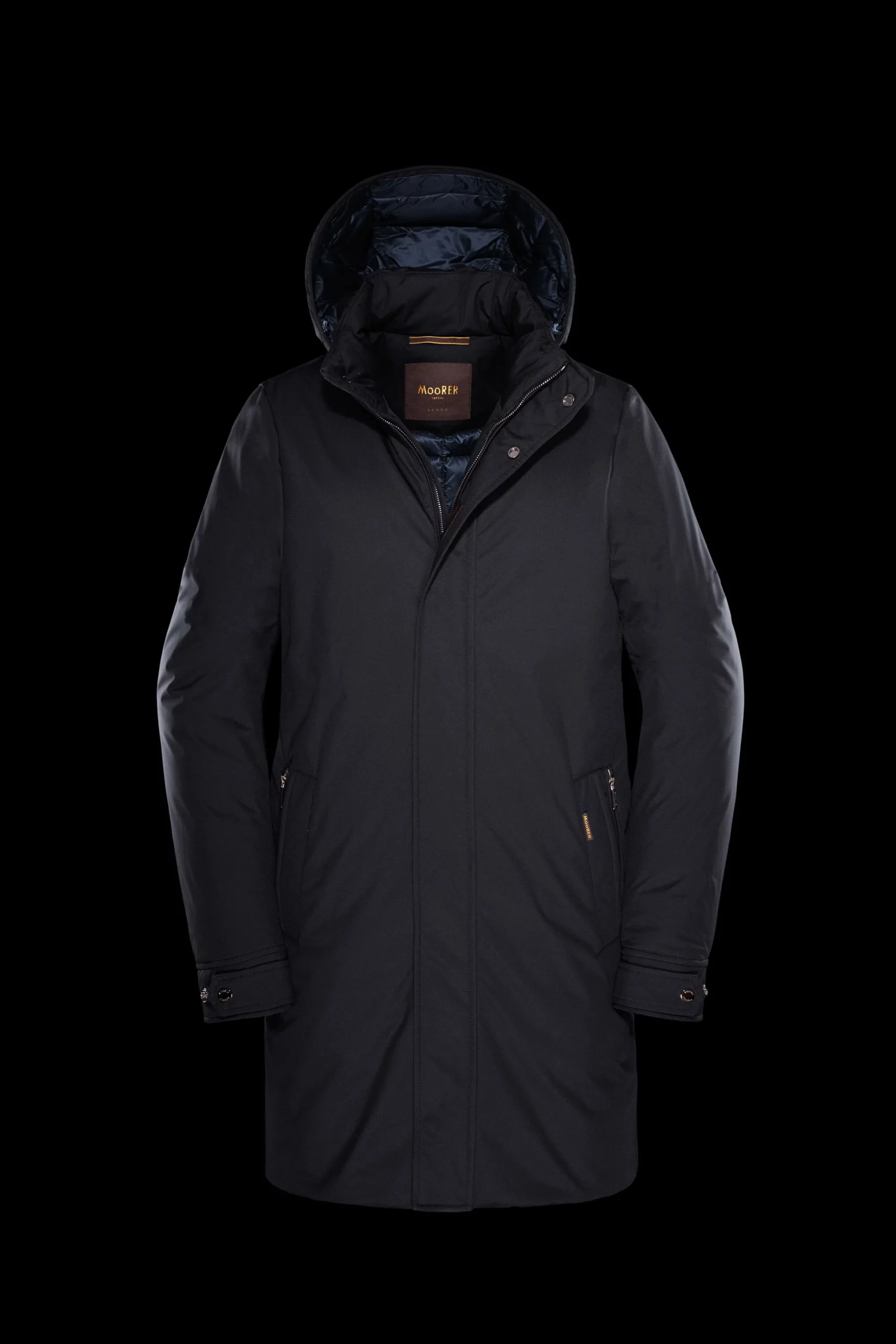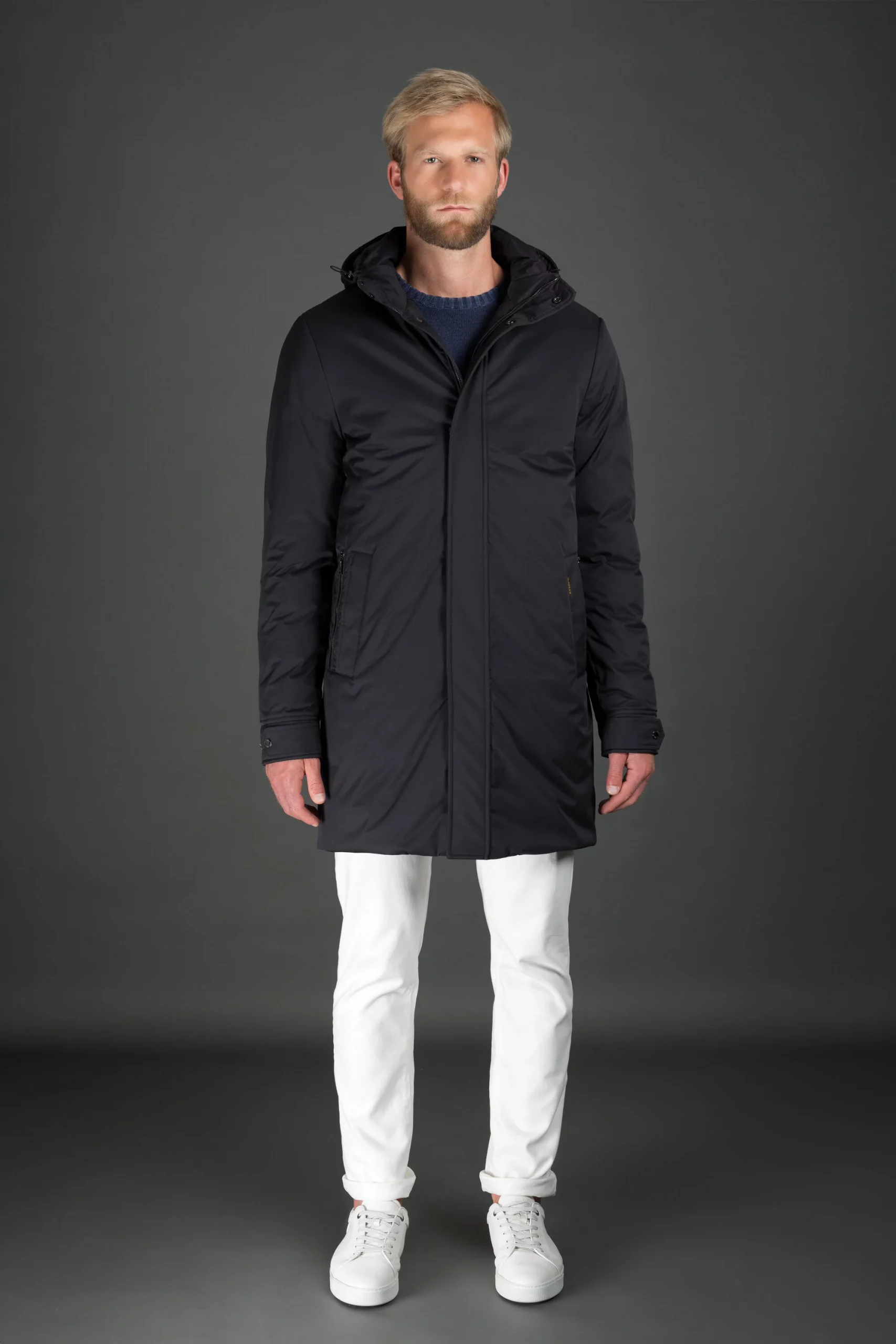 Sobretodo liso de la línea Acqua (2 paraguas). Acolchado con plumón de oca, se ha confeccionado en gabardina técnica muy fina y cómoda combinada con una membrana transpirable e impermeable.