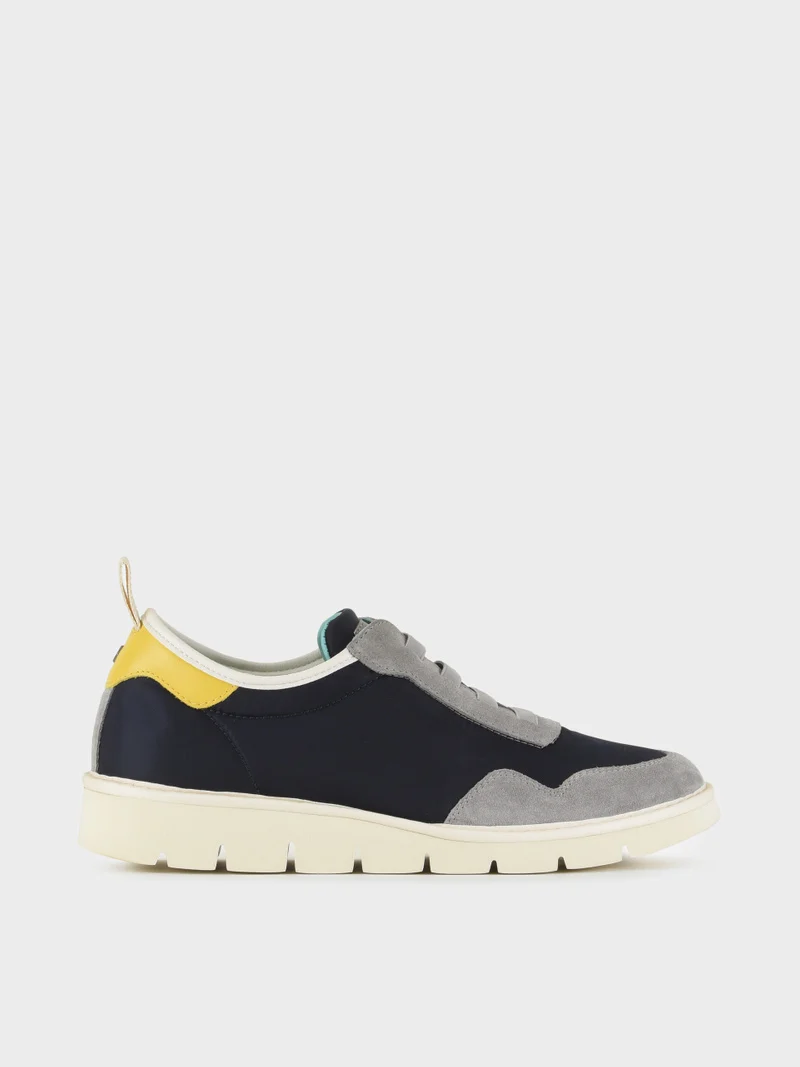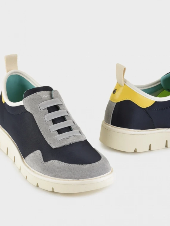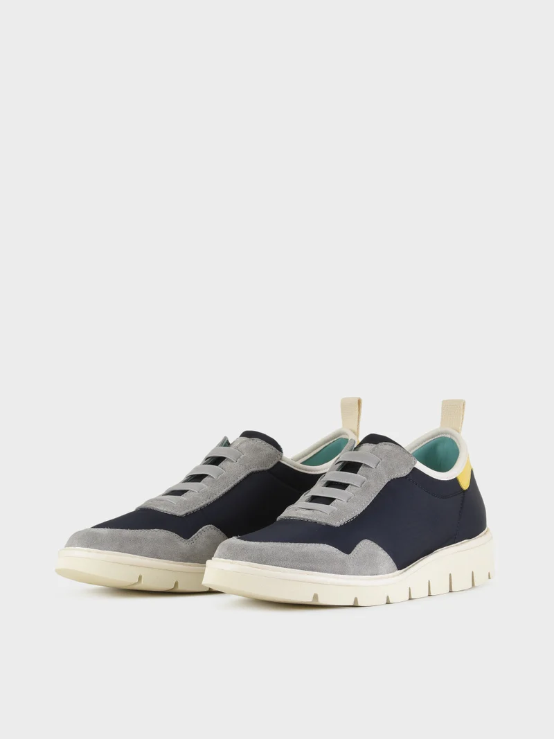 Slip On P05 con parte superior de nailon cobalto, inserciones de ante gris y cordones elásticos. La línea P05 combina ligereza y flexibilidad con una suela con ocho ranuras modulares y la elección de materiales de Panchic con un toque lúdico.