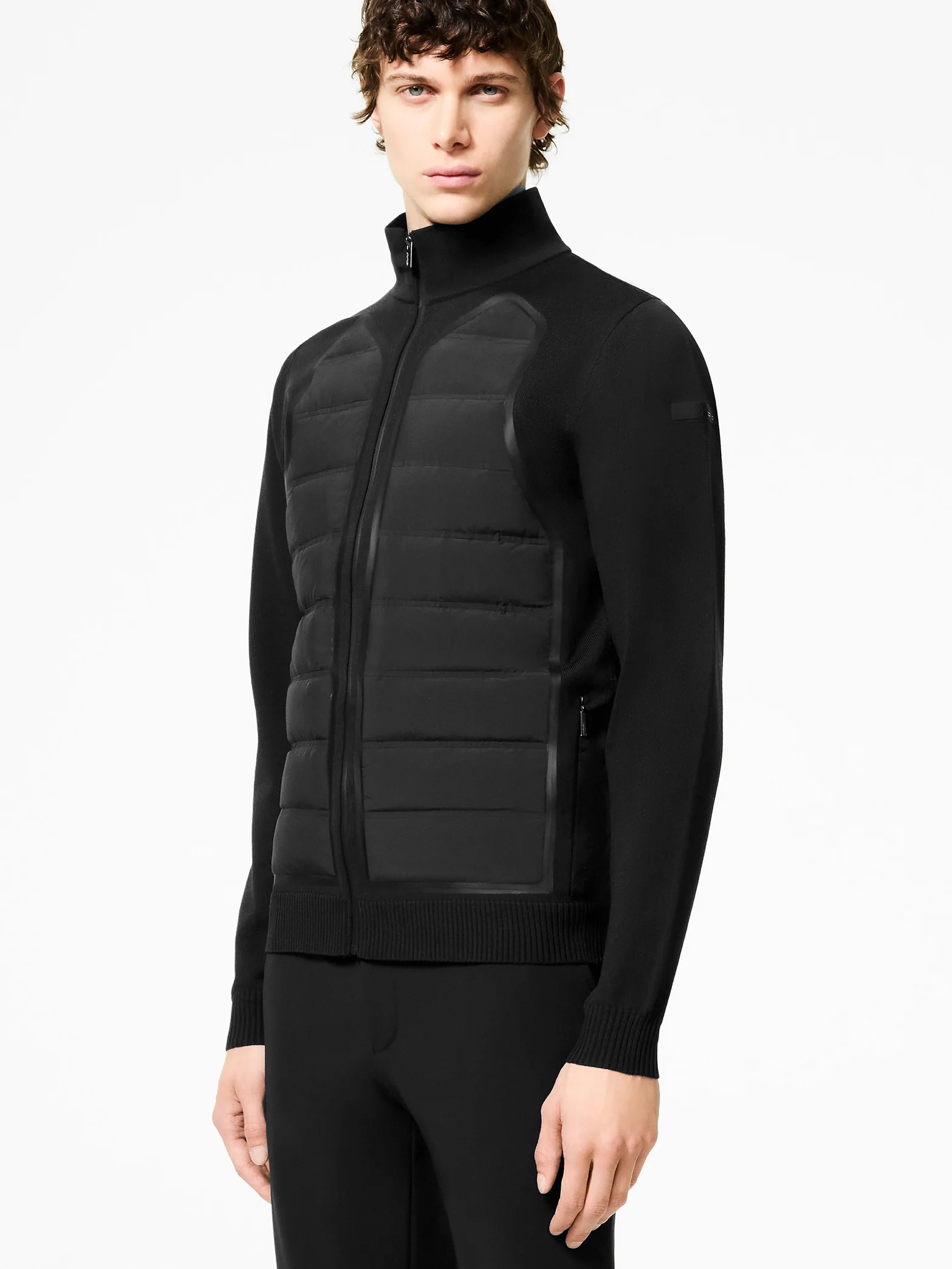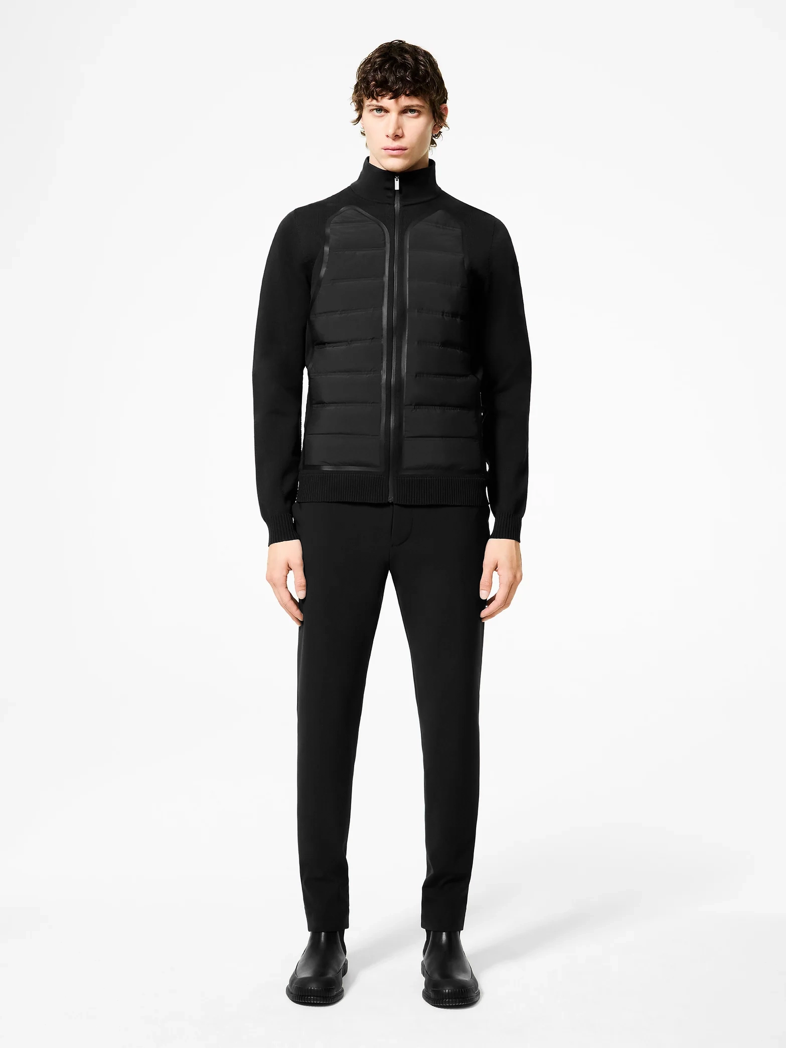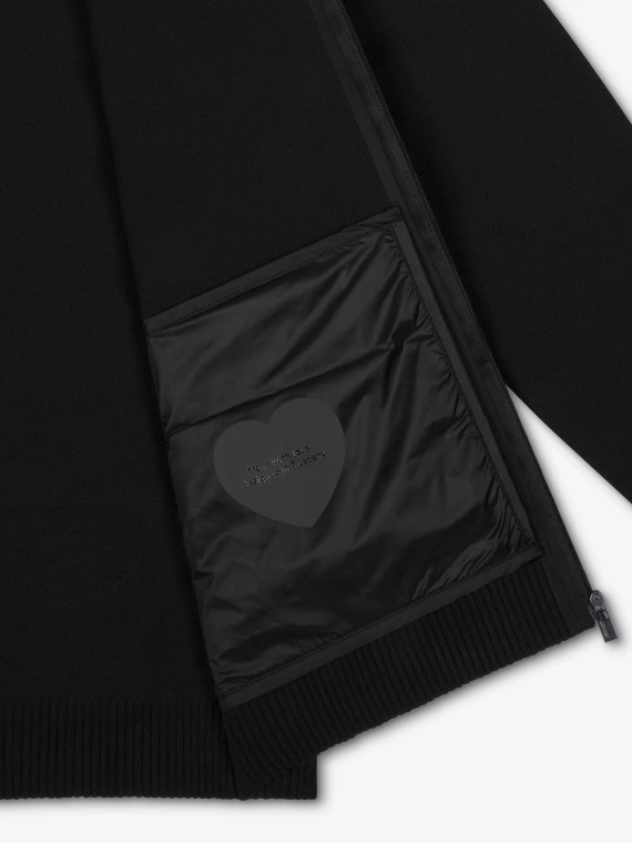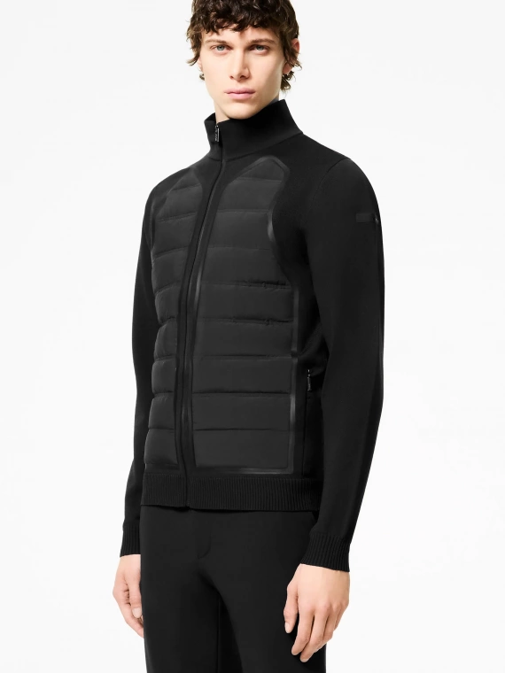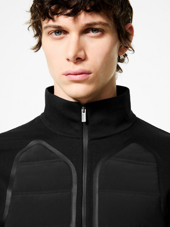 Un diseño moderno y una confección refinada distinguen a esta chaqueta monocromática de manga larga. El modelo de corte regular está confeccionado en punto liso técnico y presenta un acolchado tubular acanalado, realzado por costuras negras termoselladas, que contienen el cálido y suave relleno de plumón de pato 90/10 en la parte delantera y trasera. La tridimensionalidad y el dinamismo del diseño se ven realzados por la cremallera termosellada que sube para cerrar el cuello vertical, tejido en punto elástico inglés en puños y bajo. La cinta trasera naranja fluorescente y el logotipo negro microinyectado en la manga izquierda son los detalles distintivos de una creación que complementa a la perfección pantalones de cinco bolsillos y cargo, creando un look casual con un marcado toque urbano.