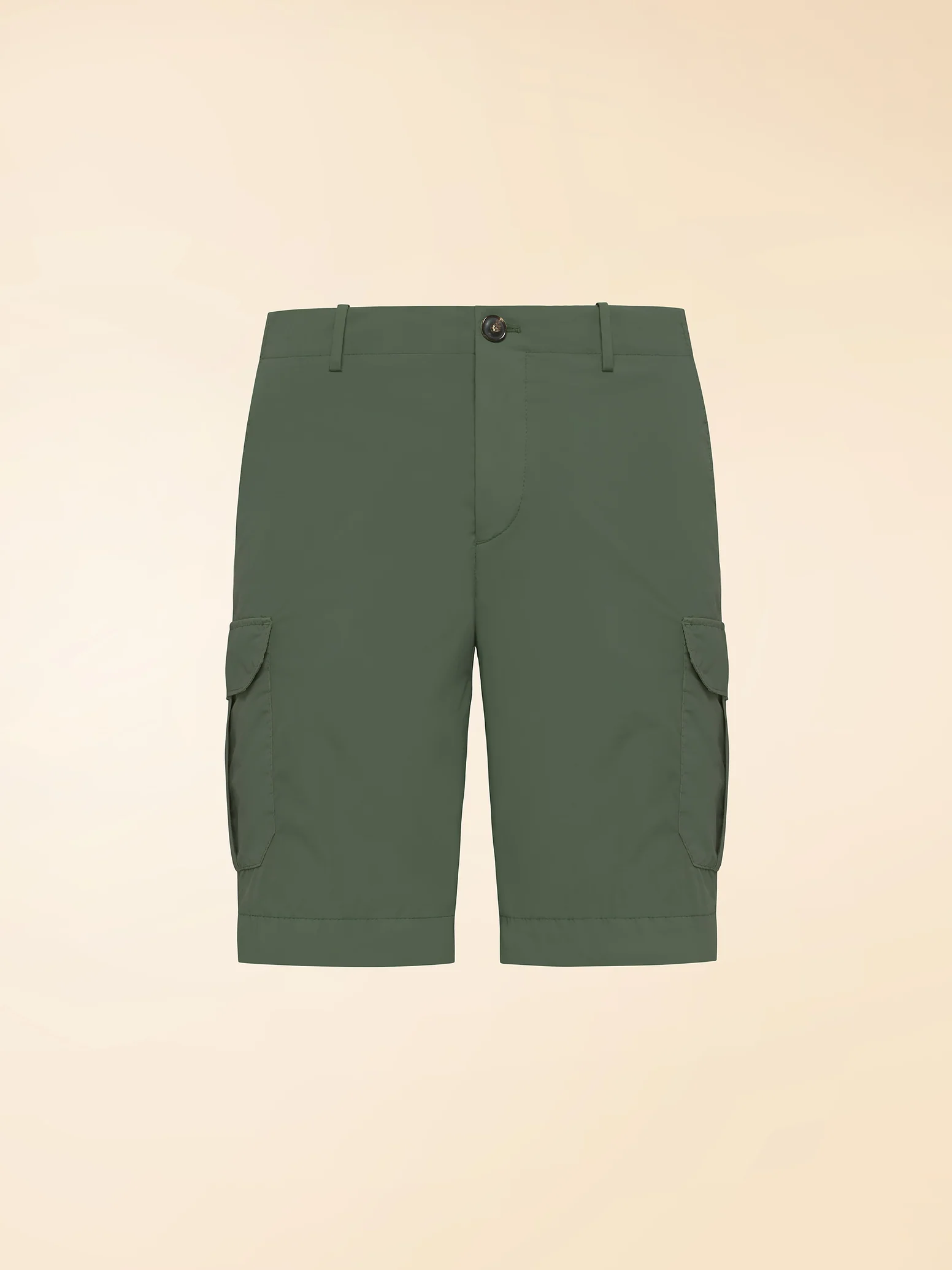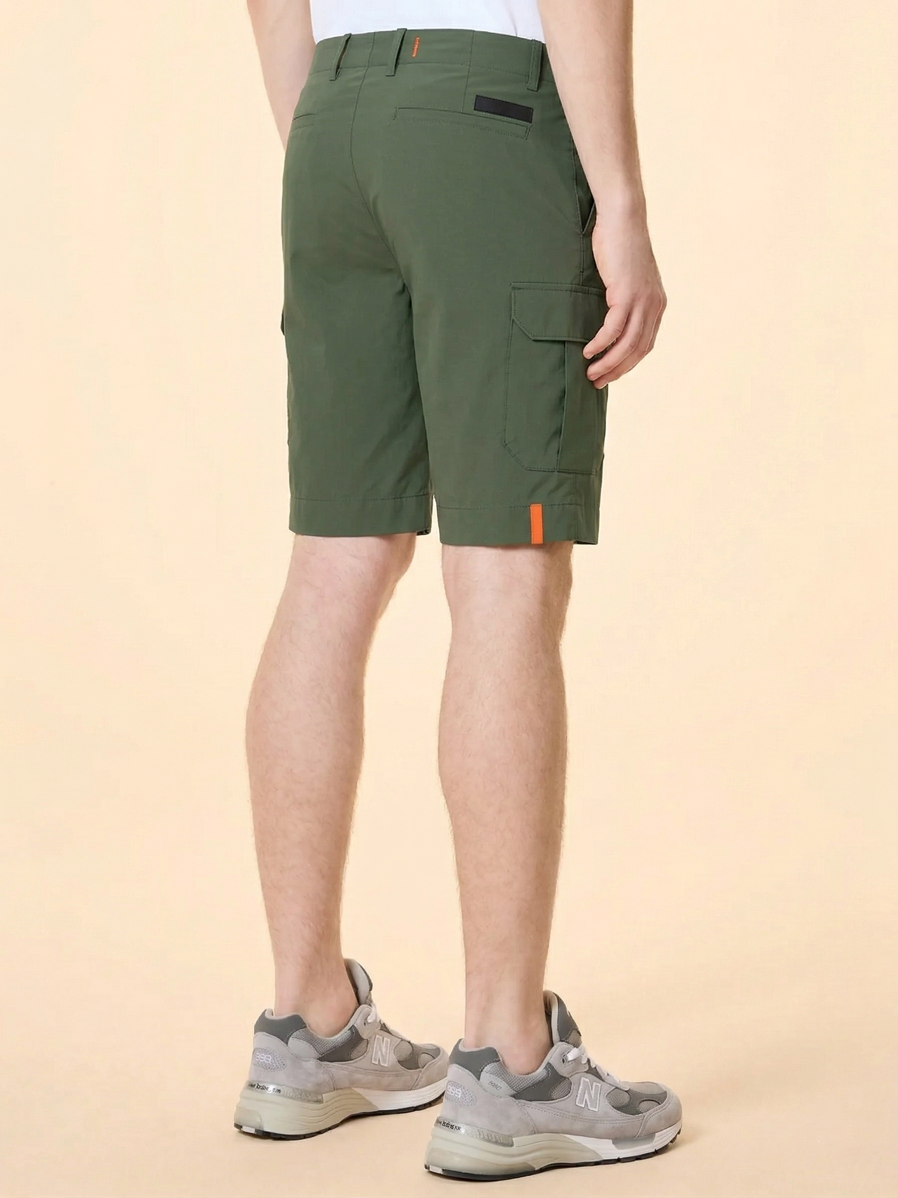 La precisión de la inspiración militar se traduce en un estilo elegante y atemporal, diseñado para acompañar los días más dinámicos de la temporada cálida con ligereza y comodidad. El nailon ligero y elástico, con un refinado efecto desgastado, revela un carácter auténtico y un estilo de inspiración vintage. Los bolsillos de fuelle en la pierna añaden un toque funcional y distintivo. La fina tapeta de botones de cuerno, oculta por una solapa frontal e integrada con la cinturilla de trabilla, subraya el cuidado sartorial puesto en la confección de este modelo. El diseño se completa con bolsillos laterales franceses y bolsillos traseros ribeteados, acentuados con el logotipo microinyectado negro característico y el detalle en el cinturón interior. Las cualidades antiarrugas, de fácil cuidado y de secado rápido del tejido de alta tecnología convierten a estos shorts en los protagonistas indiscutibles de un verano interminable, entre el horizonte urbano y la naturaleza.