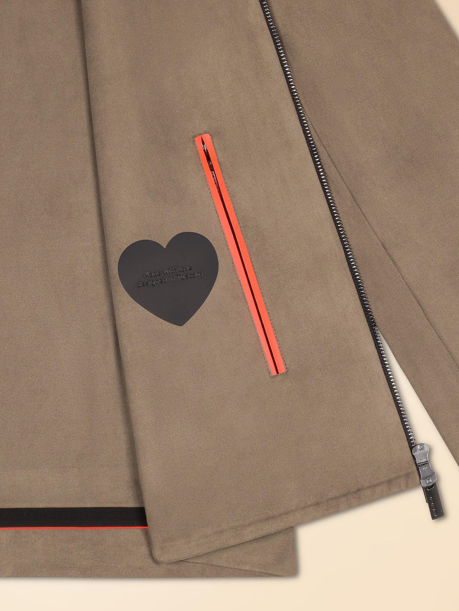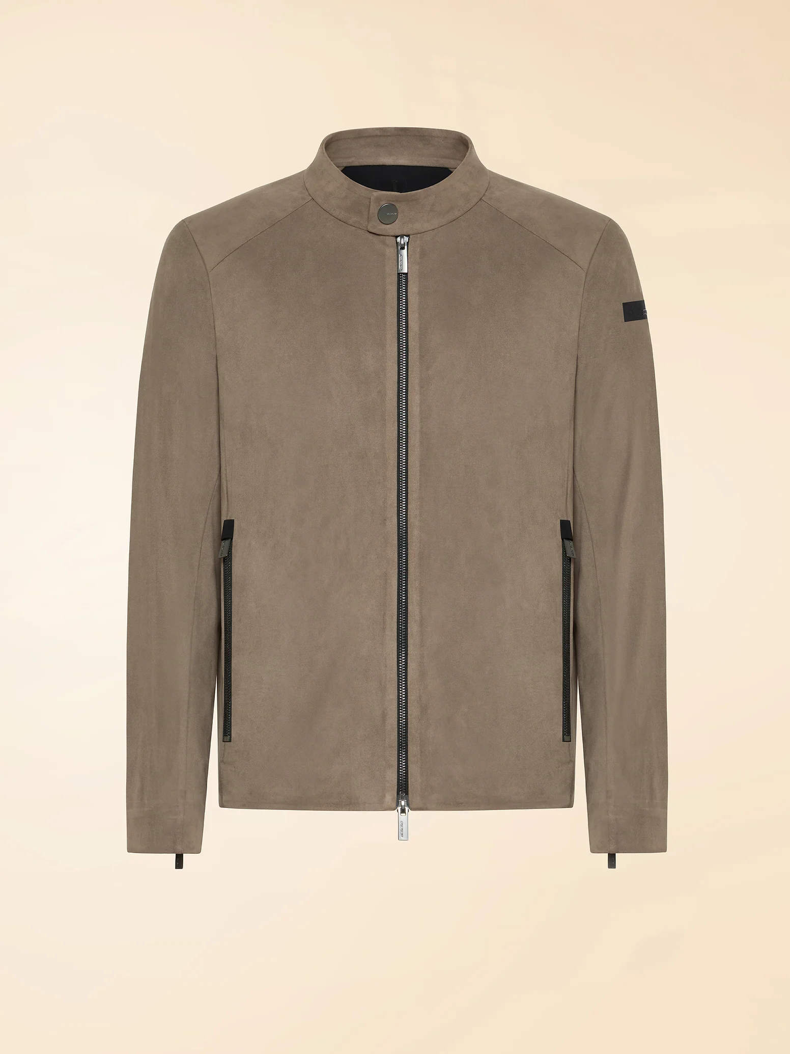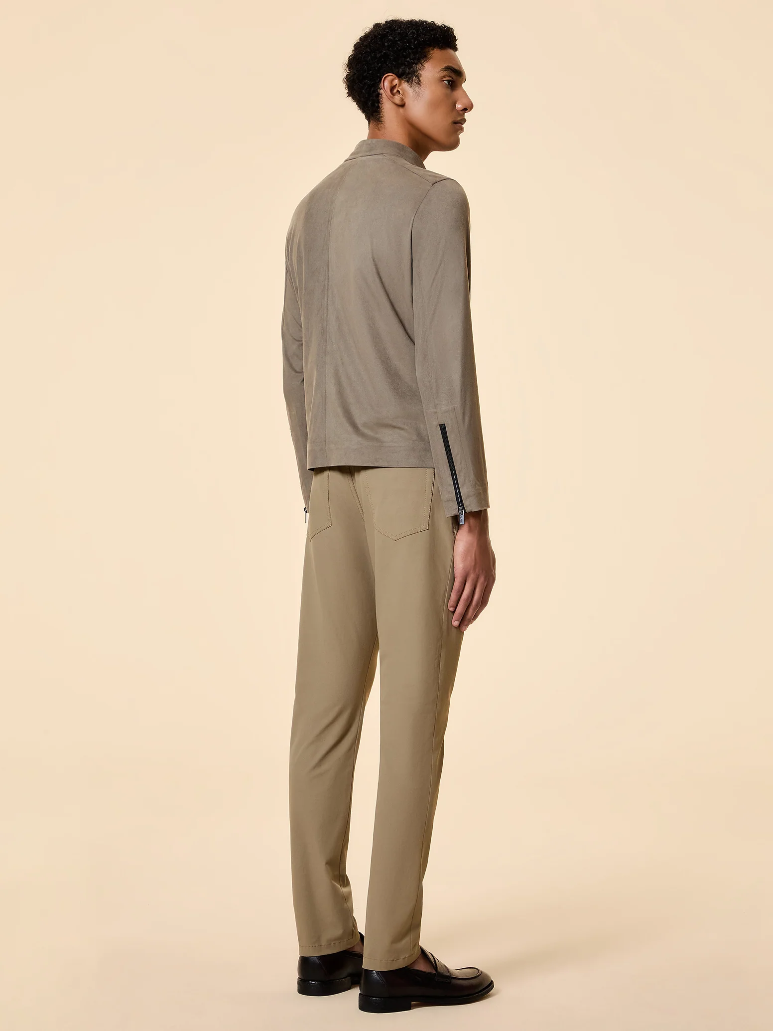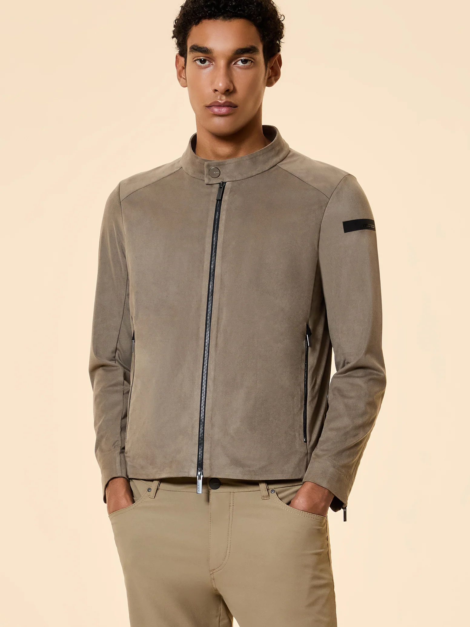 Este estilo de corte regular reinterpreta el encanto atemporal de la chaqueta motera con un toque contemporáneo. Confeccionada en ante ecológico ligero y extremadamente suave, es ideal para entretiempo. El tradicional cuello alto, abrochado con un botón a presión metálico, evoca el auténtico look motero. El cierre frontal con cremallera metálica de doble cursor y los bolsillos laterales con el mismo acabado realzan el carácter audaz de la chaqueta, y la cremallera profunda que cierra los puños le confiere un aire fuerte y sofisticado. El logotipo negro microinyectado en la manga izquierda realza una creación con una personalidad fuerte y refinada. Combina a la perfección con los pantalones de cinco bolsillos de la colección.