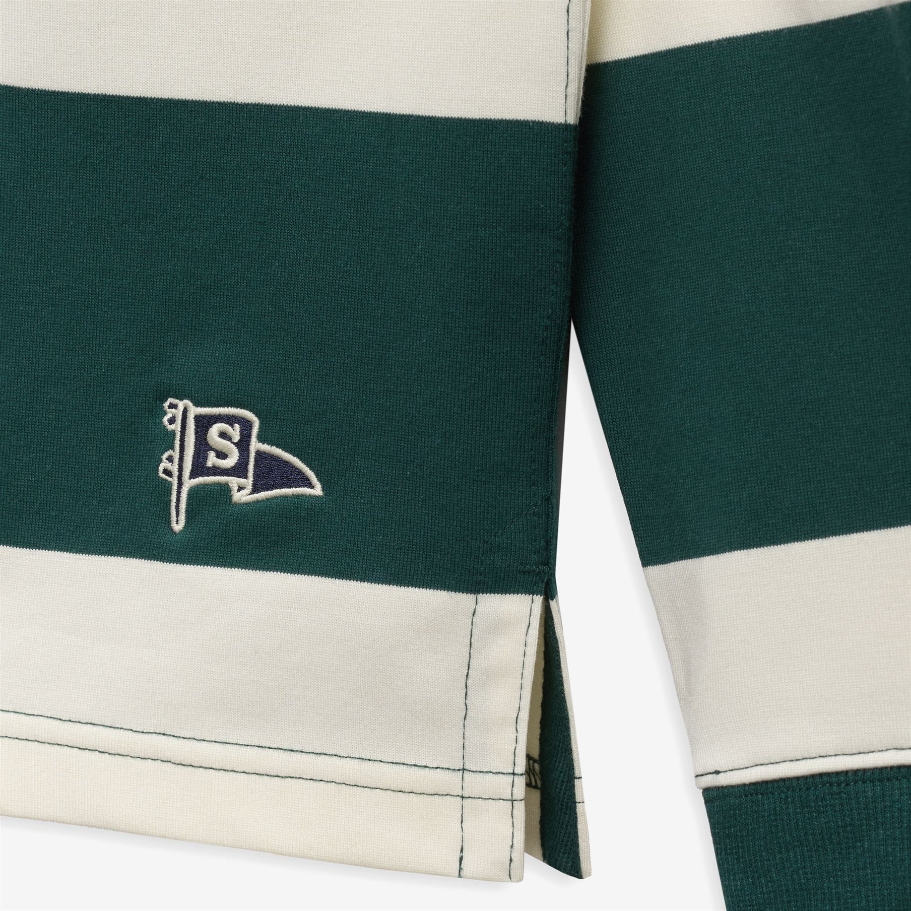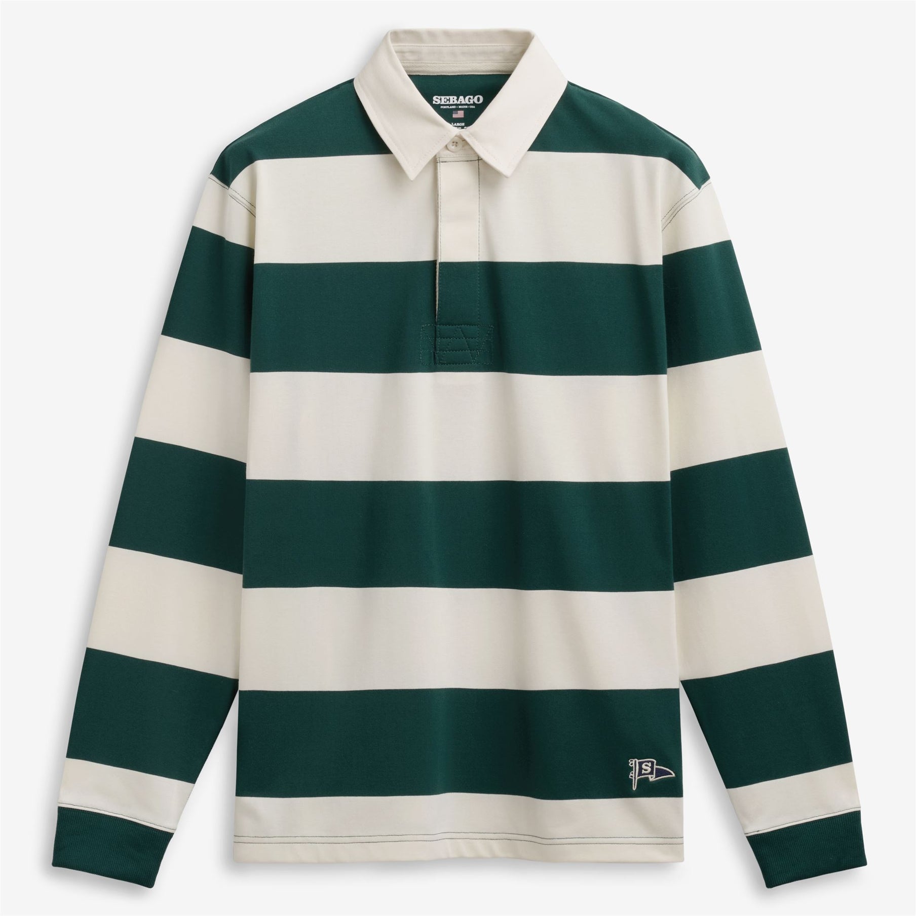 La camiseta de rugby de manga larga, un icono del panorama de la moda deportiva preppy, nació en el campo de juego antes de convertirse en un emblema de estilo atemporal. Campbell reinterpreta la tradición manteniendo todos los aspectos que han construido la prenda hasta convertirse en un clásico atemporal: punto de algodón a rayas, cuello de sarga, tapeta de botones y ribetes de canalé. Acabada con la emblemática bandera de Sebago bordada en el bajo.