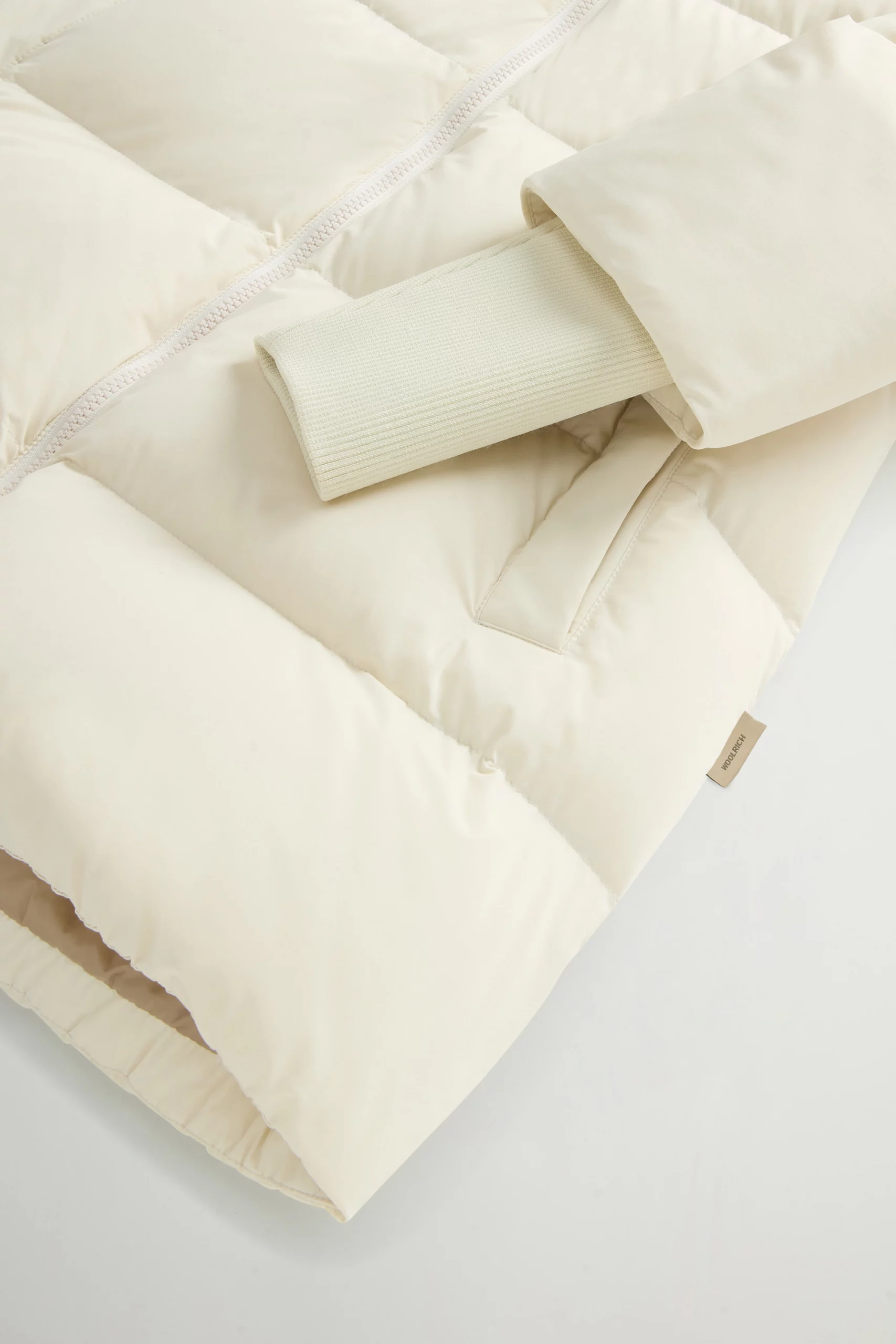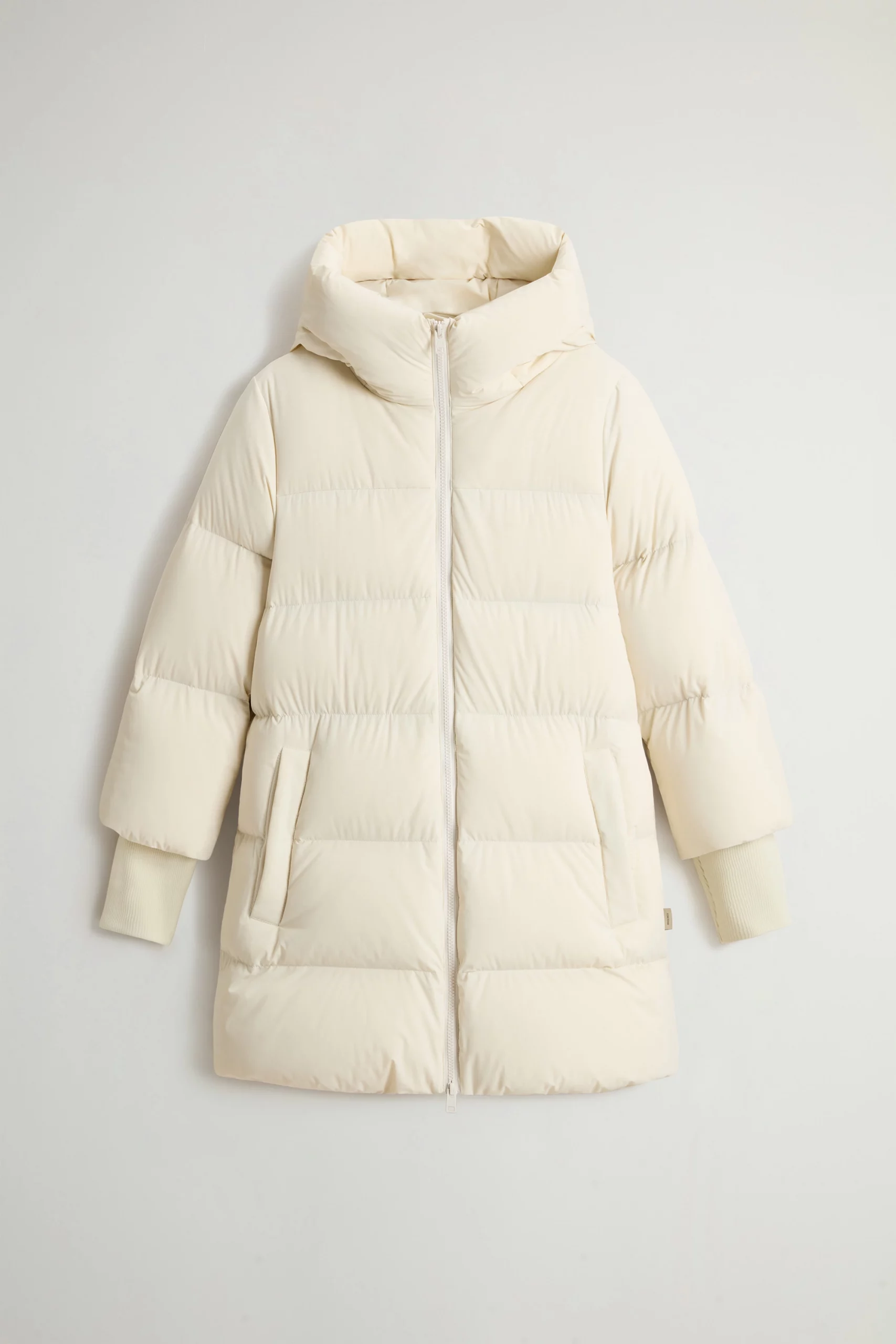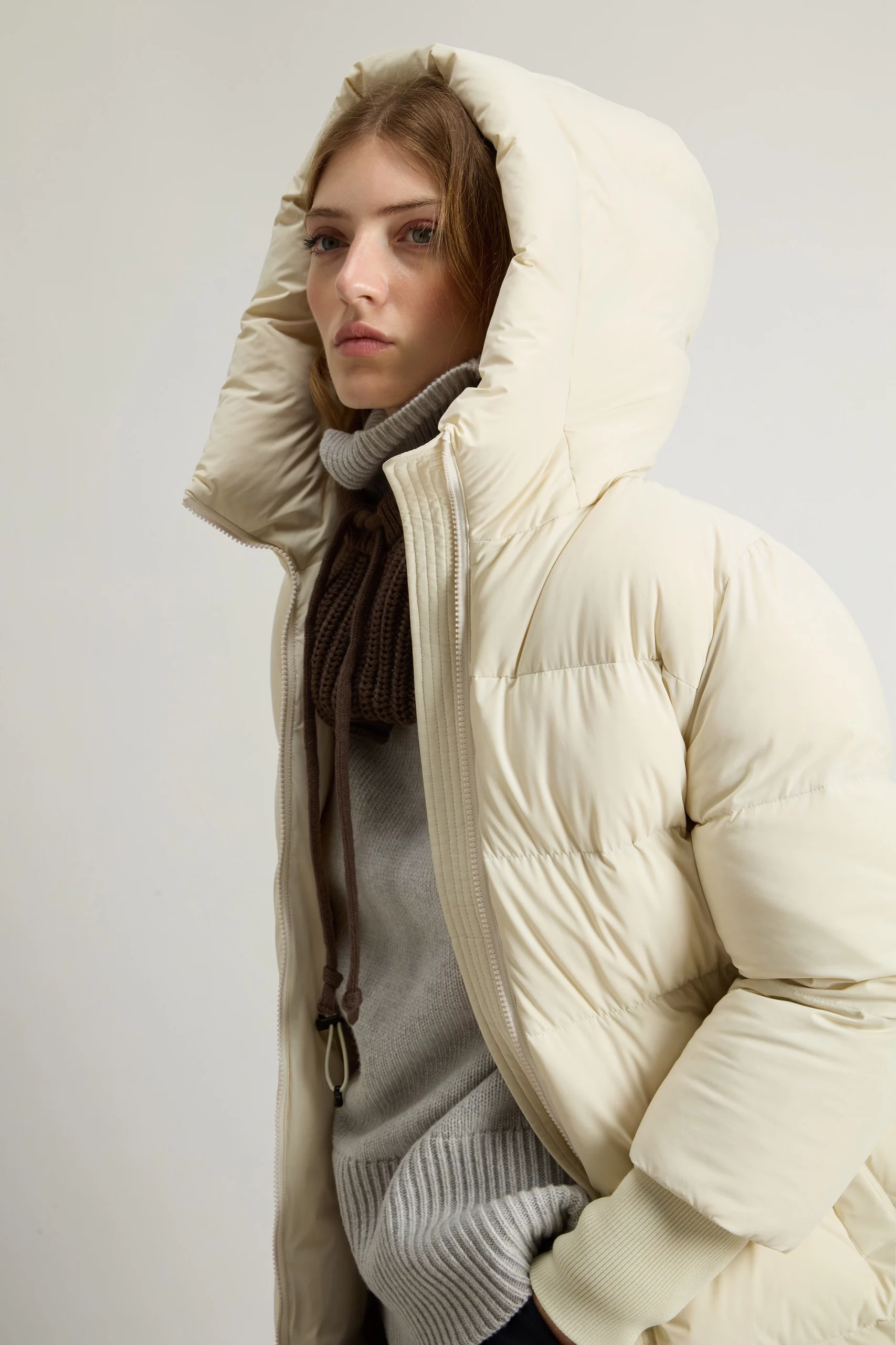 Diseñada para los fríos días de invierno, esta chaqueta de plumón forma parte de la Serie Cloud, la colección cápsula de prendas de abrigo cálidas y ligeras. Fabricada en nailon elástico con un acabado mate, es resistente al agua y al viento, y está acolchada con suave plumón de pato para mantenerte abrigado en exteriores. Cuenta con capucha para mayor protección, cierre de cremallera bidireccional, cordón interior en la cintura y correas interiores que permiten llevarla cómodamente al hombro al entrar en espacios cerrados. Los bolsillos laterales de ribete le dan un toque práctico, mientras que los puños acanalados y la etiqueta lateral completan el diseño.